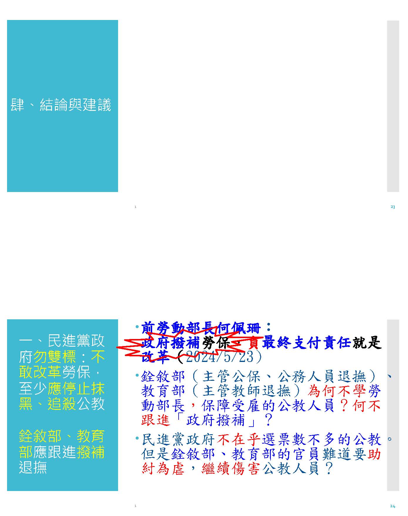 所以最後,我提出幾點建議,第一個是,前勞動部長何佩珊就講,政府撥補勞保負最終支付責任就是改革,我們的教育部跟銓敘部,你們不是來服務公教人員,你們是幫賴政府、幫民進黨政府去砍公教人員的福利,這是什麼道理啊?你為什麼不幫公教人員澄清說你們是受到很多的誤會跟扭曲?對於立法委員提出來說要停砍替代率這個部分,你們不但不講話,還倒過來助紂為虐去說我們公教人員貪得無厭,請教育部跟銓敘部不要再得骨質疏鬆症,這個要趕快去做改善,不要那麼沒骨氣。