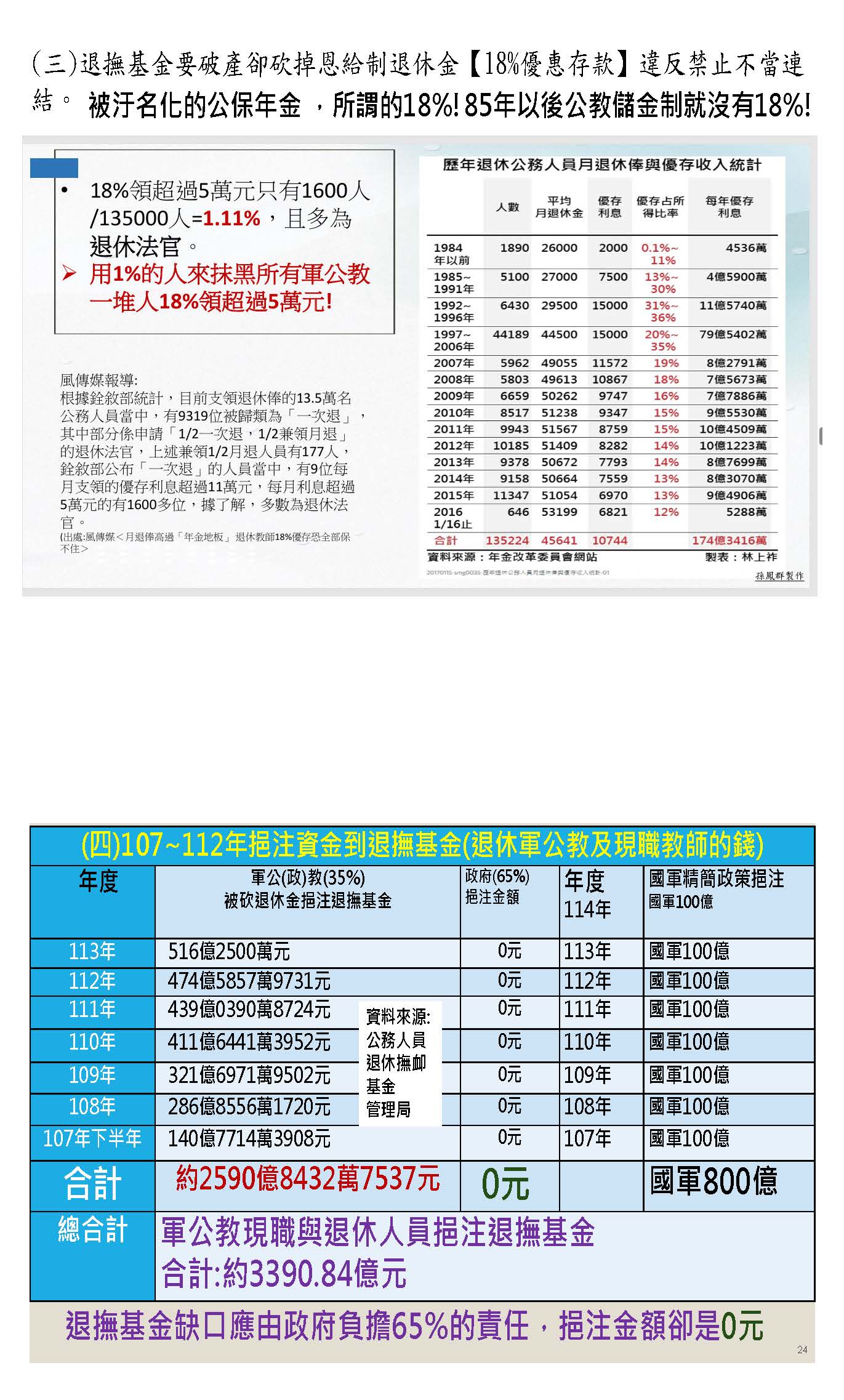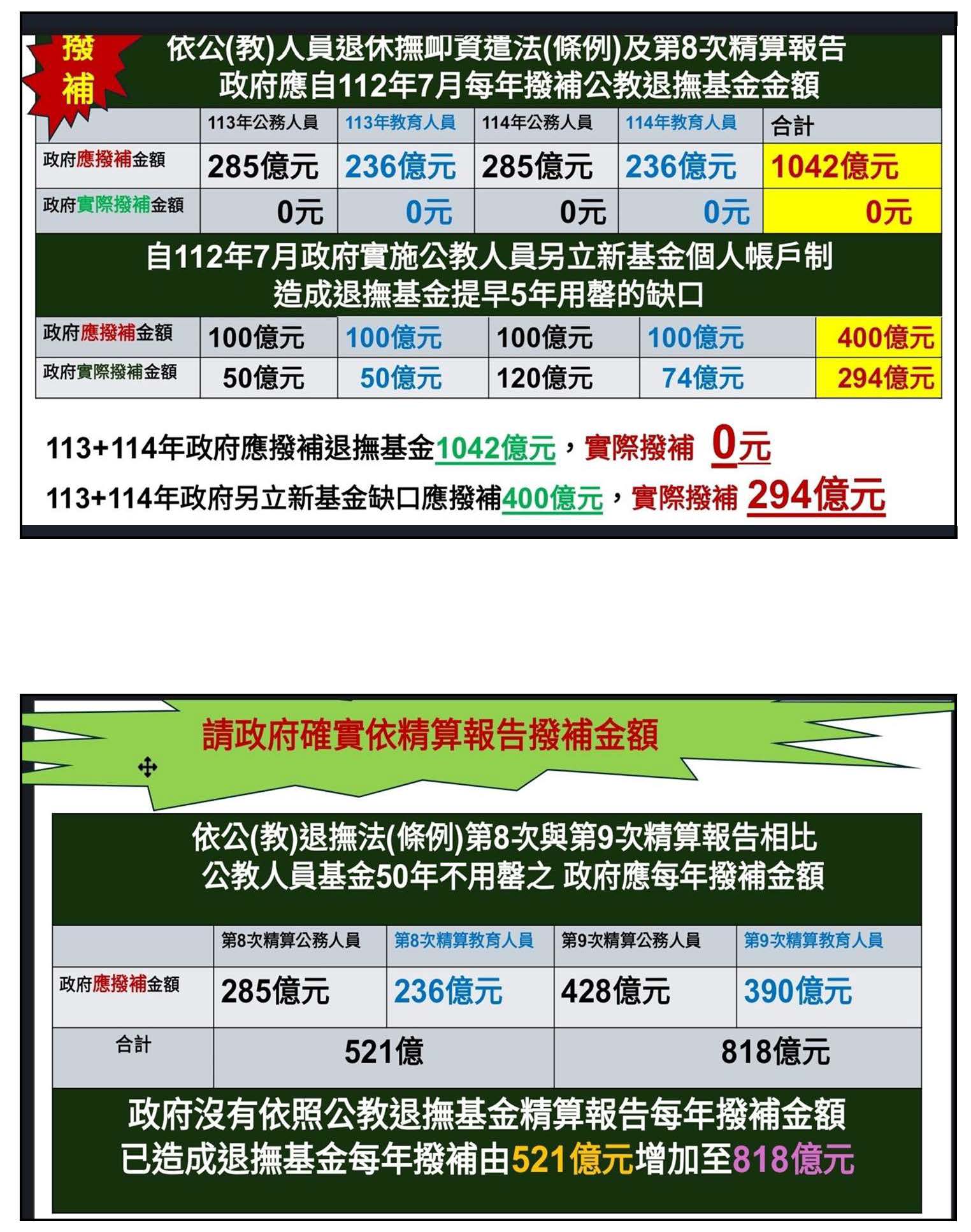 PPT這一張圖看得也很清楚,這都是依照政府自己的資料即退休撫卹資遣法的第8次精算報告,大家可以看到反黃的部分1,042億元,這是政府應該撥補的,政府從113年加114年應該撥補的1,042億元,實際撥補是0元;113年到114年政府另立新基金應該要撥補的是400億元,實際撥補是294億元,也沒有撥補到位。