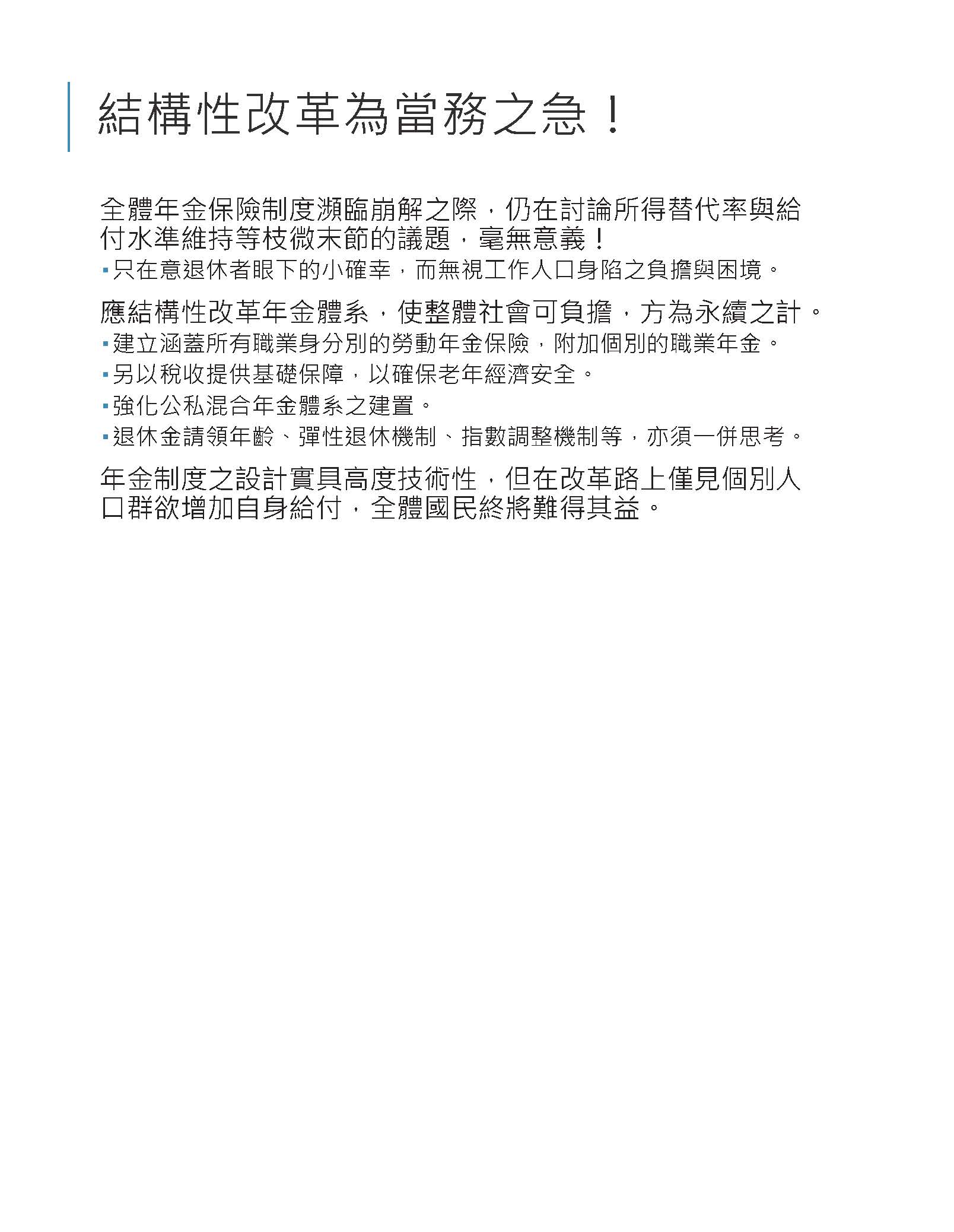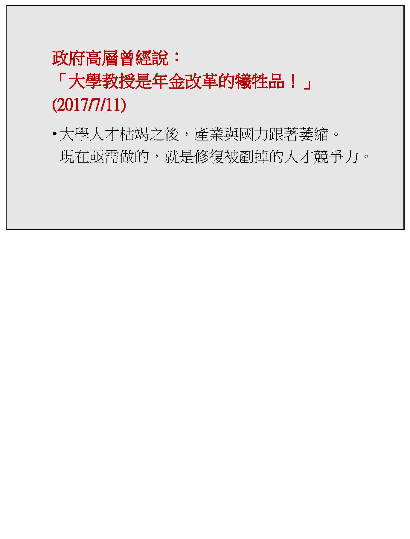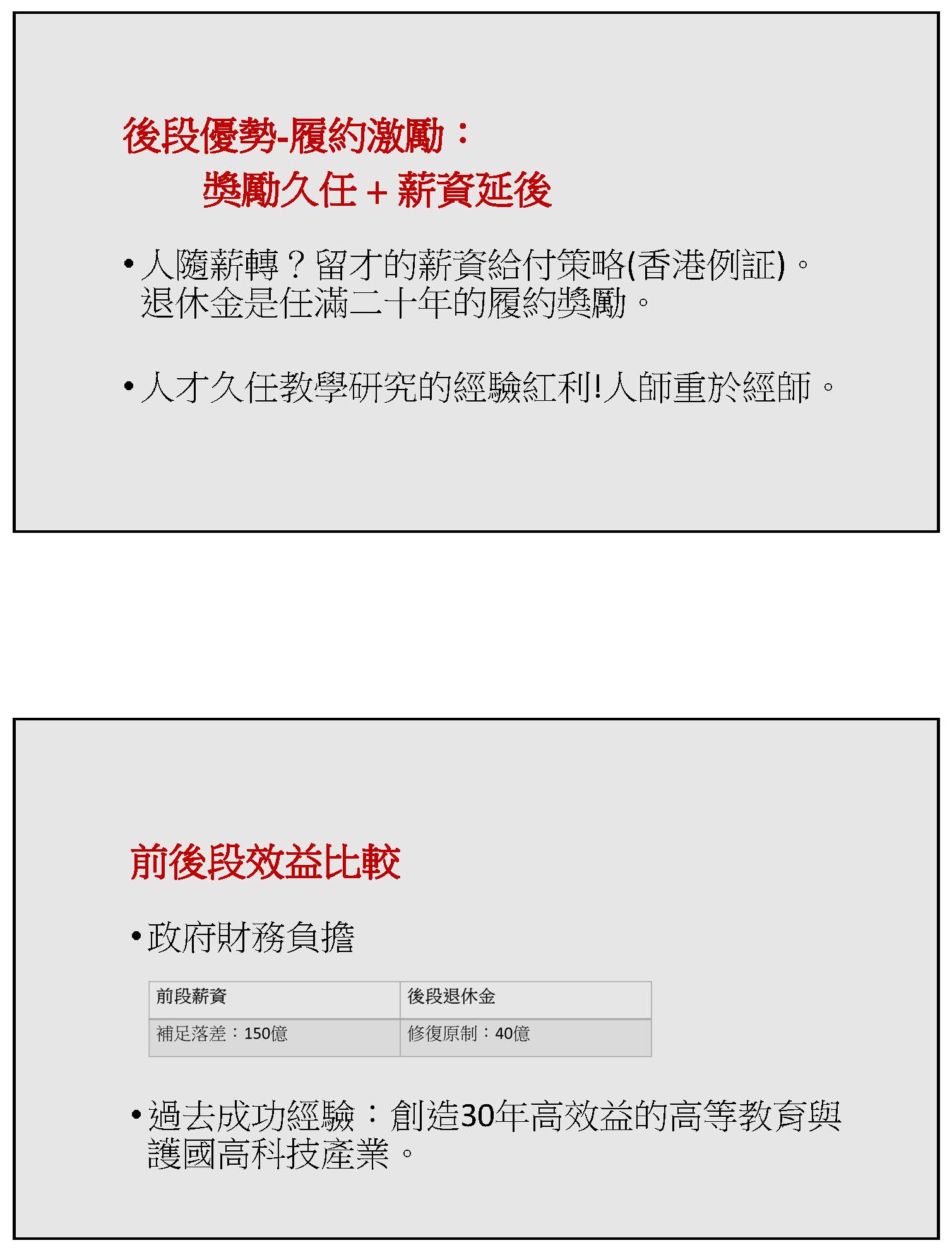 最後,2017年7月11日應該就是在年改的前後,幾位大學校長曾經和政府最高層領導人見面討論這個問題,這位最高領導人說:大學教授是年金改革的犧牲品。這幾個字沒有改造,我想在當時政府要推事關幾千億的年金改革,把事涉幾十億的大學教師退休金如同花草一般剷平可能有它的苦衷,但是在今天新的國際政治、經濟的局勢之下,應該要用大格局重新來省視這個問題,在大學人才枯竭之後,產業與國家一定跟著萎縮,現在我們要做的就是修復被鏟掉的人才競爭力。以上,謝謝大家。