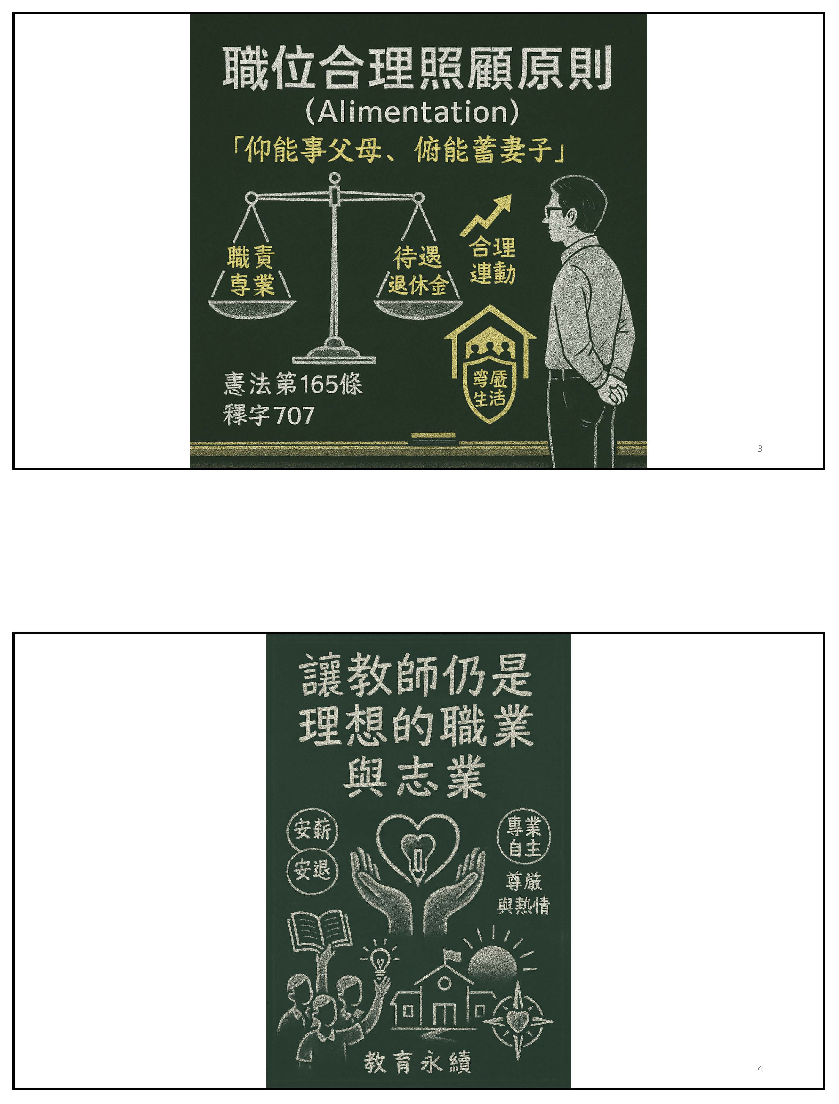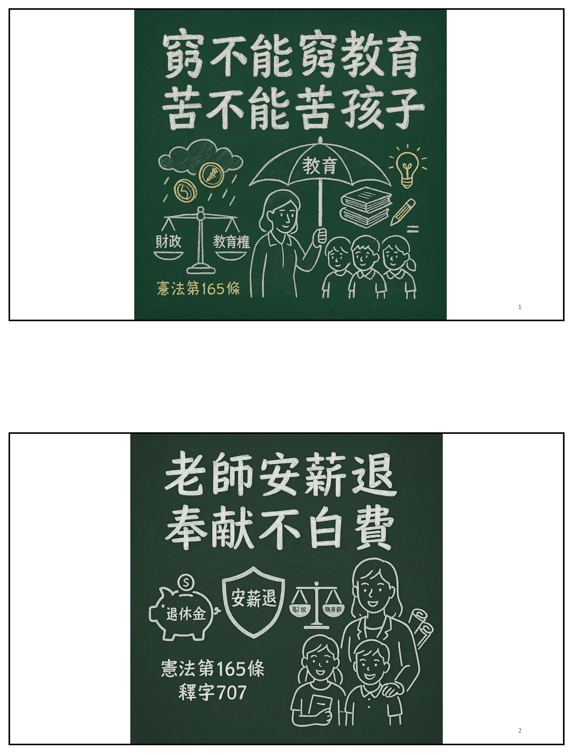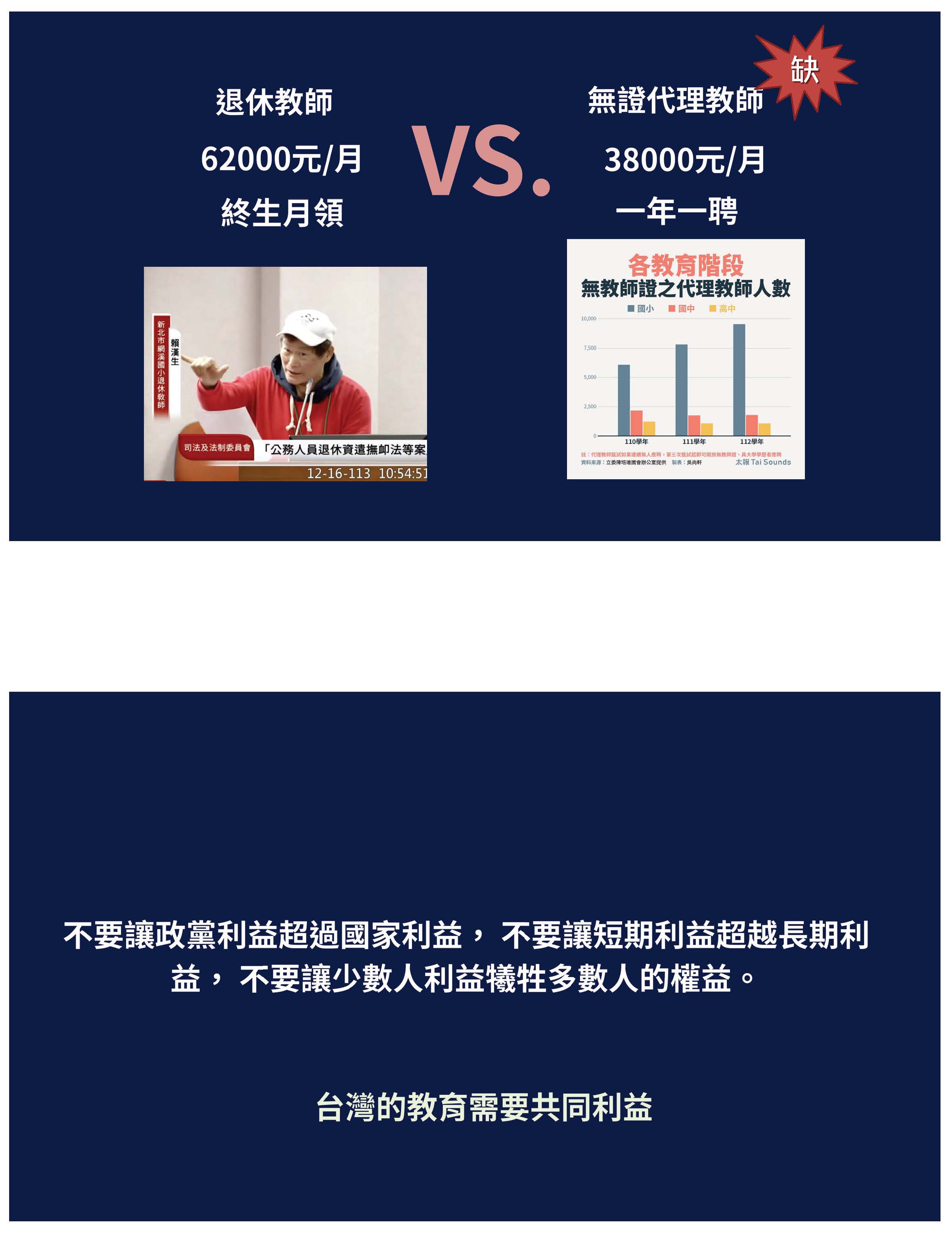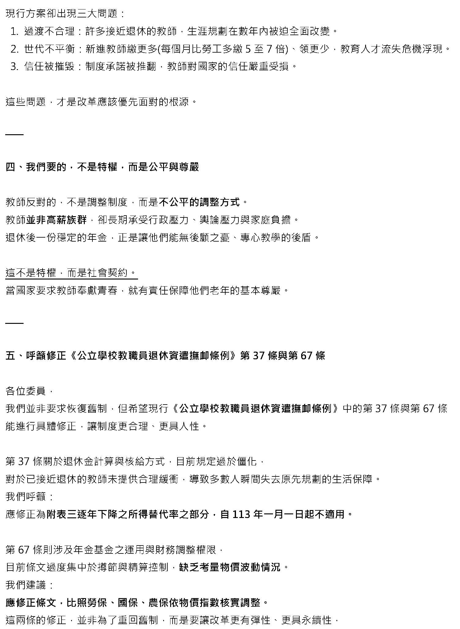 接下來,我們必須回到正題,我們必須沉痛地呼籲,必須要修正公立學校教職員退休資遣撫卹條例第三十七條跟第六十七條。第三十七條應該修正為從113年之後的所得替代率,113年以後皆不適用。第六十七條應該修正條文,比照勞保、國保、農保,依物價核實調整。這時候我們就會思考到這樣的改革不是重回舊制,而是讓制度不會以犧牲教育者為代價,又可以確保財政是穩定的,並且破除那些不合理的謠言。
