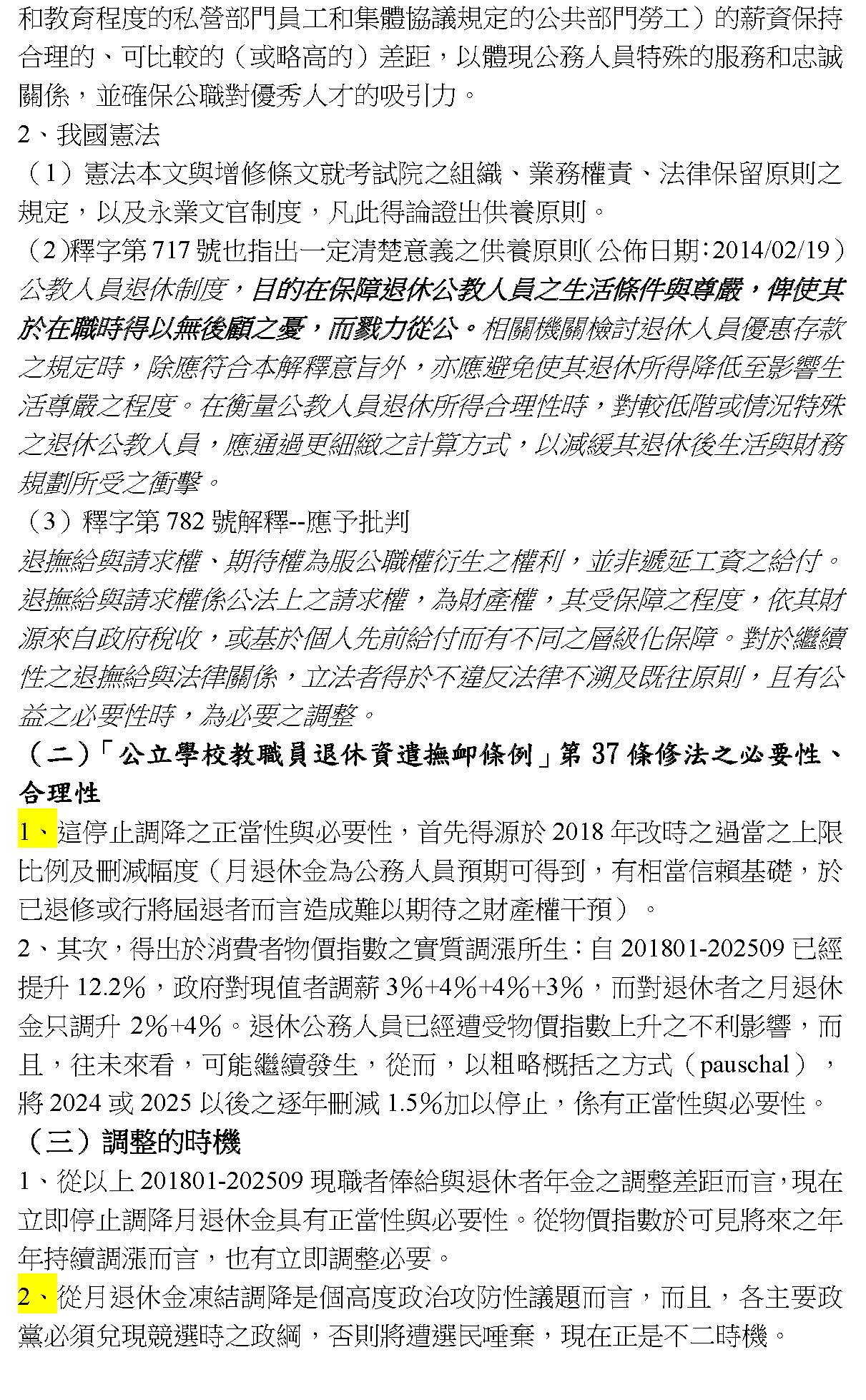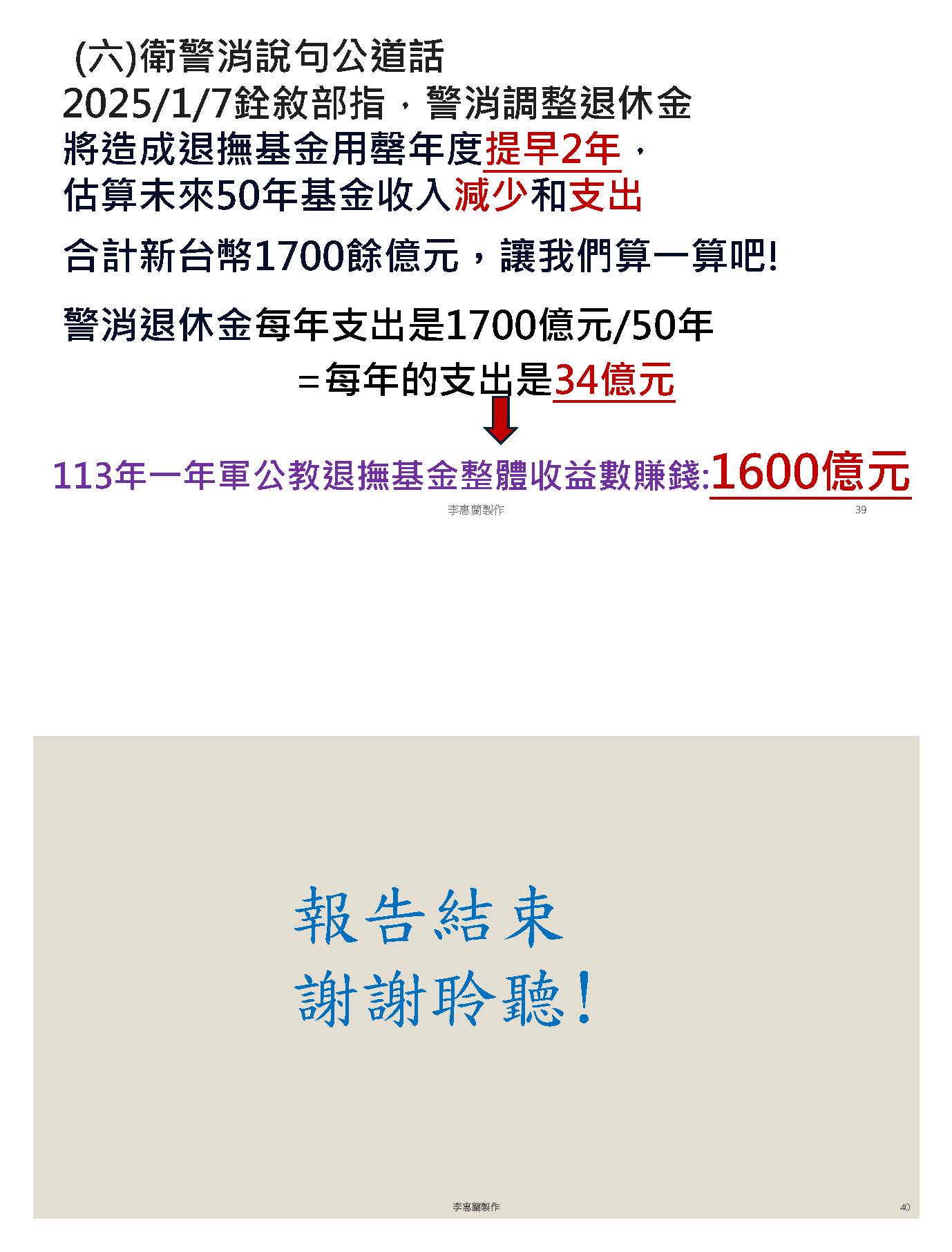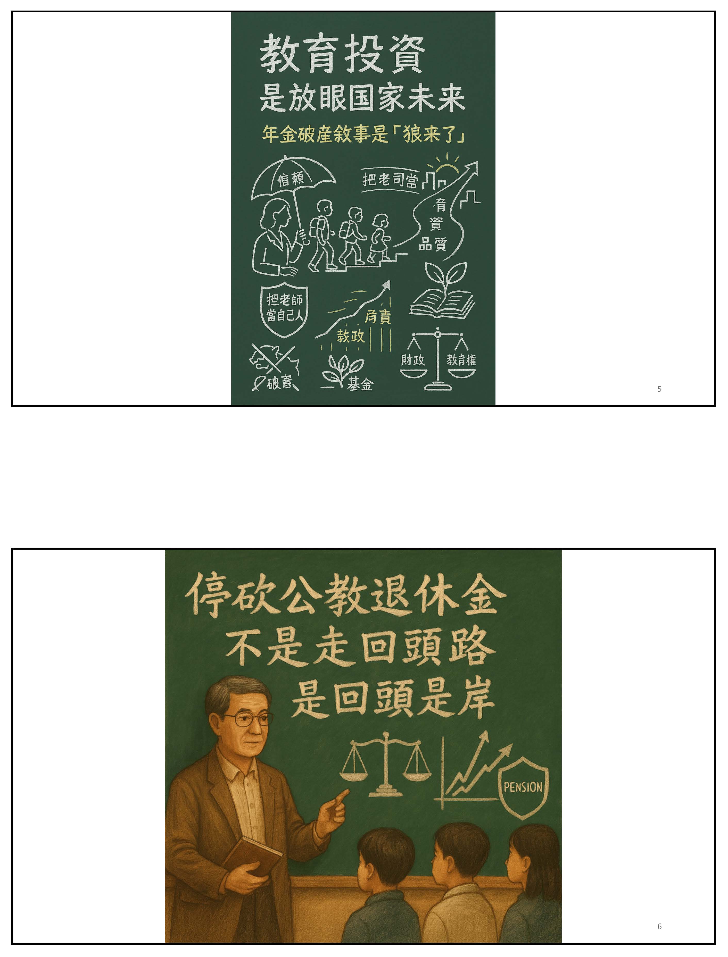 接下來,我們必須回到正題,我們必須沉痛地呼籲,必須要修正公立學校教職員退休資遣撫卹條例第三十七條跟第六十七條。第三十七條應該修正為從113年之後的所得替代率,113年以後皆不適用。第六十七條應該修正條文,比照勞保、國保、農保,依物價核實調整。這時候我們就會思考到這樣的改革不是重回舊制,而是讓制度不會以犧牲教育者為代價,又可以確保財政是穩定的,並且破除那些不合理的謠言。