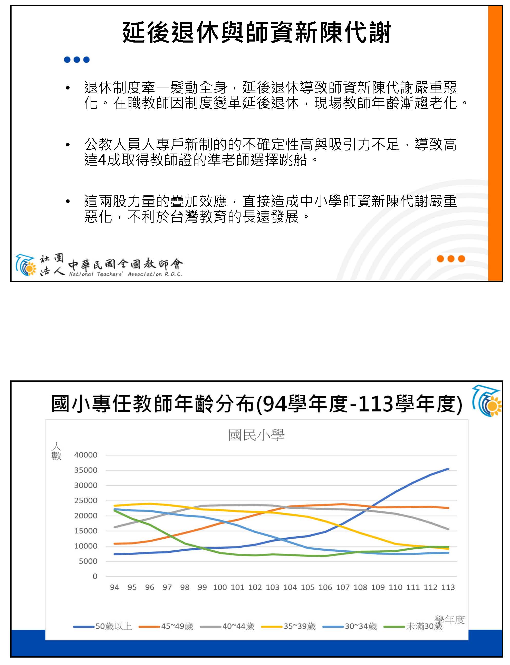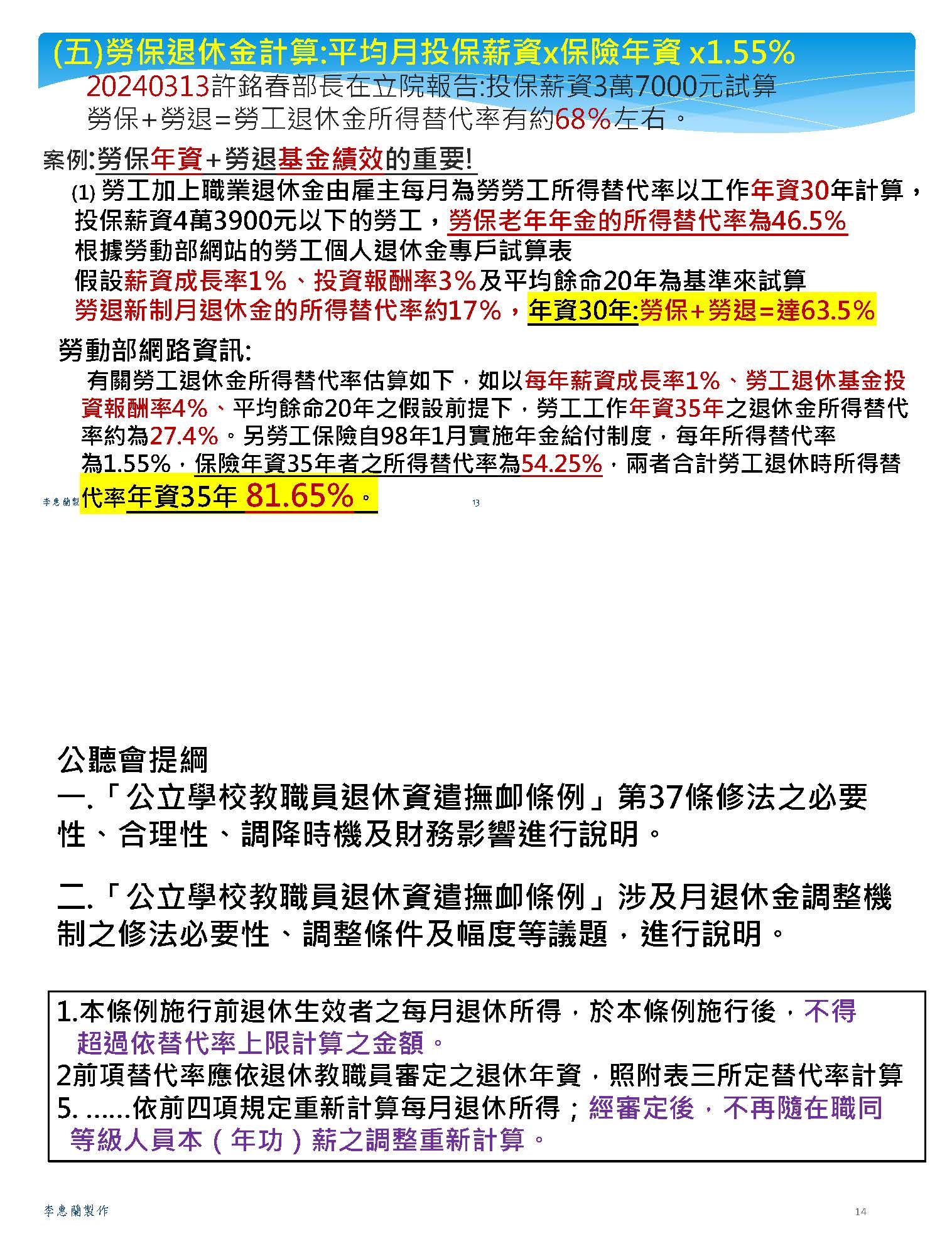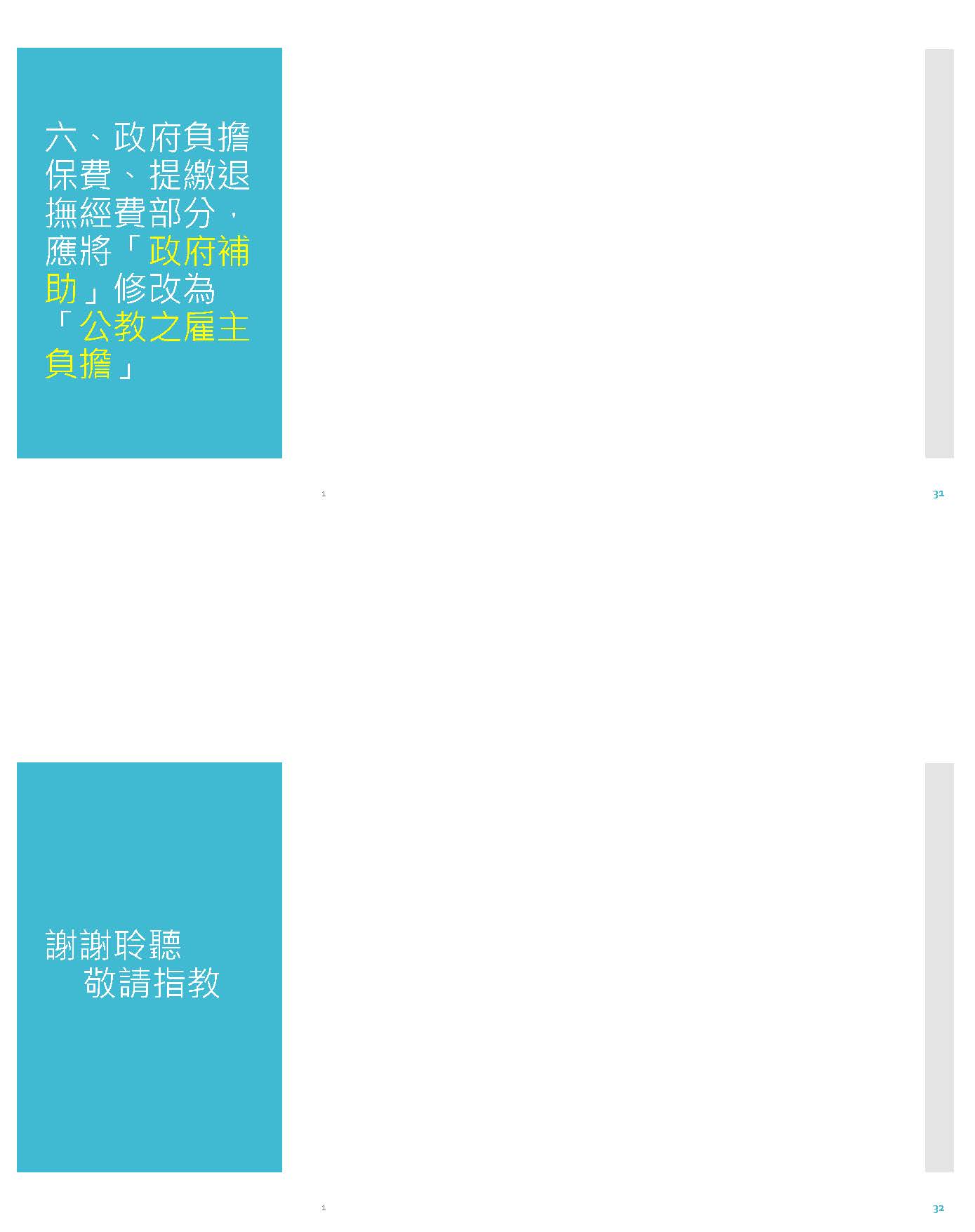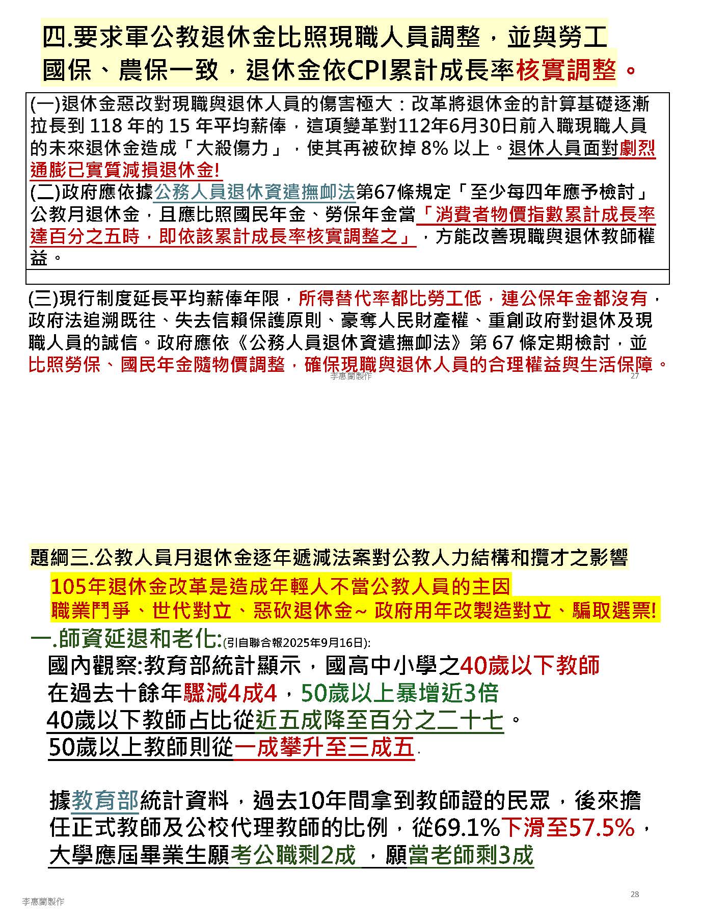 接下來,我們必須回到正題,我們必須沉痛地呼籲,必須要修正公立學校教職員退休資遣撫卹條例第三十七條跟第六十七條。第三十七條應該修正為從113年之後的所得替代率,113年以後皆不適用。第六十七條應該修正條文,比照勞保、國保、農保,依物價核實調整。這時候我們就會思考到這樣的改革不是重回舊制,而是讓制度不會以犧牲教育者為代價,又可以確保財政是穩定的,並且破除那些不合理的謠言。