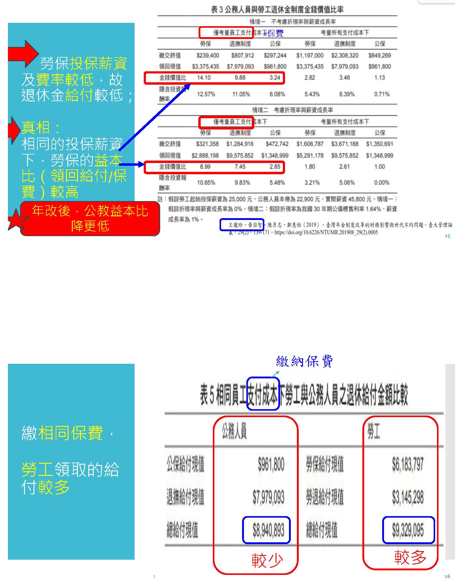 所以政大風管系王儷玲跟黃泓智教授就拿公保跟勞工退休金比較結果發現,勞保投保薪資費率較低,所以他退休金給付當然較低。真相是什麼呢?在相同的投保薪資下,勞保益本比,就是他領回的給付除以繳的保費是相對的高,像各位可以看到上面紅色框框裡面,可以看到投保薪資繳相同保費的勞保可能是24萬左右,但他可以領回到330萬,所以投資報酬率或益本比是14倍,而退撫制度只有不到10倍;再看另外的情境也是一樣,勞保的益本比都是比公教高,而且年改之後公教的益本比降得更多了。