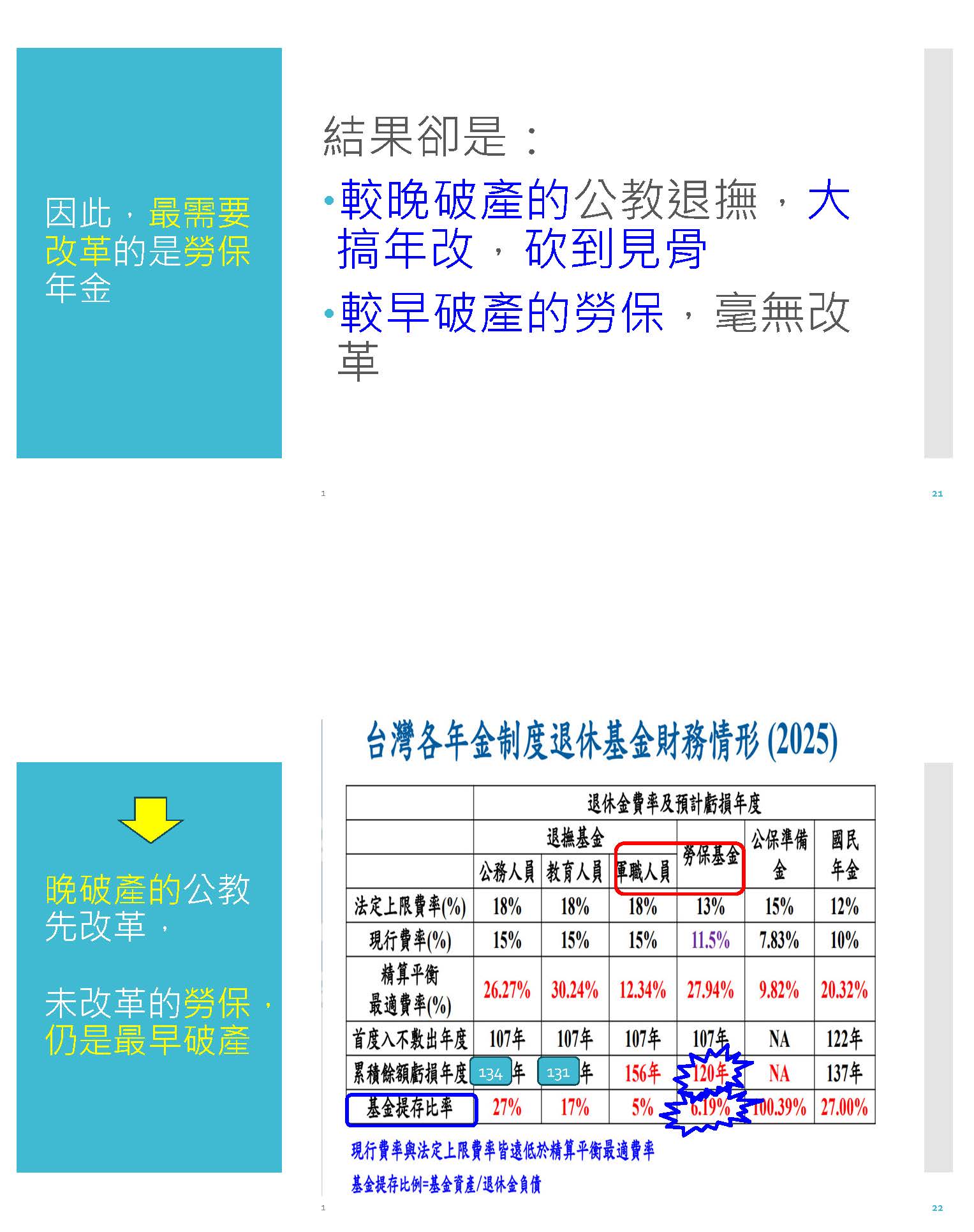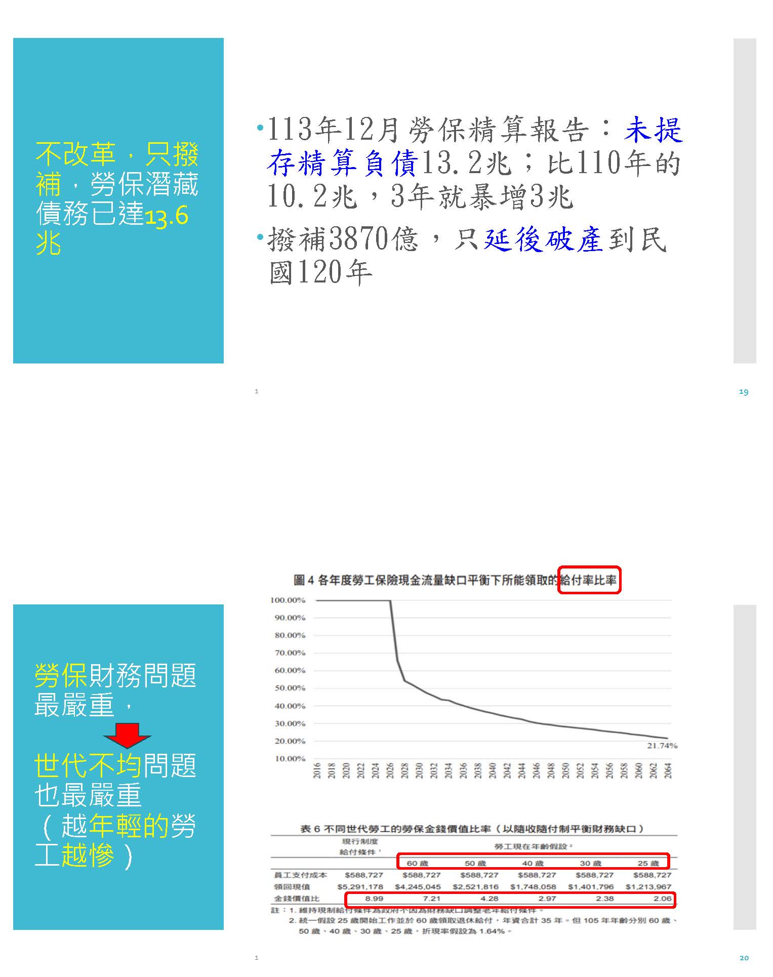 所以最後的結果,我們可以看到勞保的財務問題不但嚴重,而且世代不均,它內部的世代不均問題更嚴重,我希望張理事長特別注意一下,就是說你們很在乎的世代不均在勞保的體系裡面更嚴重,其實在這方面也都發生。然後結果就是什麼?最需要改革的是勞保年金,但是較晚破產的公教退撫大搞年改,砍到見骨,而較早破產的勞保體系完全沒有改革,所以最後這個表就看到,勞保120年就要破產了,其他所有的退撫制度都是幾十年後才會破產,現在要幫公教人員停砍替代率,這有什麼不對?