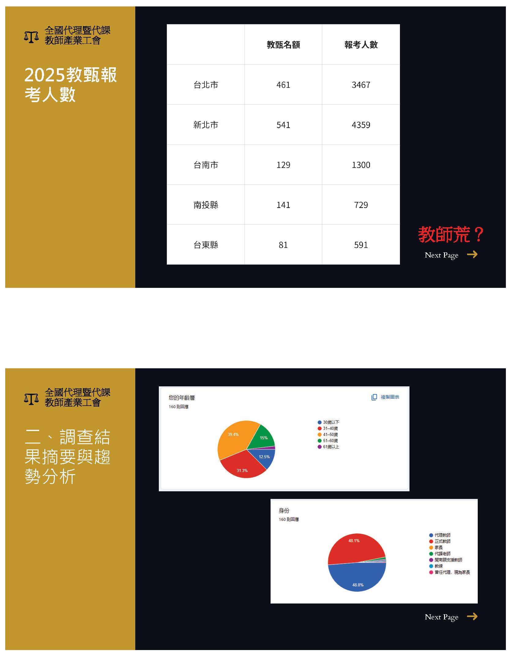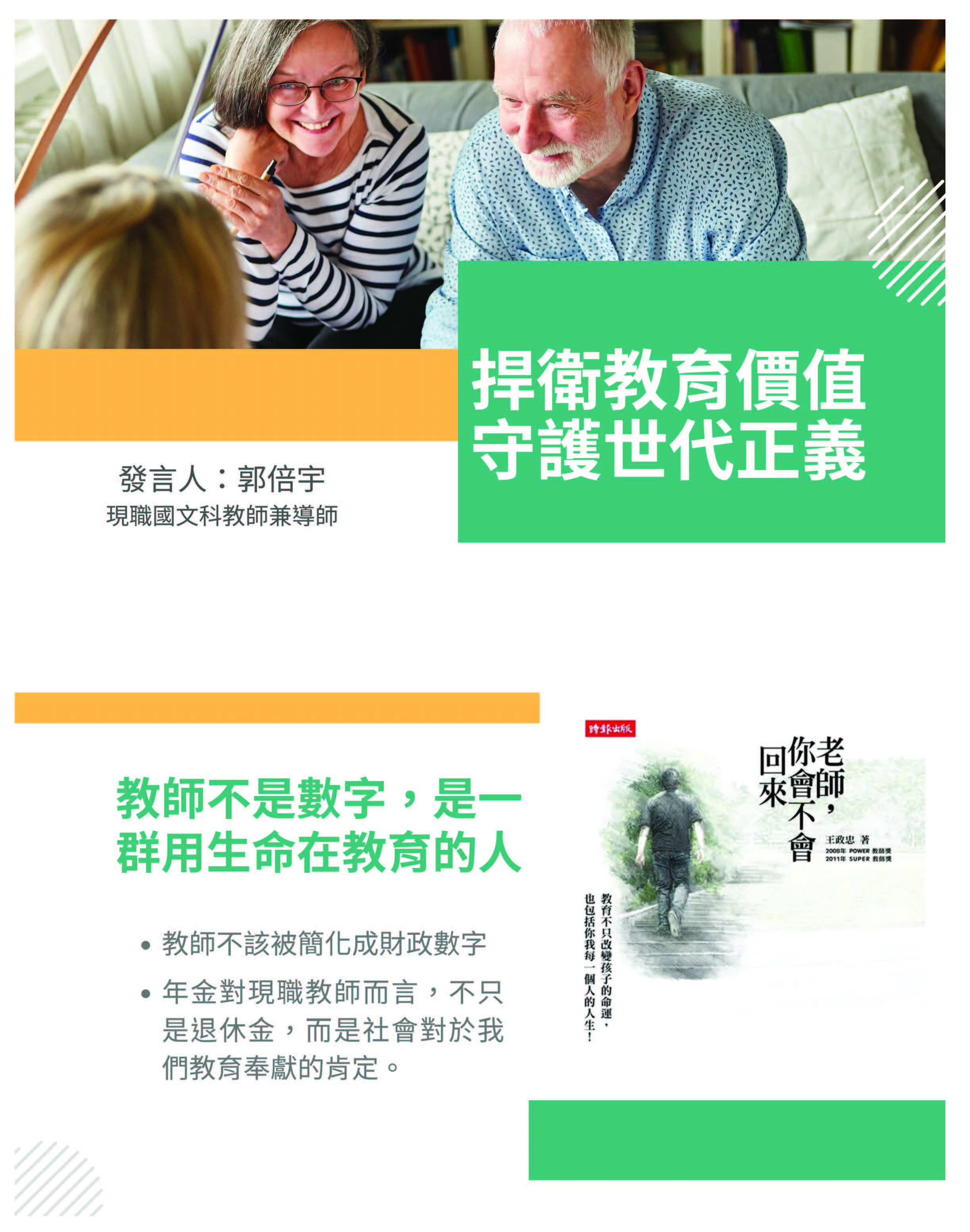 我覺得這樣的改革,其實對我們第一線的教師來說,是從青春奉獻到白髮,其實投入的不是只有時間,而是一生的熱情跟理想。大家可以看到簡報上的這張圖片,之前還甚至翻拍過電影叫「老師,你會不會回來」,這是臺灣唯一一個奪過臺灣三大教師獎,SUPER 教師獎、POWER教師獎跟師鐸獎的王政忠老師。這位老師目前在南投市的中寮鄉爽文國中任教,他當初派到這間學校的時候,他打算退伍就離開這間偏鄉的學校,這間學校的學生學習意願極為低落、資源極差,他就覺得恨不得想要離開,接著921大地震,學生只問他一句:老師,你會不會回來?他動搖了,他決定要為了這些小孩子努力。這本書裡面我印象最深刻的一句話,政忠老師說:透過教育,讓沒有資源、沒有機會的孩子,享有公平的對待,進而有翻身的機會。這樣的政忠老師,他甚至在去年2024年8月發文表示他們的爽文國中,目前也面臨了無人報考代理教師的窘境,他們的英文有17招、數學34招,招不到老師的狀況之下,他直指第一個關鍵,是不是教師的整體薪資結構跟不上社會變遷?這是非常嚴重的,所以年金對於現職教師而言,不是只有退休金這麼簡單,而是社會對我們教育奉獻的肯定。