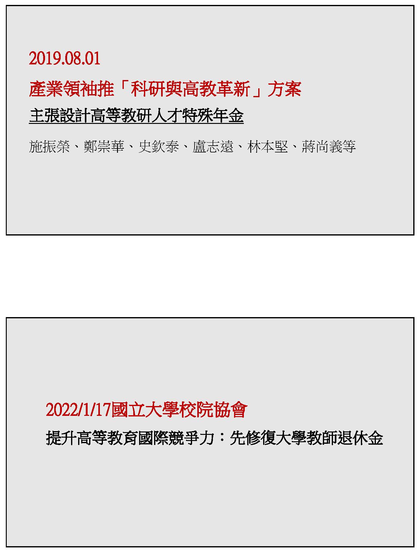 這個問題在2019年有十幾位產業領袖包括施振榮、鄭崇華、史欽泰、盧志遠、林本堅、蔣尚義等等,他們推出一個科研與高教革新方案,其中有幾個作法,特別值得注意的是,他們明確的提到主張設計高等教育人才特殊的年金,點出了這些問題對於人才策略的關鍵重要性。在3年前,國立大學校院協會大概有50所國內所有的國立大學經過廣泛的討論,也提出來提升高等教育國際競爭力,最重要的是要先修復大學教師的退休金,何以見得為什麼產學界都對這件事情不約而同有類似的共同見解?因為大家都看到大學教師是一個特殊的族群,他是國際爭取的流動資產,一個國家可能會有優秀的軍事人才、政治人才,但是不論是多傑出的將領、部長、官員都不可能被另外一個國家邀請去做將領、部長、官員,但是大學教授是完全可能,而且是經常在不斷地進行,特別現今是知識經濟的時代,它的生產要素之重要性已經逐漸超越資金和土地等等,知識經濟的核心在大學,因為大學是知識的油井、知識的源泉,創造新的知識、傳遞原有的知識。這些人的核心是大學教授,他的重要性在知識經濟是與日俱增,也是國際在增強的重要資本。