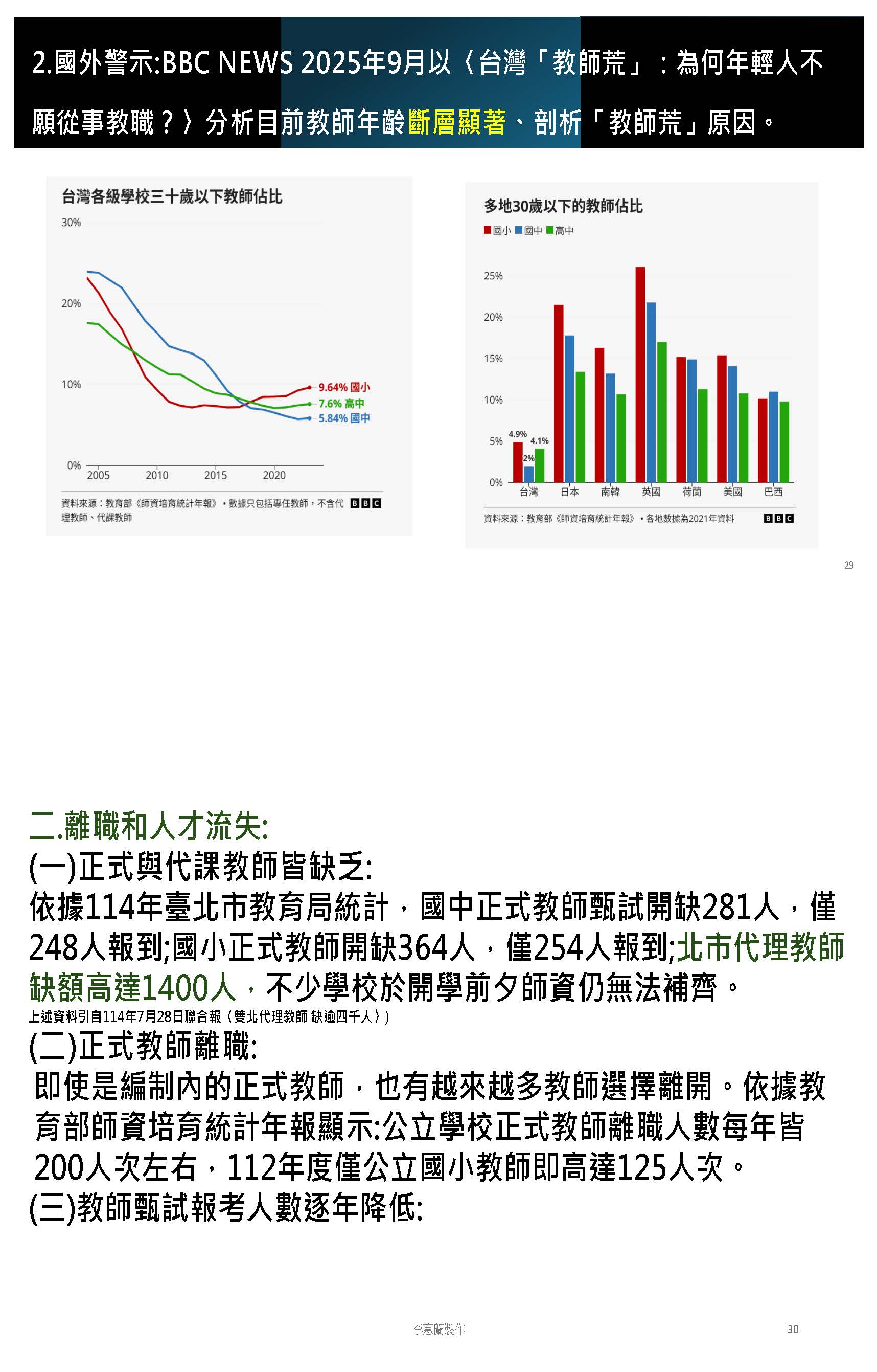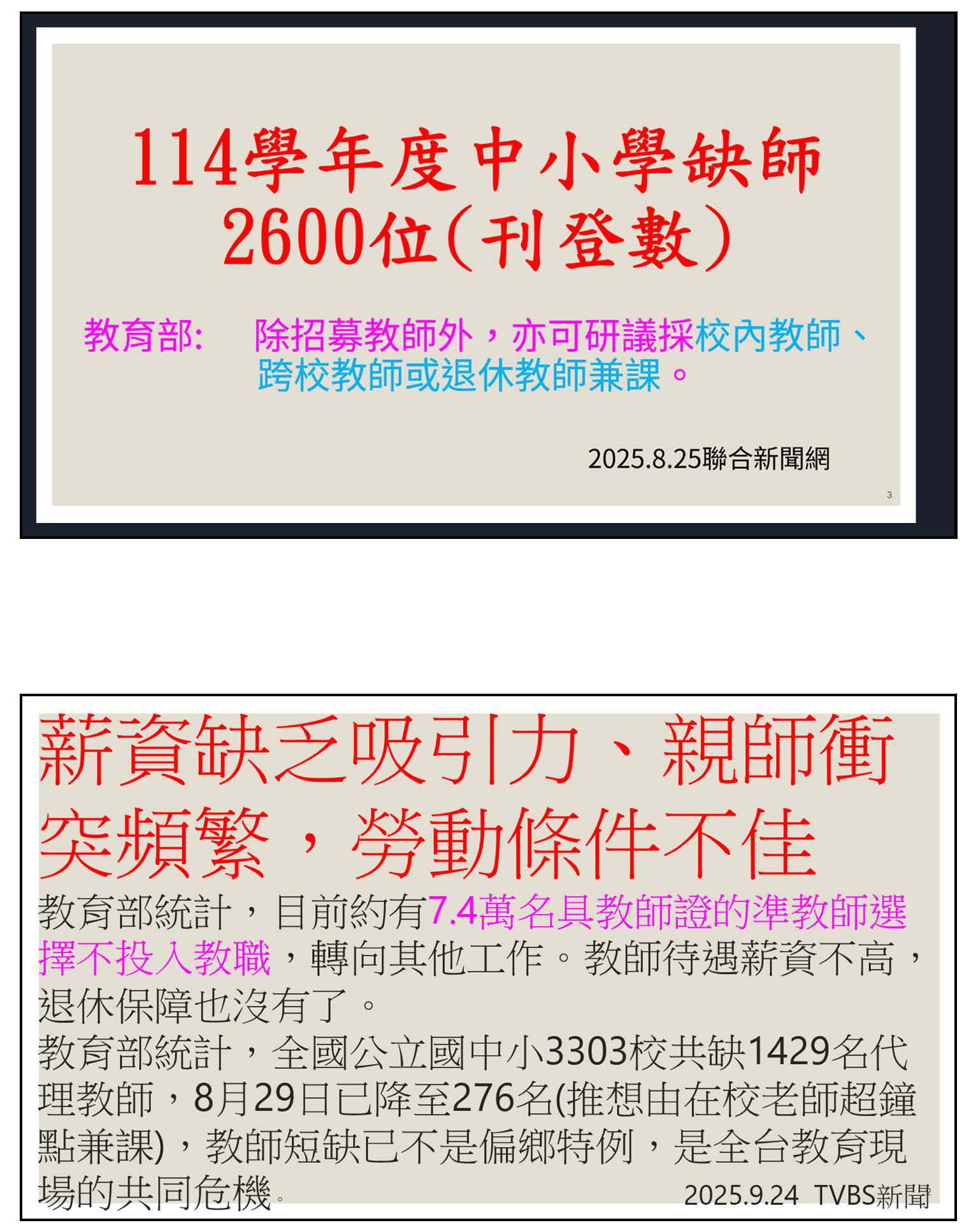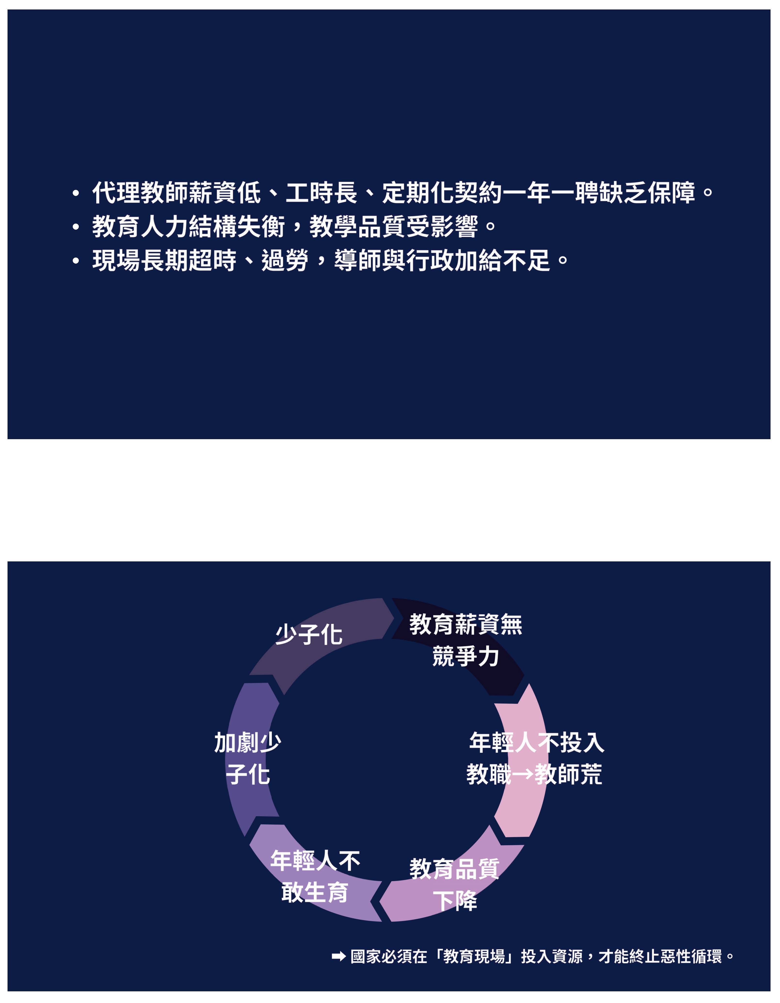 接下來我要表達的是這兩則新聞報導,大家應該非常的常見,「教師荒蔓延全臺!7.4萬準教師棄教職原因曝光」,紅圈處就是最主要的關鍵,薪資缺乏吸引力、勞動條件不佳,甚至是待遇偏低、行政工作負荷繁重,其實跟很多勞工比起來,我們並非高薪的族群,但我們承受了非常多的行政壓力,優質化人才基地、技藝教育公開授課,甚至是學習歷程檔案,越來越誇張的校事會議,老師動輒得咎,這樣子的壓力,對於我們這些年輕人來說,只會讓我們想要離開。