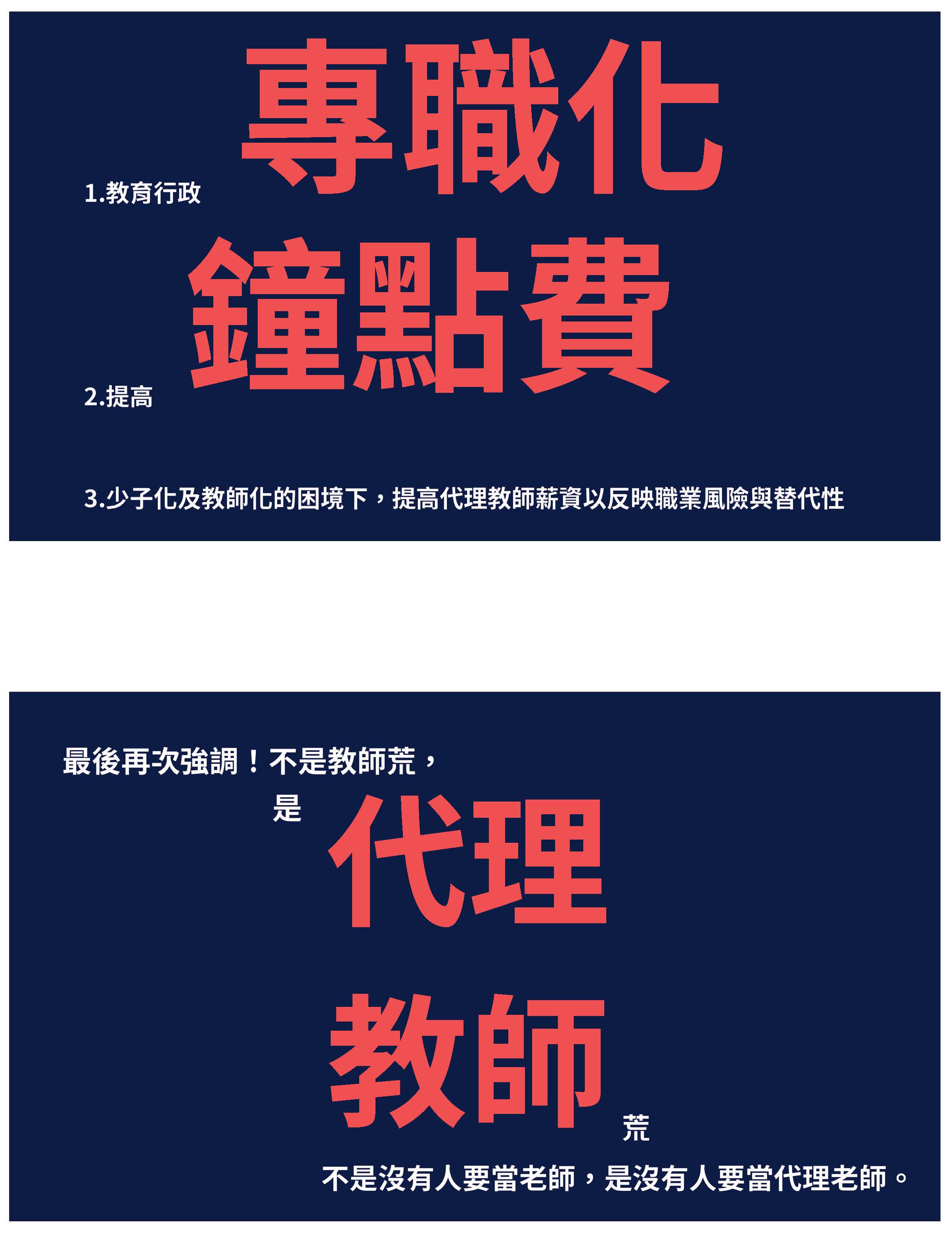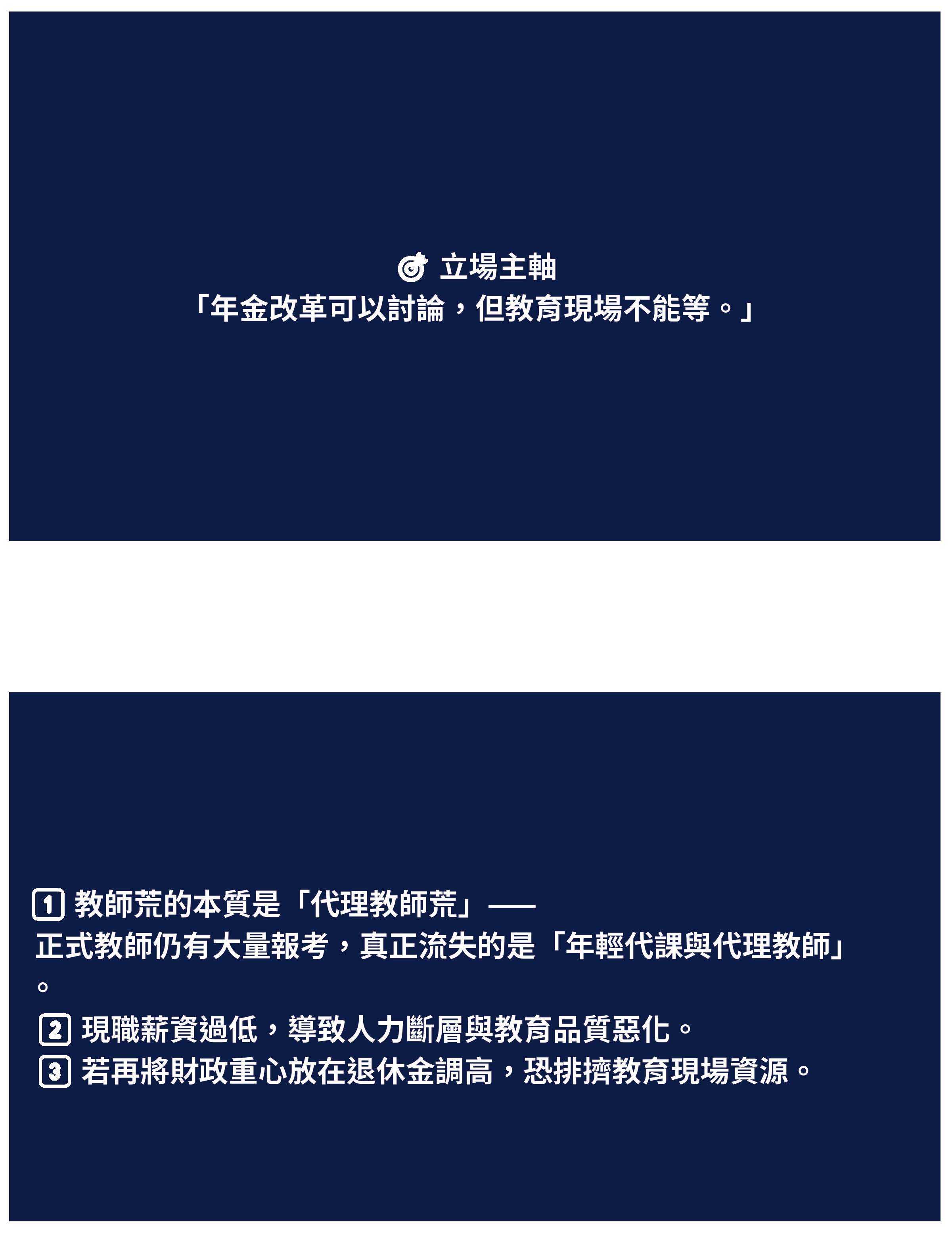 大家可以看到,教師不是數字,是一群用生命在教育的人,我覺得我們教師不應該被簡化成財政的數字,我們在所有的文件上看到的都是滿滿的數字,15年均俸、所得替代率、財務缺口,但這些數字的背後,大家是不是有看到一個在半夜默默地改週記、改作文的老師?大家是不是有看到下班以後,還在跟家長聯繫的老師?大家是不是有看到自掏腰包獎勵學生的老師?就像我的學生都直接跟我說:老師,你的導師費都是負成長。我說沒錯,因為我導師費拿來全部自掏腰包,贊助我們學生的比賽獎金。