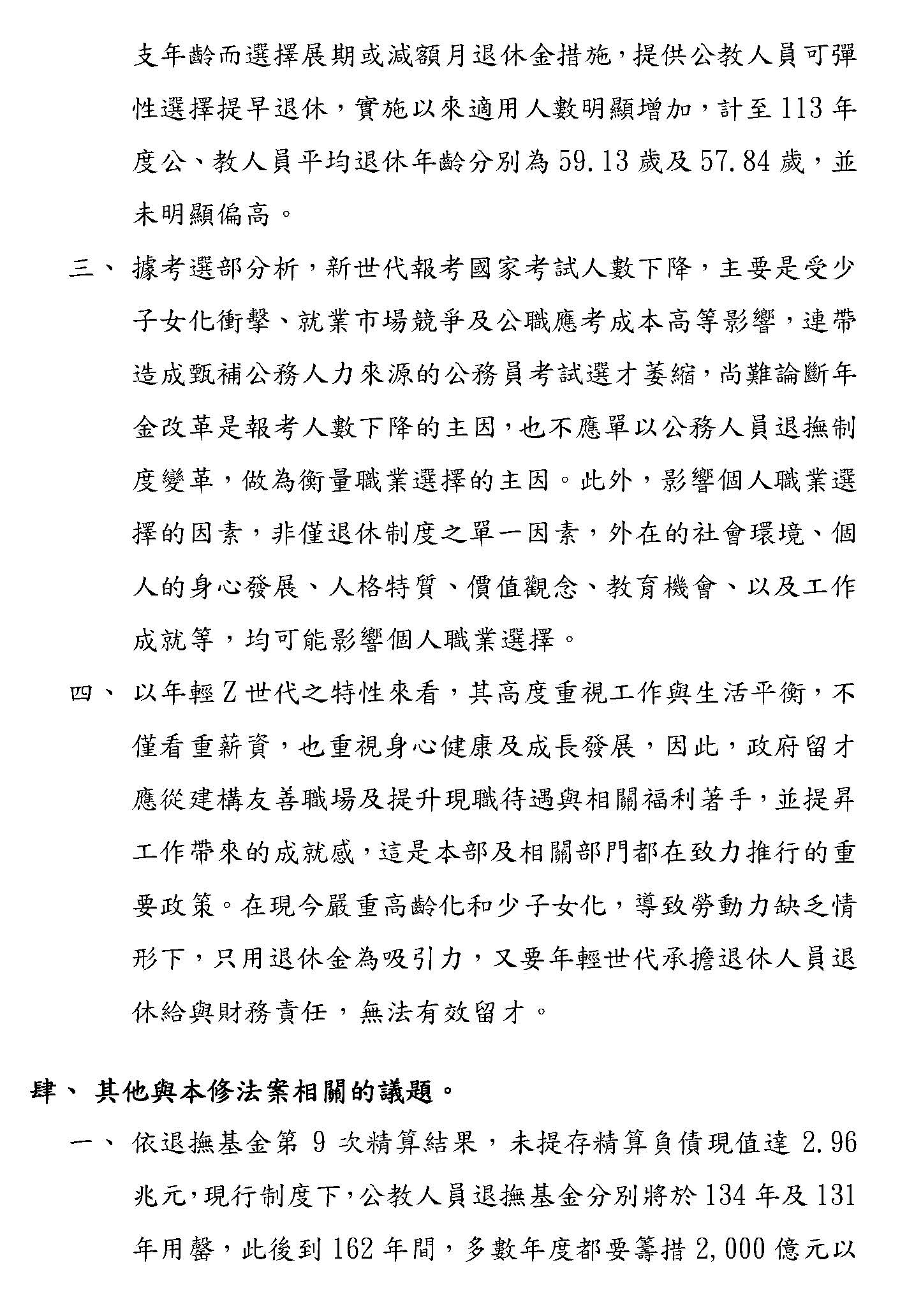 年金修法的三大目標是:第一,要阻止文官體系的崩潰;第二,要爭取公平的待遇;第三,要保障退休生活的尊嚴。我們要誠實面對一個現象,馬政府時期報考公職人員的人數高達52萬人,現在民進黨執政時期只剩下16萬人,短短10年內,報考人數暴跌超過七成,這是大家對制度信心崩解的一個現象。年輕人為什麼不願意進入公職?因為制度不再值得信任、因為國家沒有善待曾經為他服務一輩子的文官與教師,如果國家連基本承諾都守不住,怎麼吸引優秀的年輕人來投入基層教育、行政體系跟公共服務。政務推動需要專業文官的支撐,過去臺灣的整體發展,我們都看到公教體系協力的成果,政府如果不再處理這樣一個議題,對於這失信於退休公教人員的制度,不僅現有的退休人員生活無以為繼,未來大家都不會再投入教職與公教體系。