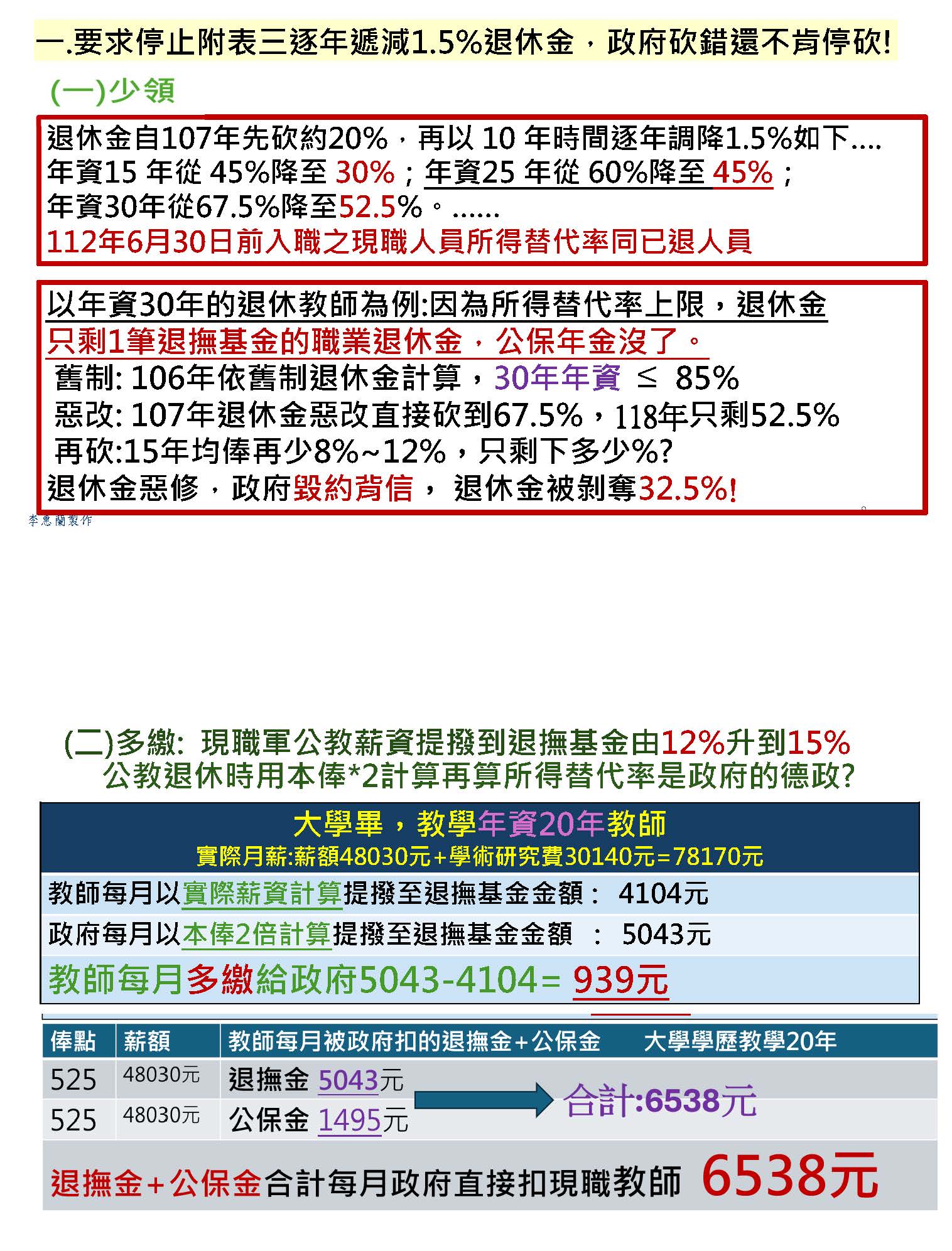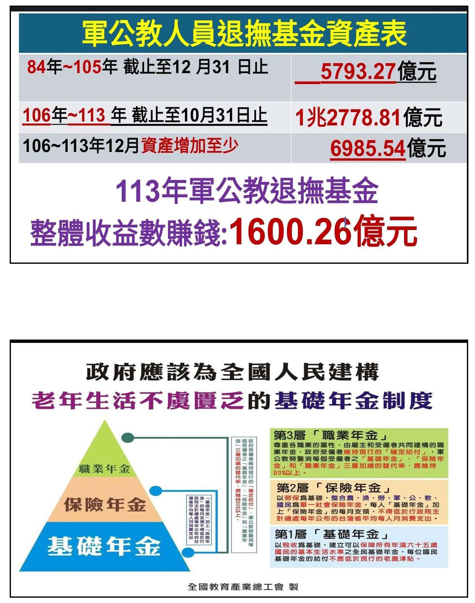 我們來算一算,賴政府繼承中央政府結餘款1兆763億元,今年預算近3兆元,去年超收5,283億稅金,政府手上有4兆6,046億元,居然還放話大喊沒有錢,請問錢在哪裡?更不要說現職教師持續往上調整的提撥費率,沒有停止的現象。我們身邊的老師在工會裡面,我們常常問其他老師,有誰看不出來這就是每年實質的減薪?何況現在每個月繳的比勞保金5倍到6倍以上的保險及退撫基金,這本來就是我們勞動的代價、本來就是我們遞延的薪資、我們的產值,我們不禁懷疑到時候會不會再以基金將要破產的理由、再以教師領太多、教師是米蟲來抹黑教師,讓社會以為教師才是浪費稅金的兇手。