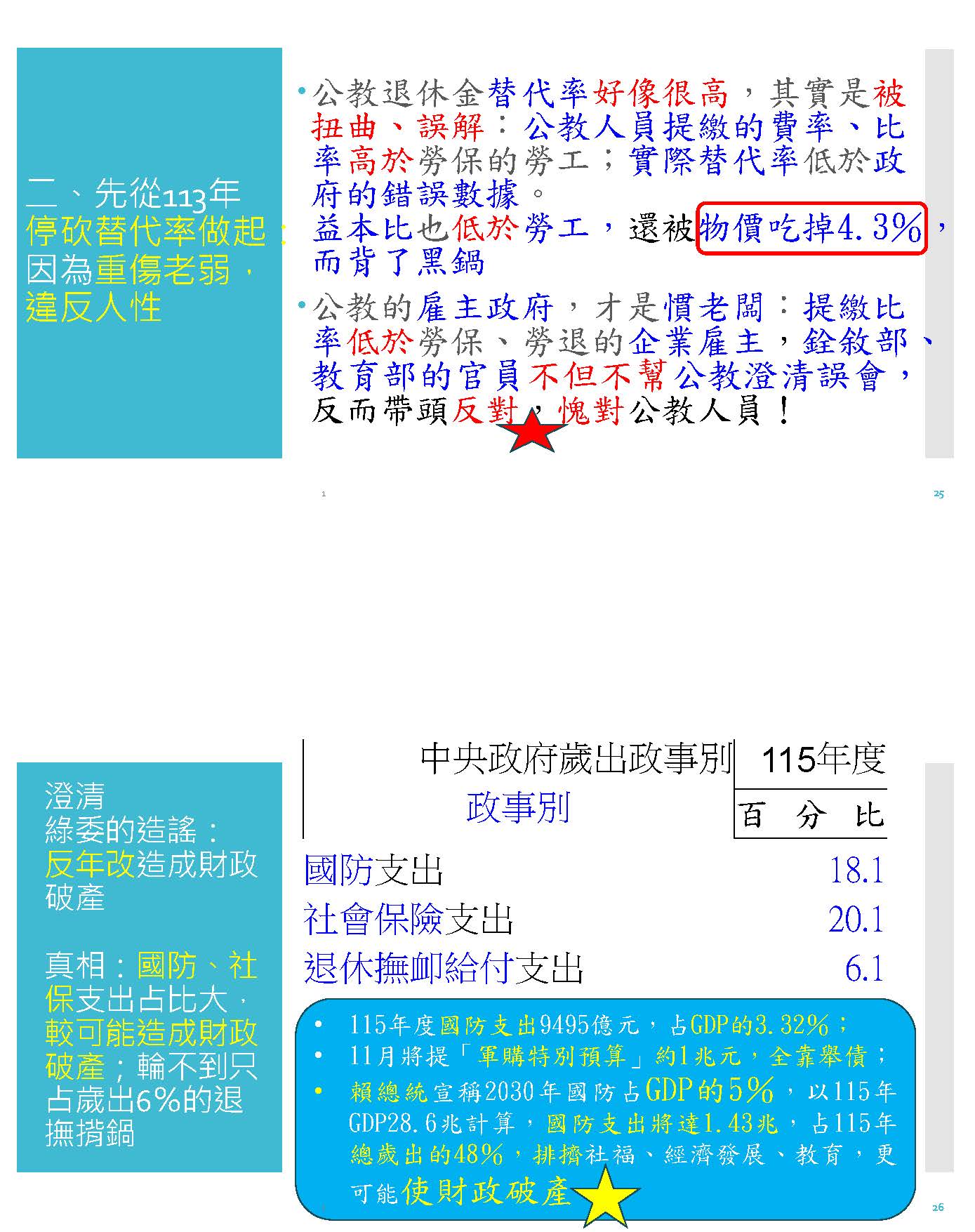 第二個就是替代率從113年起就應該開始做起,因為剛才講過,它是違反人性的設計,重傷越老越弱的公教人員。再來就是綠委很會污衊我們公教體系,現在的真相呢?他就講說我們這次要停砍年金會造成財政破產,我用這個簡單的數字來看,115年中央政府歲出政事別的預算,各位可以看到,退撫給付支出只占中央政府總支出的6%,你的社會保險尤其是勞保就占了20%,國防支出占了18%,上面這兩個才是造成政府會破產的重大因素,輪不到我們公教人員造成財政破產。