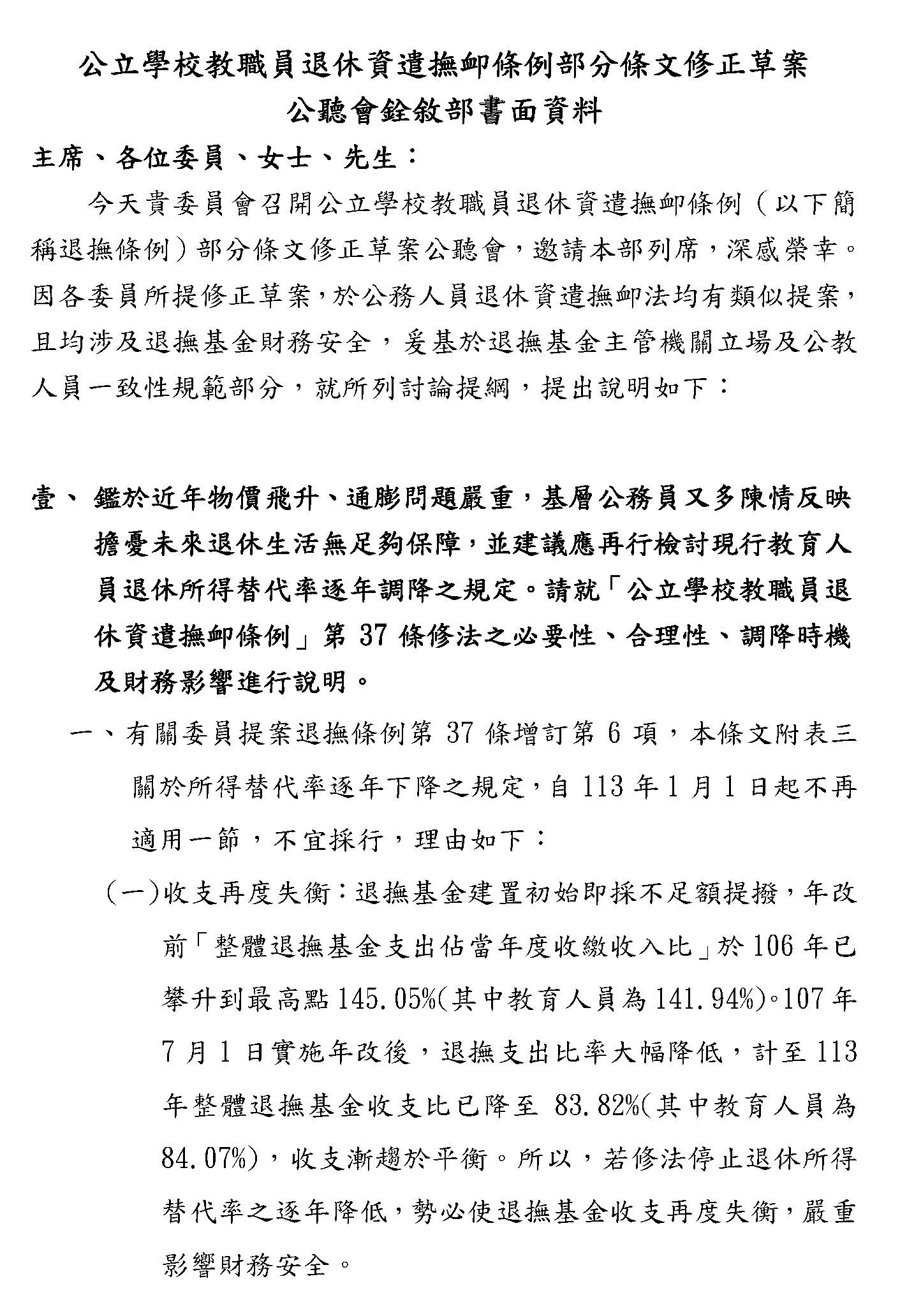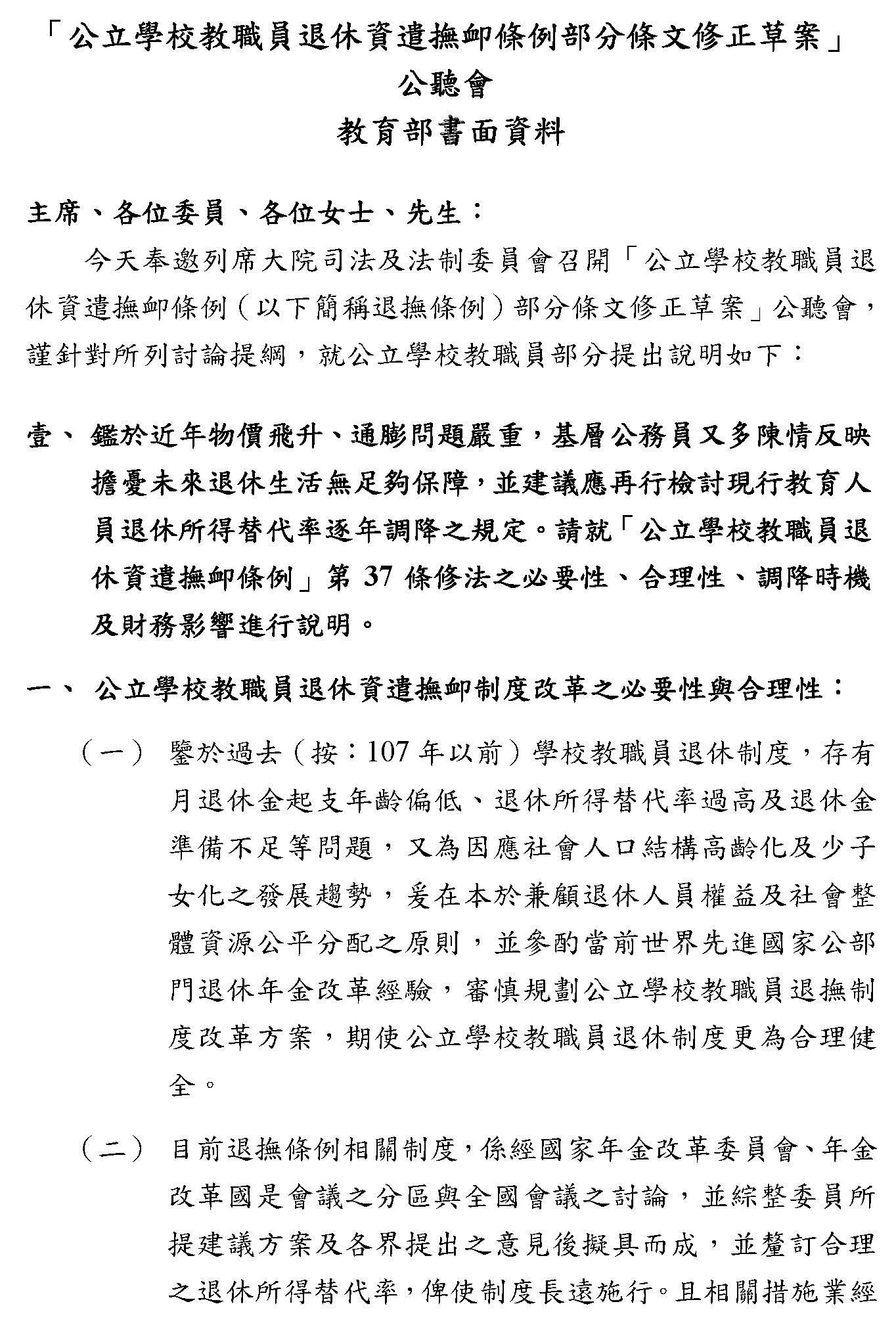 一、鑑於近年物價飛升、通膨問題嚴重,基層公務員又多陳情反映擔憂未來退休生活無足夠保障,並建議應再行檢討現行教育人員退休所得替代率逐年調降之規定。請就「公立學校教職員退休資遣撫卹條例」第37條修法之必要性、合理性、調降時機及財務影響進行說明。