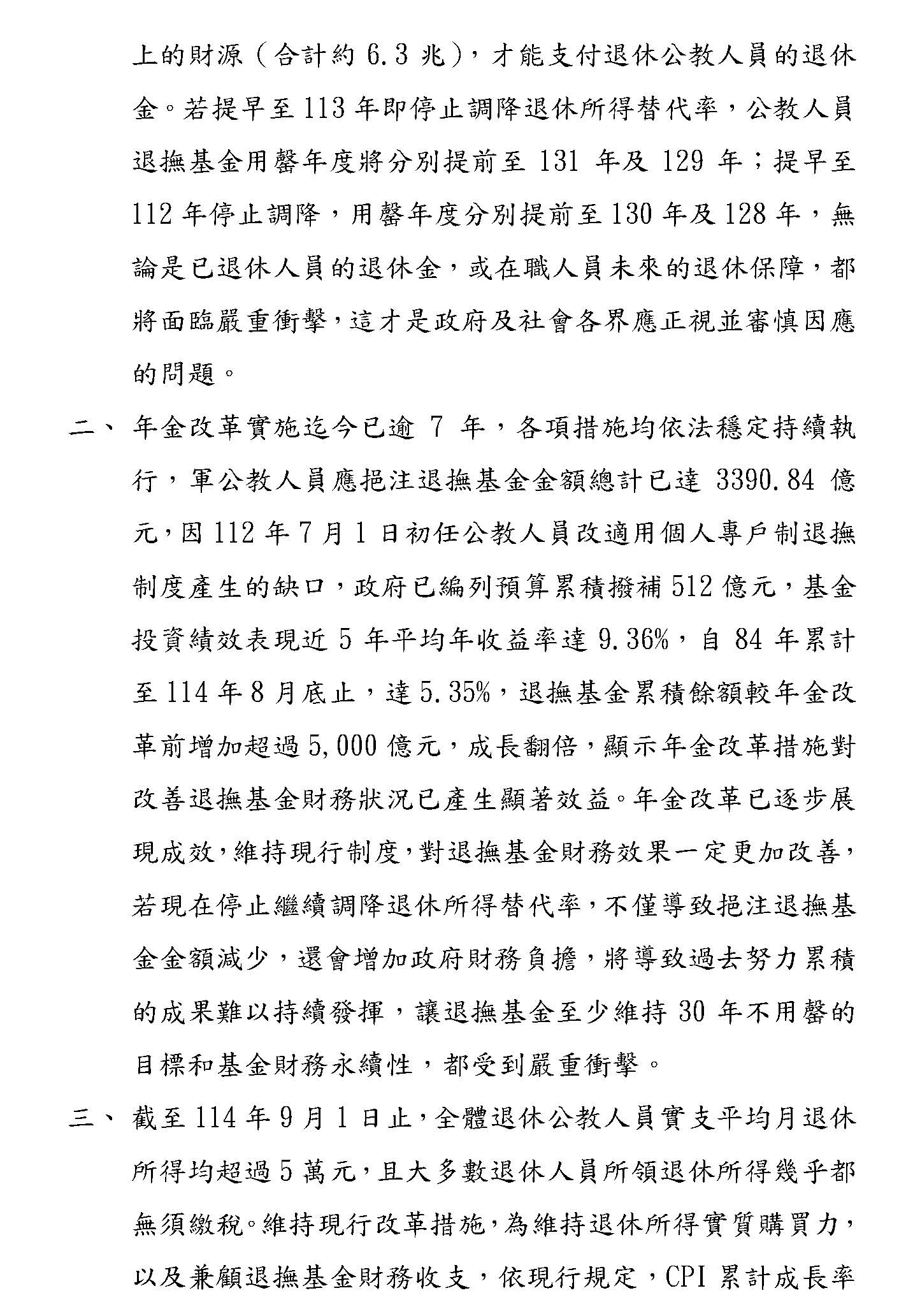 物價的變化不抽象,是每天餐桌上的飯菜、是每個月要繳交的水電費、是健保自付額的看護費。行政院主計總處自己也公布高齡家庭的消費者物價指數,就是認知到高齡者面對實際生活壓力是大於一般家庭的,1990年臺灣家庭支出結構,醫療保險只占了4.78%,到了2024年已經躍升到接近15%,高齡族群所受的衝擊最深,然而制度卻沒有給予這些退休公教人員相應的機制,來反映生活成本的顯著上升,這合理嗎?公平嗎?國家符合退休制度所強調的老年生活保障原則嗎?本席在這邊強調,我們主張停止替代率每年遞減的附表三條文,自113年起不能再適用,恢復合理的年金調整機制,至少應該要與物價指數同時連動,並且與現職軍公教的薪資變動來比照辦理,這是根據經濟現狀所做出的制度補正,也是對過去改革承諾保障退休生活的檢討與履行。