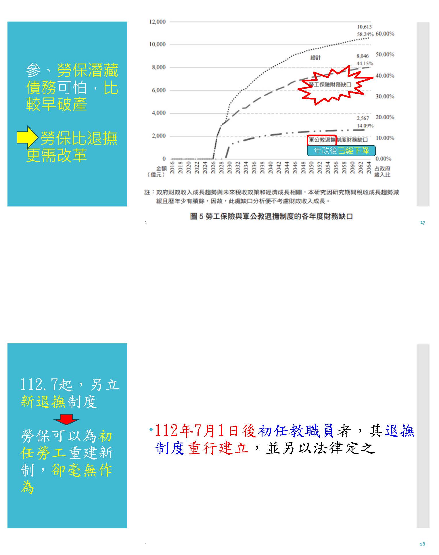 所以從這些數字,時間有限,我就沒辦法詳細說明,從這邊我們可以看到就是公務人員,不管從什麼角度來看,他領的,在職業不公方面是對勞工有利,對公教人員是不利的。然後我們再來看下面這個圖,各位可以看到現在勞保的財務缺口非常的嚴重,是我們公教的好幾倍,而且年改之後,公教的財務缺口已經明顯的下降,勞保退撫這七年、八年多都沒有改革,結果造成了我們勞保的潛藏債務從過去三年就暴增了3兆,已經到了13.6兆,撥補了3,870億,延後破產到民國120年而已。
