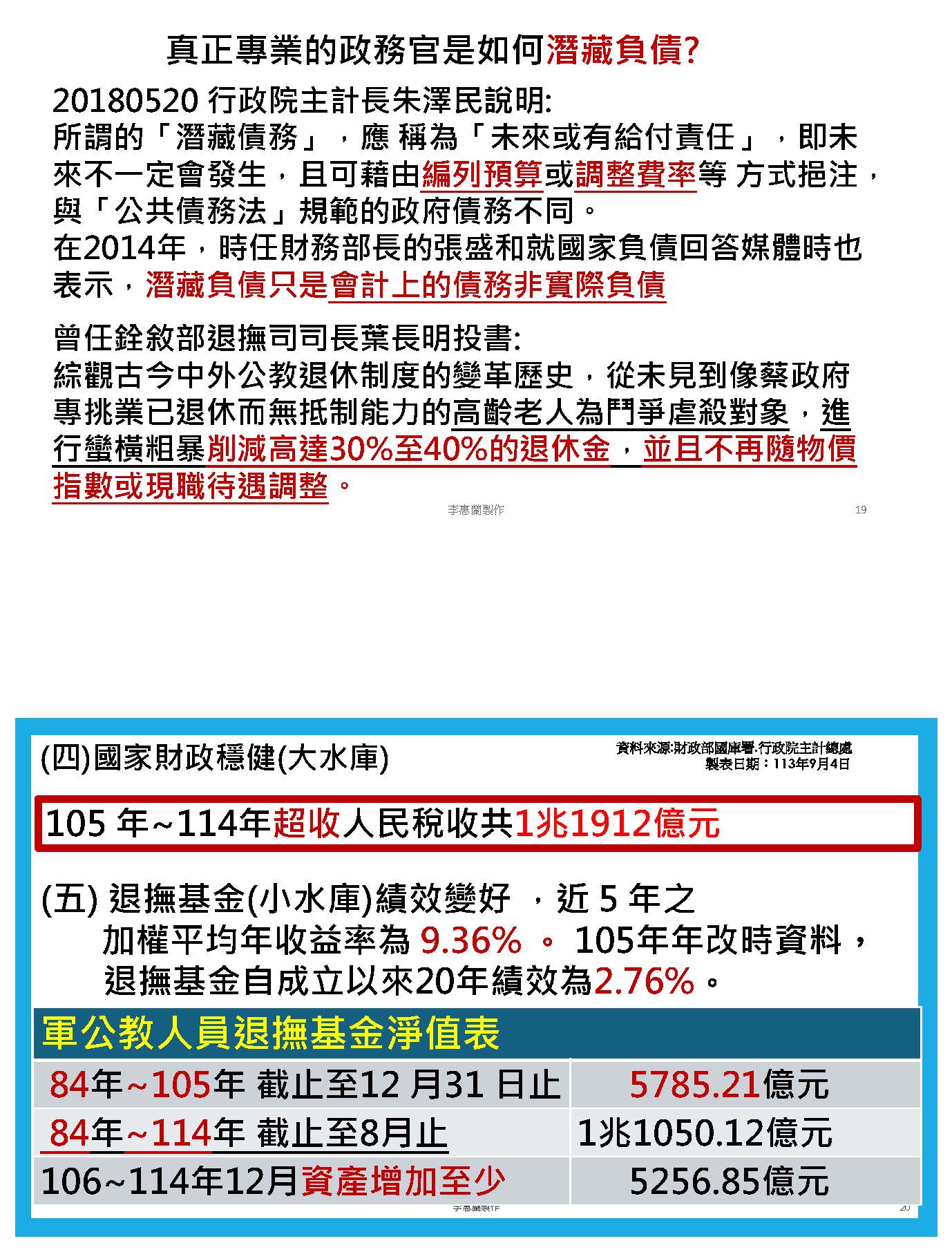 二個水庫就是在2017年那時候為什麼要犧牲我們的軍公教、要砍退休金?因為他們說大水庫「國家財政」有困難;第二個,小水庫「退撫基金」的錢不夠了。現在這兩個問題都解決了,我們最近幾年的財政良好,過去五年,我們的稅收超徵了2兆,2017年推動年金改革的時候,國家財政確實是困難的,可是那時候的中央政府總預算規模是2兆出頭,現在已經快速膨脹到3兆了,我們現在是一個有錢的國家,不應該再犧牲我們的軍公教人員。