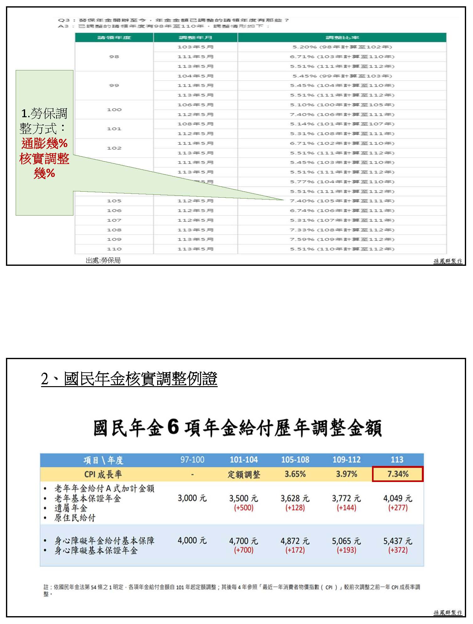 我們看一下勞保的核實調整長什麼樣子?它們每超過5%,連小數點都調整,甚至有一年調到7.4%、有時候還調到6.71%,總之就是通膨百分之幾、它們就調整百分之幾!然後國民年金最近的一次調整就是7.34%。所以我們深深覺得我們就像三等公民一樣,不如勞保、國保、農保;也不如現職,因為比較相同時期調整的幅度,我們就比現職整整少了5%。這個影響所及就以同樣年資30年做例子,後退休的人會比前退休的人多領3,000塊,也就是說,同樣為國家貢獻30年,可是你的退休金會少3,000塊,以後隨著現職加薪,這個差距還會再擴大,形成差別待遇。