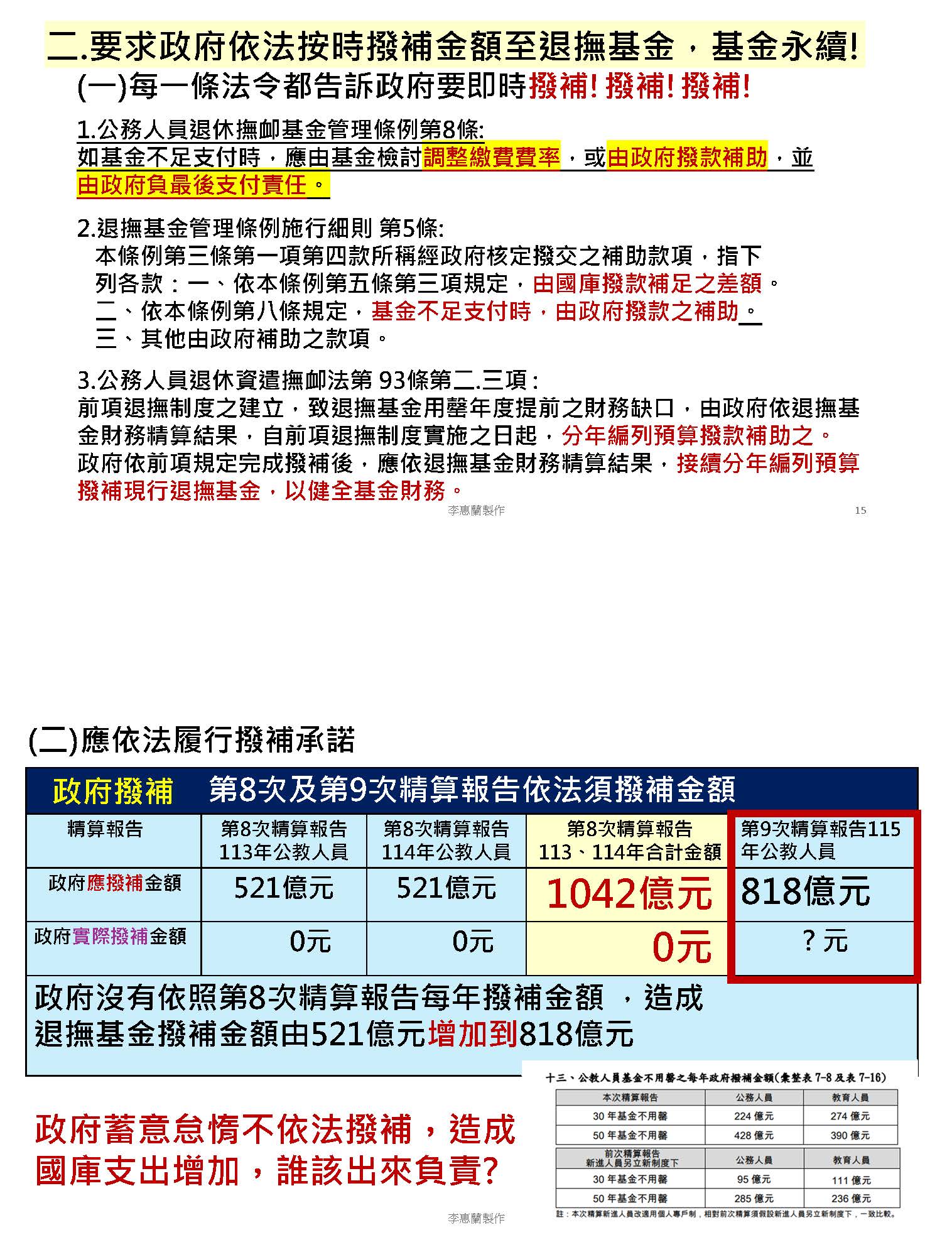依照第8次跟第9次精算報告來比較的話,就如前面我們的專家學者有提到50年不用罄,政府每年應該撥補的金額因為沒有實際上撥補,從521億元增加到818億元,這個政府可說是荒唐,我認為政府應該立刻依照精算報告完全、完整的撥補。