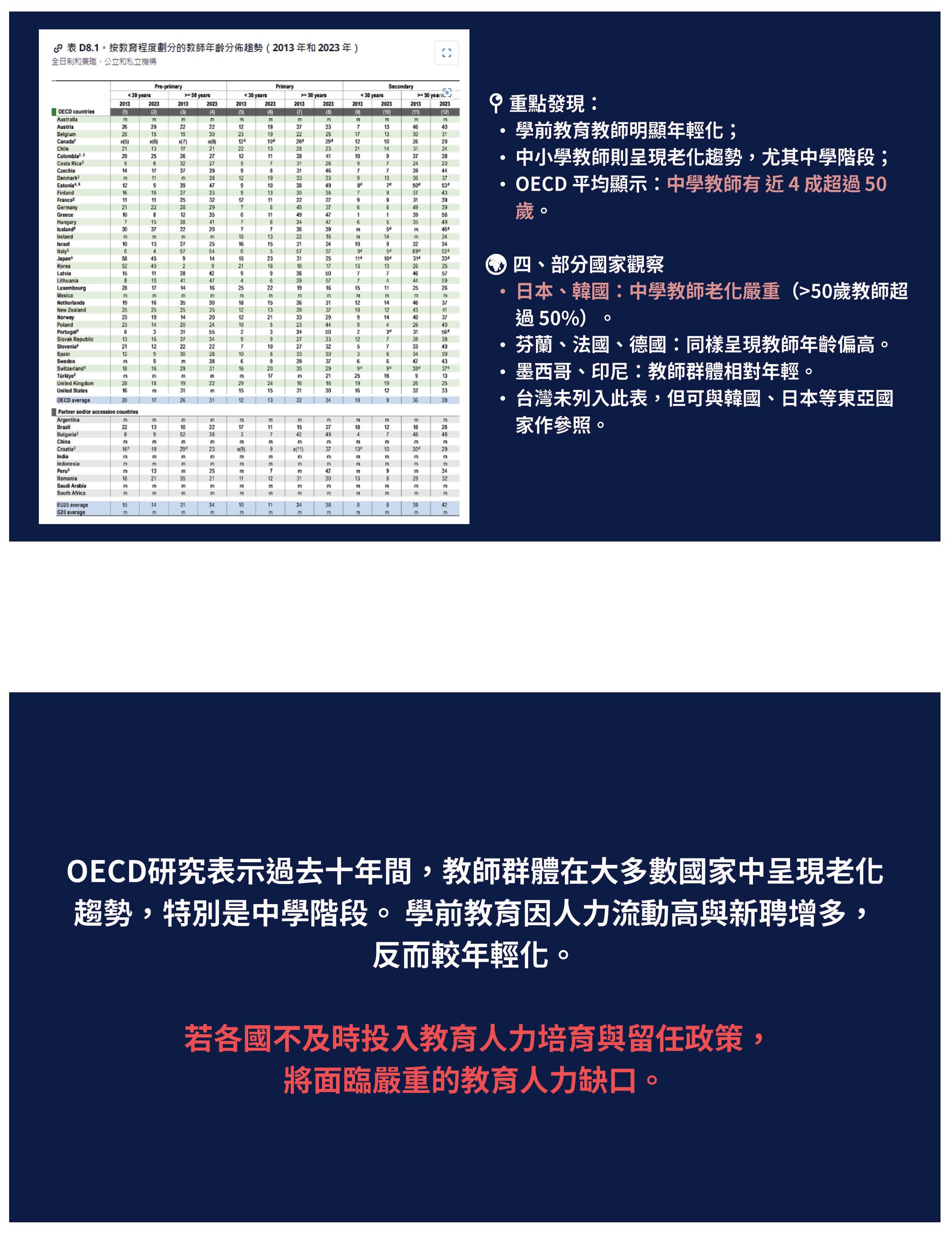 在2022年經濟合作暨發展組織OECD,他們有調查各國教育概觀,針對教學的週數、日數、教學的時數來調查,這三項指標臺灣皆高於平均值,不知道各位知不知道?平均週數、教學週數來說,平均38週,臺灣是40到42週;教學日數平均185天,但是臺灣有197到200天,也就是臺灣老師的工時也居高不下,這都是非常現實的。