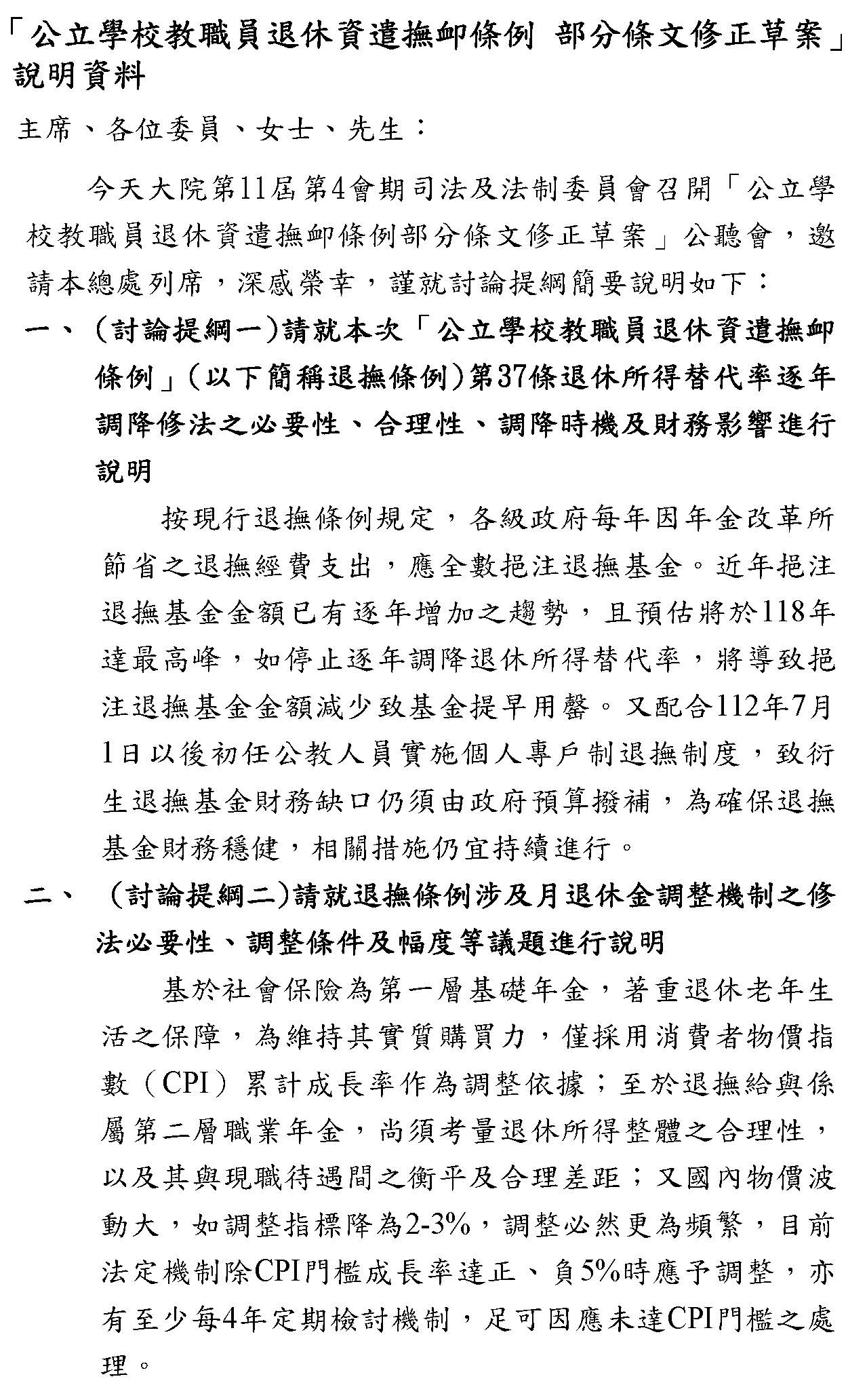 討論提綱一、有關退撫條例第三十七條修法之必要性、合理性、調降時機及財務影響部分:目前退撫條例相關制度係因過去教職員退休制度存有月退休金起支年齡偏低、退休所得替代率過高及退休金準備不足等問題,爰本於兼顧退休人員權益及社會整體資源公平分配的原則,審慎規劃改革方向,以擬定合理的退休所得替代率,倘退休所得替代率自113年1月1日起或自114年後停止逐年調降,教職員部分將使未來50年年改節省經費挹注到退撫基金,減少約1,652億元,導致退撫基金用罄年度會再提前3至4年,對於基金財務安全產生衝擊。又目前已訂有配合消費者物價指數而啟動的月退休金調整機制,調整後的金額亦不受退休所得替代率上限的限制,且依現行規定,約有85%退休教師實領月退休所得超過5萬元,平均月支領所得約5.8萬元,爰現行制度應足以適足保障退休生活。
