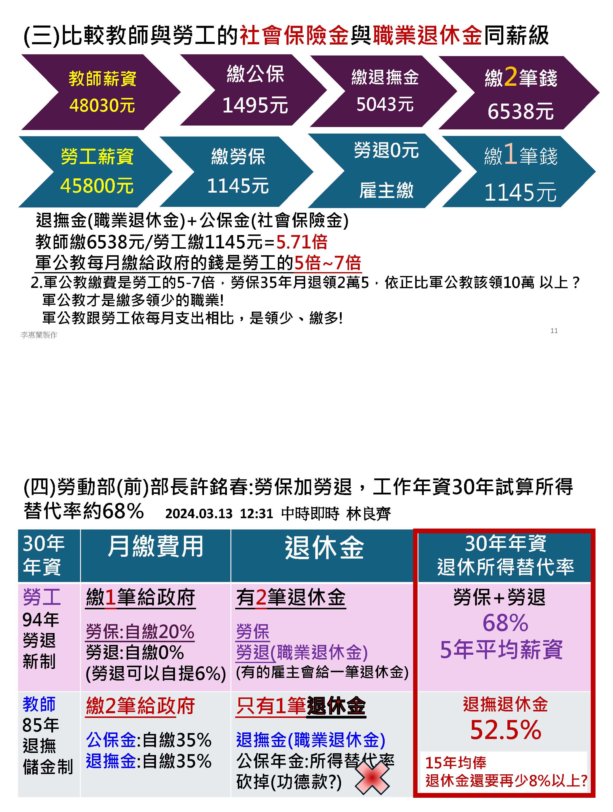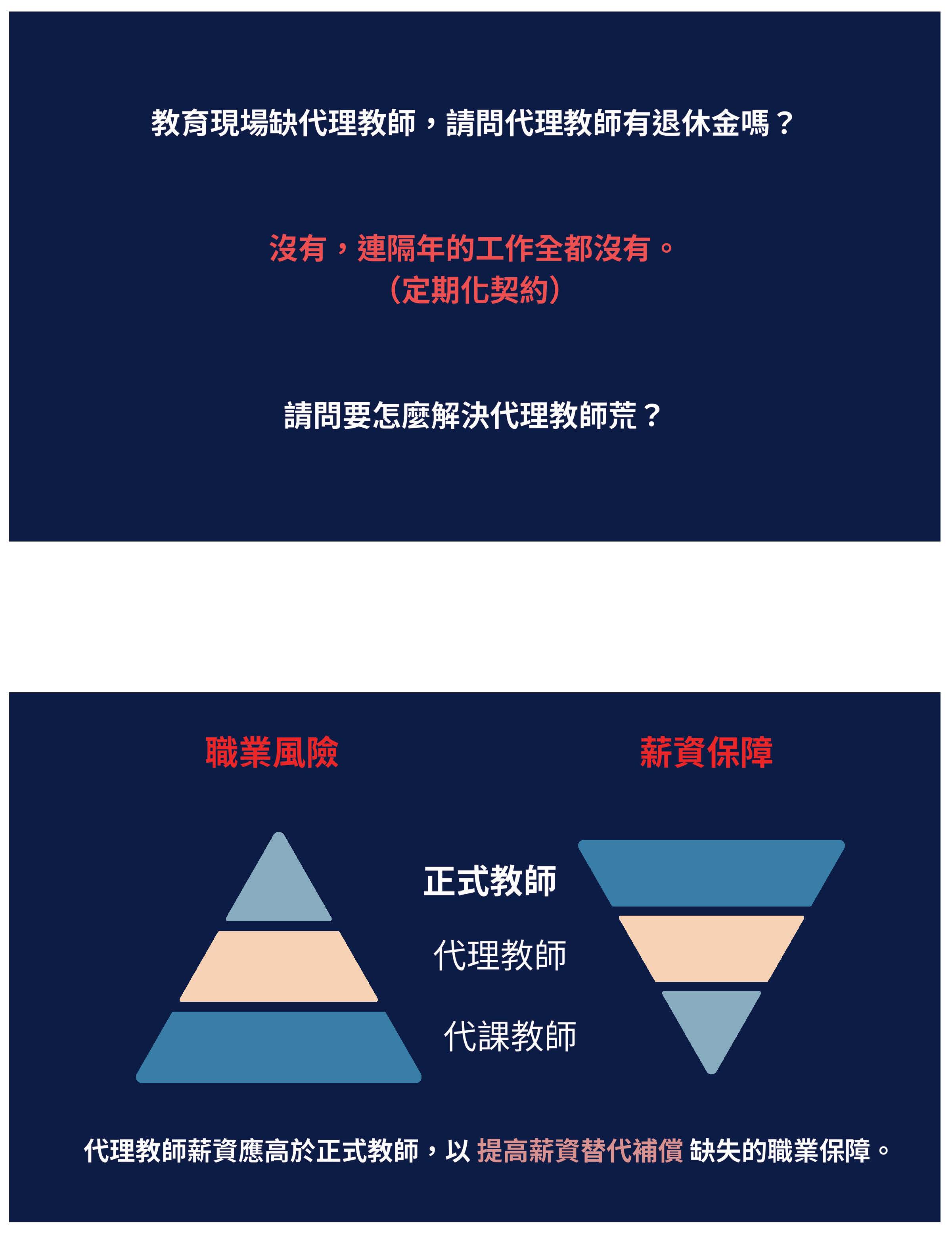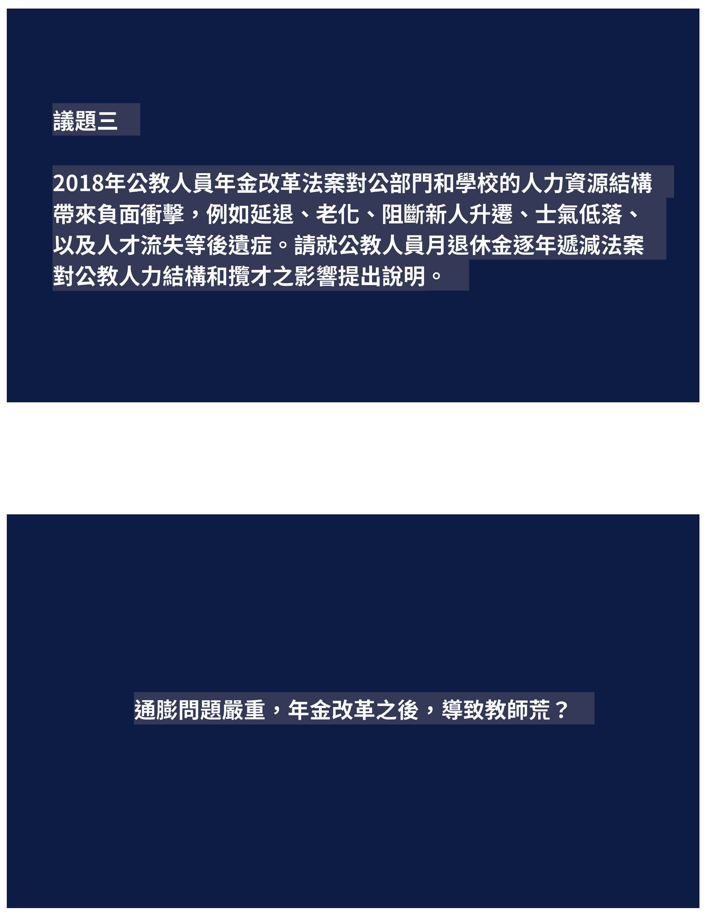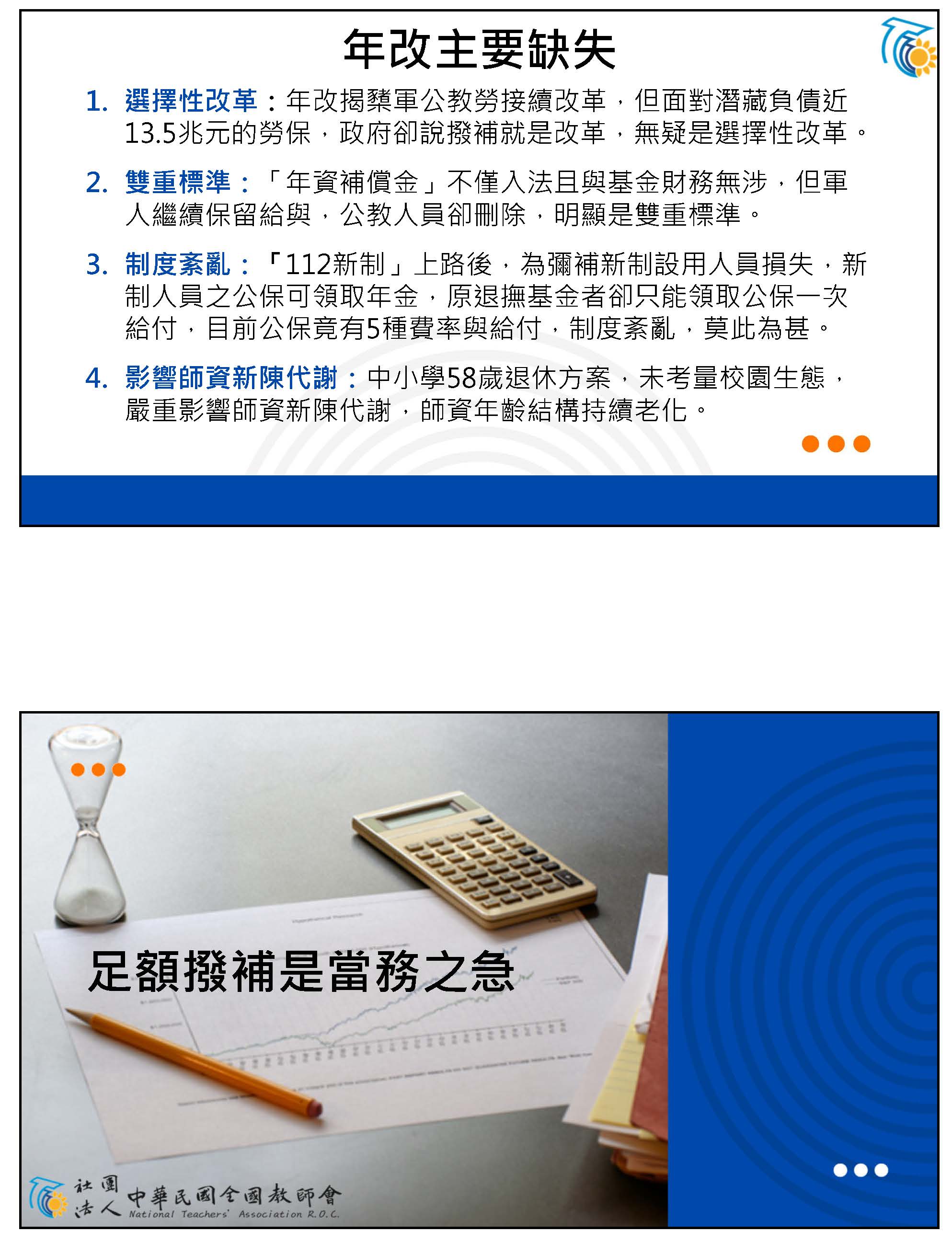 改革應該是修正,我覺得不是割裂的手段。我們提到的問題,第一個,世代不平衡,這個政府跟我們之間的信任關係是被摧毀的,新進教師繳多領少,但是未來卻會慢慢地延後退休。第二個,改革應該以公平跟信任當作基礎,107年開始,公教人員的退休金從5年均俸到118年的15年均俸作為計算,那勞工的退休計算薪資是5年的平均薪資,這樣對我們來說,真的是合理的、公平的嗎?