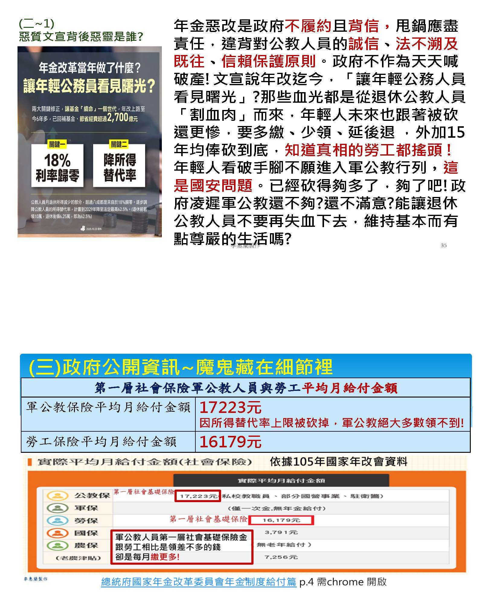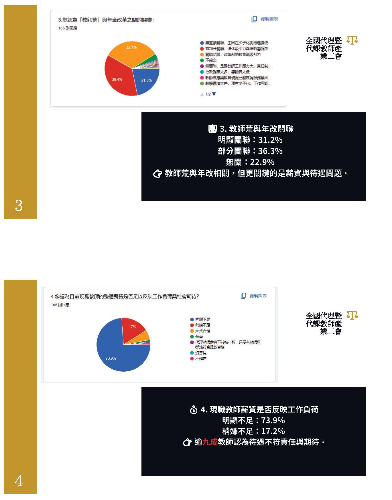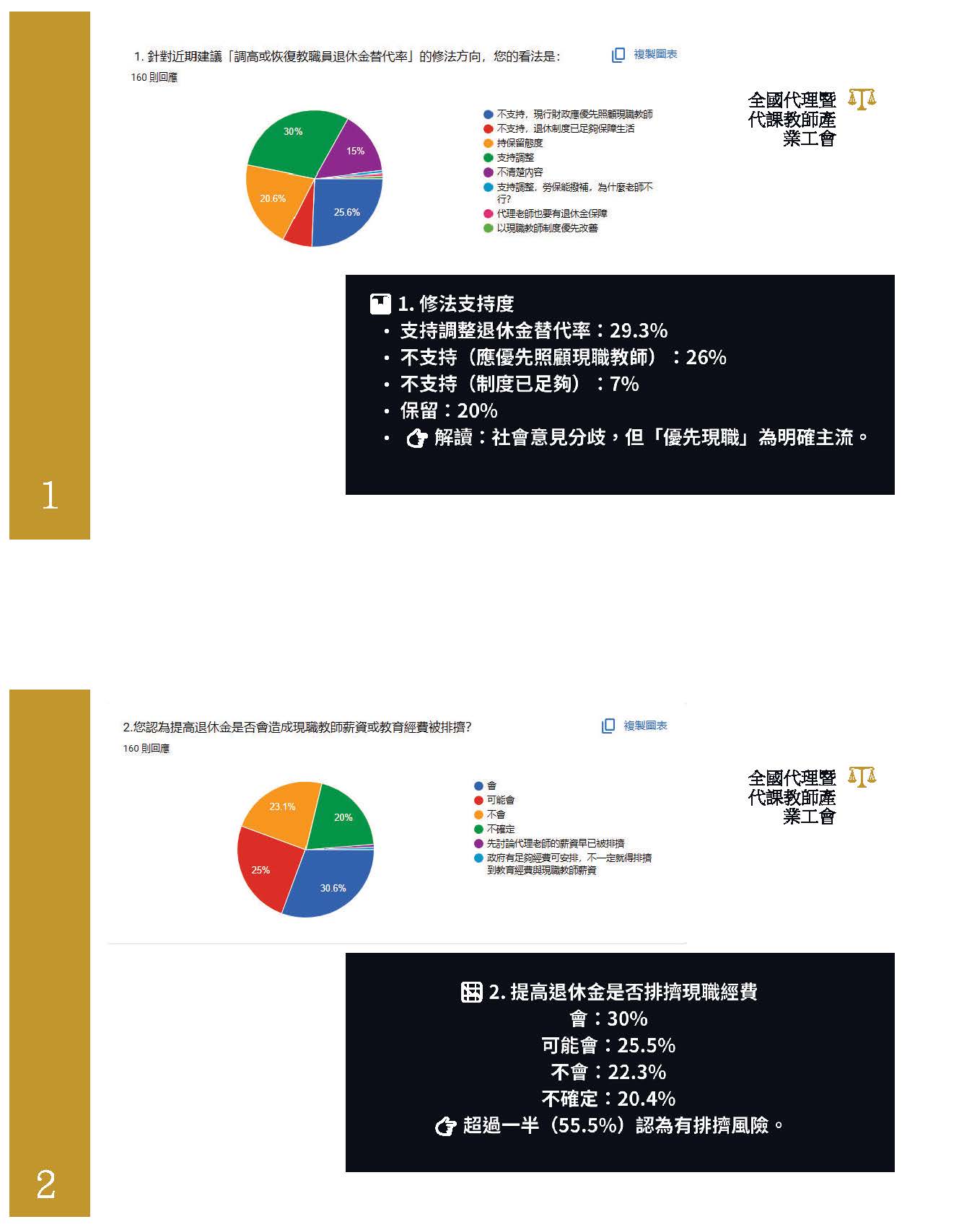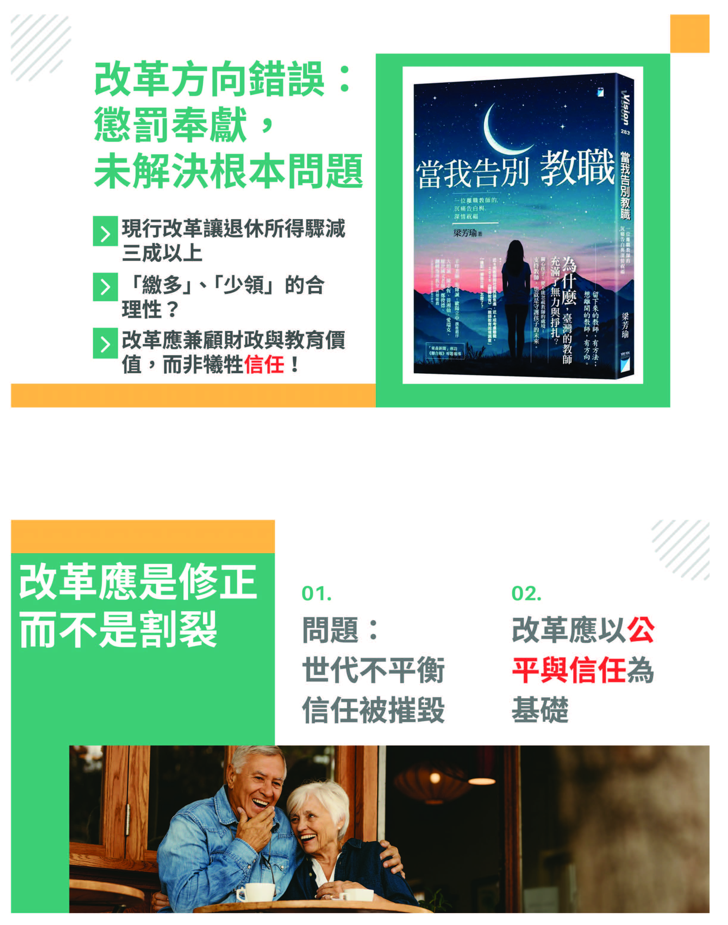 改革應該是修正,我覺得不是割裂的手段。我們提到的問題,第一個,世代不平衡,這個政府跟我們之間的信任關係是被摧毀的,新進教師繳多領少,但是未來卻會慢慢地延後退休。第二個,改革應該以公平跟信任當作基礎,107年開始,公教人員的退休金從5年均俸到118年的15年均俸作為計算,那勞工的退休計算薪資是5年的平均薪資,這樣對我們來說,真的是合理的、公平的嗎?