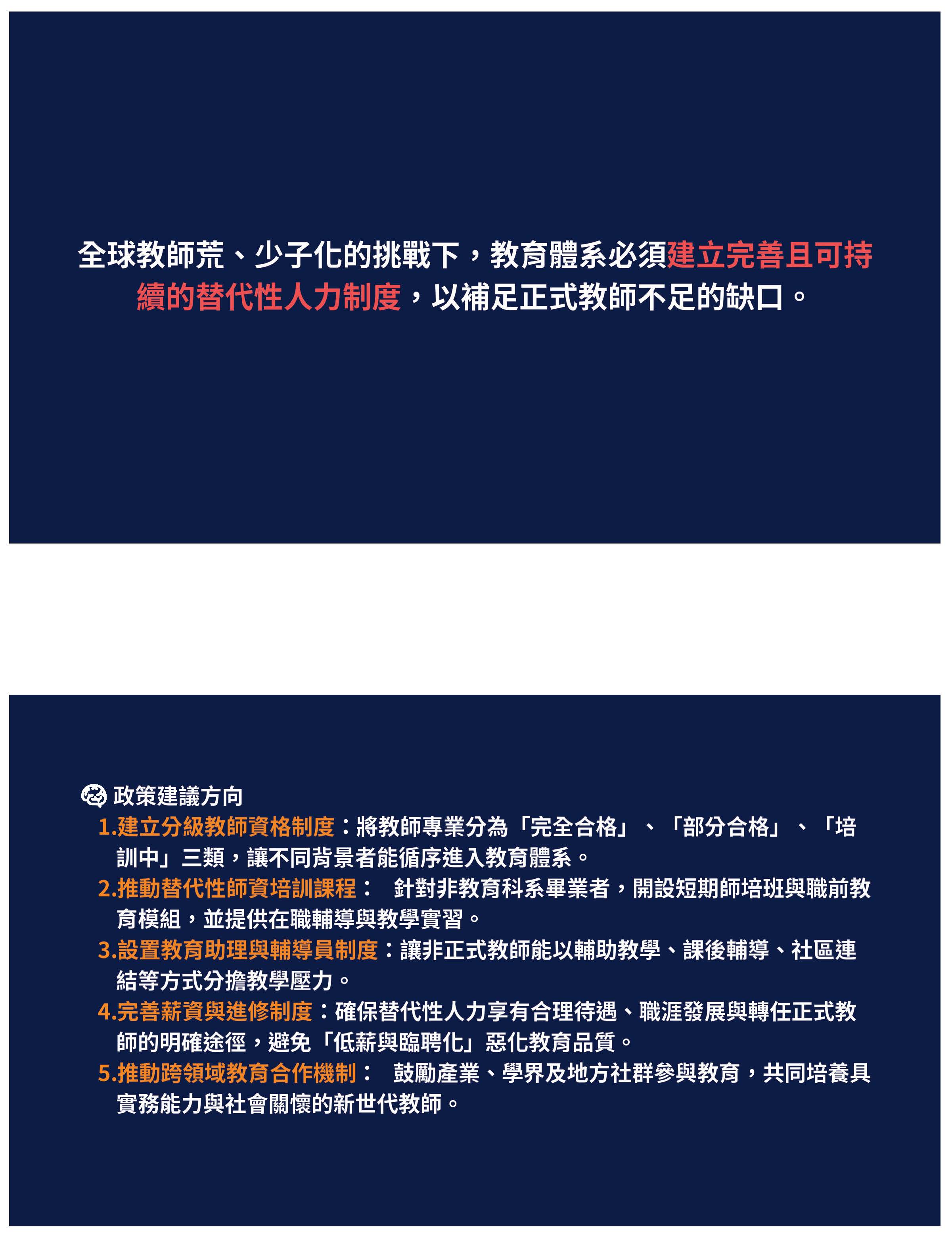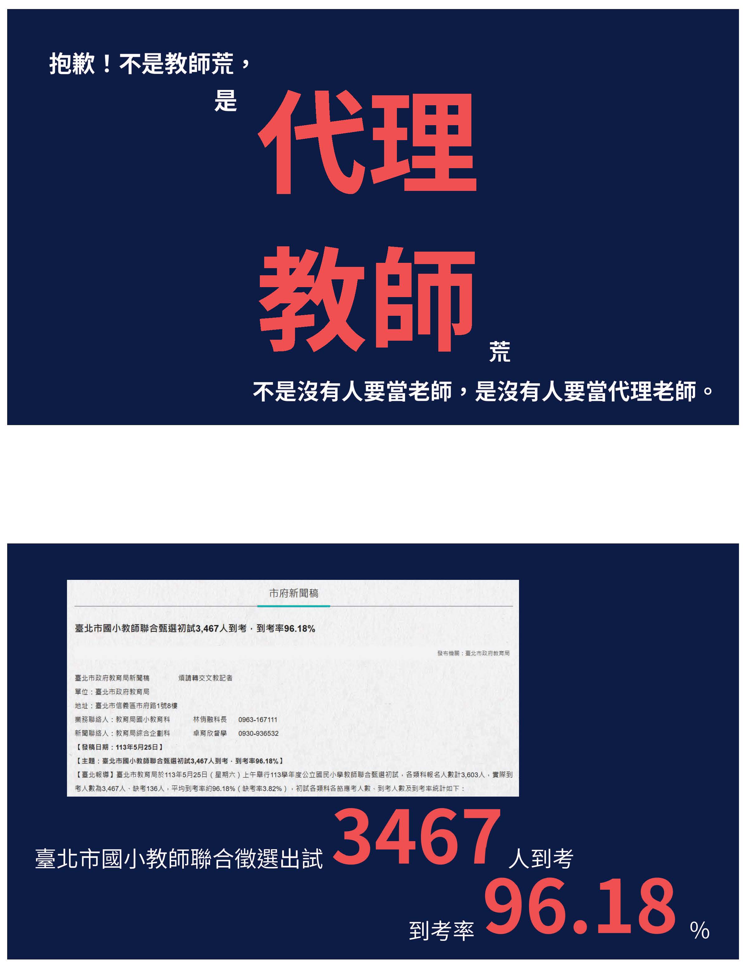 面對今年如此緊急的開學教師荒,政府在8月25日的時候,新聞發布聲稱只是職缺刊登數,真正的數字是1,429位,而這1,429位教師過4天之後,居然就銳減成七分之一的數字,原來政府的作法只是把表面缺少老師的數字降低而已,面對教師荒,胸中其實沒有任何策略,就是讓學校老師把課兼回去,大家可以看一下PPT,因為教育部自己說研議採用校內教師、跨校教師或退休教師兼課,把課兼回去,其實有解決問題嗎?沒有啊!不但沒有看到錯誤,接下來第二步,又再度把教育專業判死刑、送進墳墓,竟然要開放不經過完整師資培育教育的人員送進中小學的校園,這種荒唐作為不叫慣老闆嗎?到底哪一間公司要招聘助理,最後讓助理在公司裡做的是經理和工程師加業務的代表工作?那根本就是馮京當馬涼嘛!把專業踐踏在地上。請政府不要為了降低失業率,我們懷疑,把信任政府的民眾送進校園受苦,教育是有專業的。