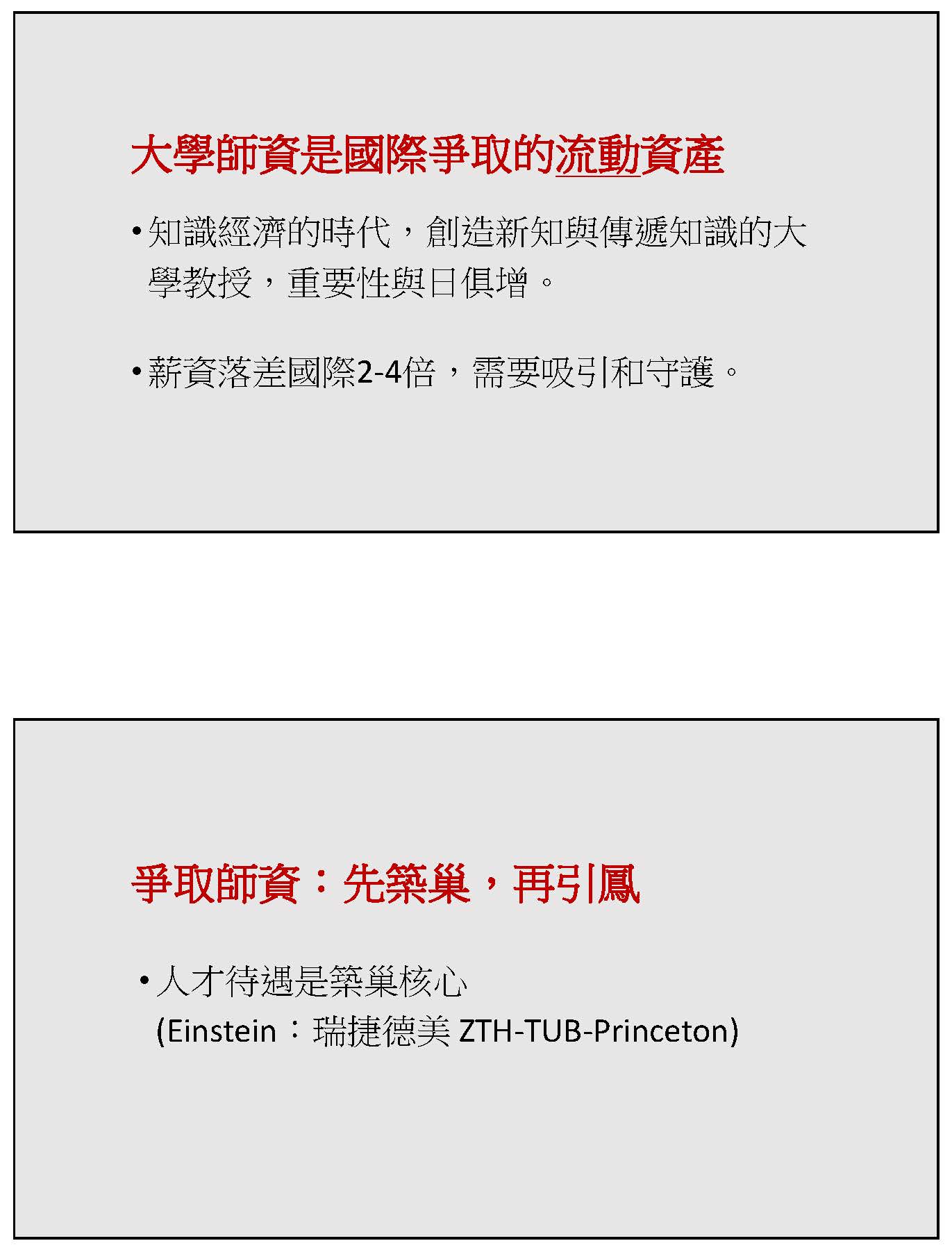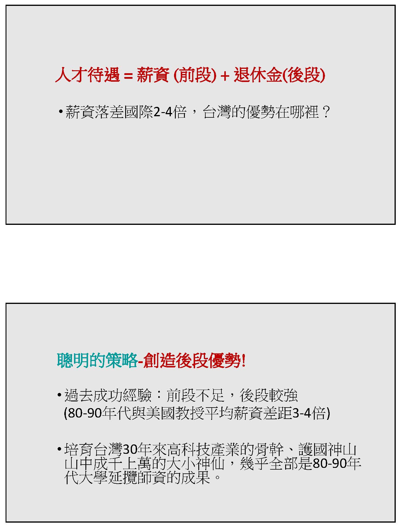 大學對於爭取人才的確是承受巨大的壓力,但是也充滿了機會,人才待遇是什麼意思呢?其實最主要的部分就是第一個薪資,我把它稱為前段,退休金是後段,如同半導體的製程有前段、有後段,這個要整體來看,任何一個成熟的人才在考慮工作待遇的時候絕對是以整體的待遇來看。臺灣的前段是很弱勢的,那臺灣的優勢在哪裡?