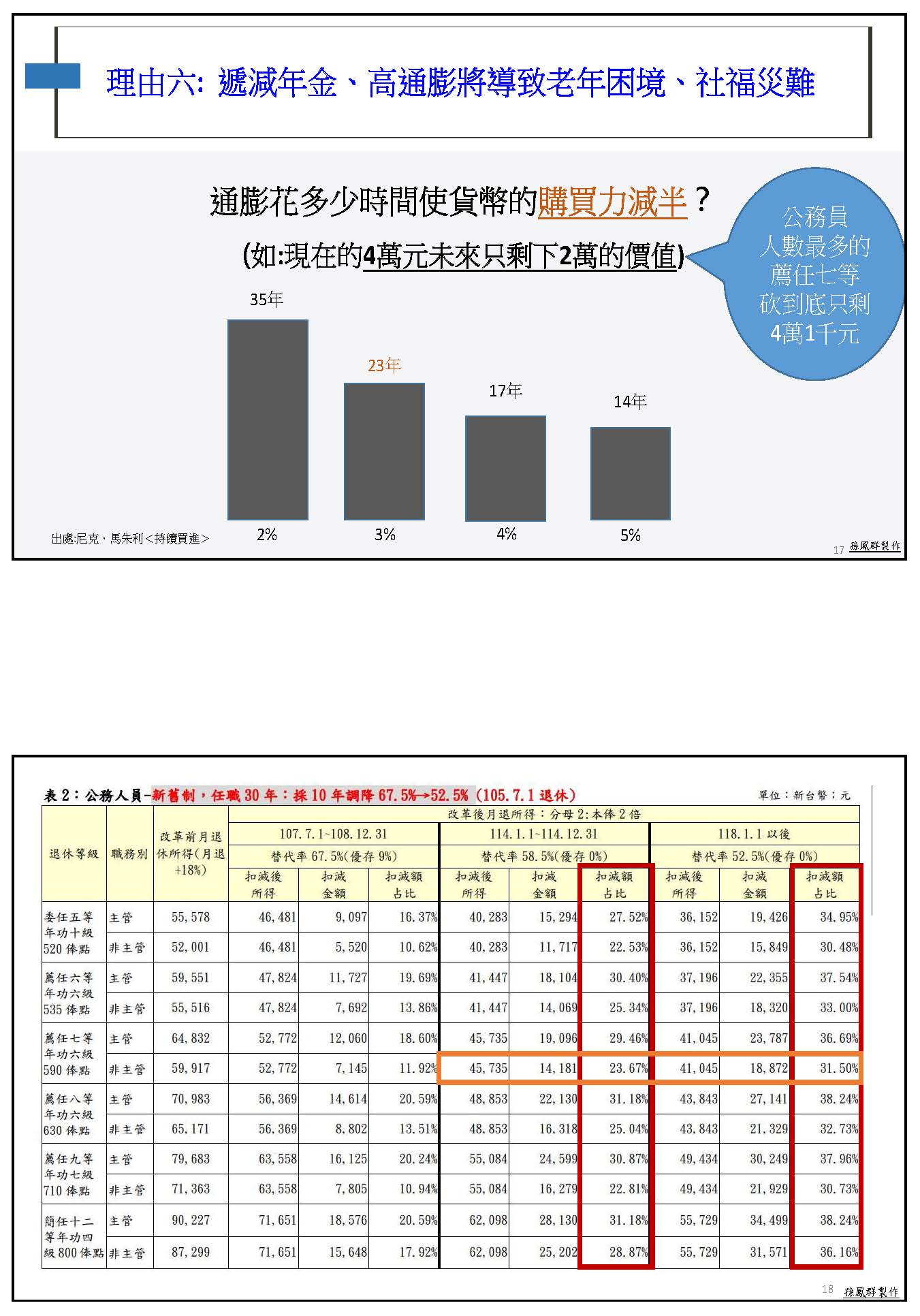 第六點,我們都知道這幾年通膨非常的高,如果以通膨3%來講,23年後我們的購買力會減半,舉例來說,現在的4萬元在未來只剩下2萬的價值,因為現在每年的平均通膨大概是2.65%,那我為什麼講4萬呢?因為公務人員人數最多的薦任七等被砍到底就只剩下4萬1,000元,所以可以預見的是,如果現在沒有做彌補的話,二十幾年後他們的退休金可能只剩下兩萬多的價值,就在他們醫療需求最大的時候!因此我們也強烈要求,第六十七條應該要修訂為隨物價指數核實調整,因為這也是確定給付制退休金的管理通例,甚至連大法官都幫我們注意到了,他們在釋字第781號到第783號都提出:政府有維持退休金價值不隨時間、不隨通膨而產生實質減少的義務,甚至還明示要參照勞保條例,依消費者物價指數調整月退休金,然後要求主管機關應該要儘速修正。可是到現在已經拖了5、6年了!