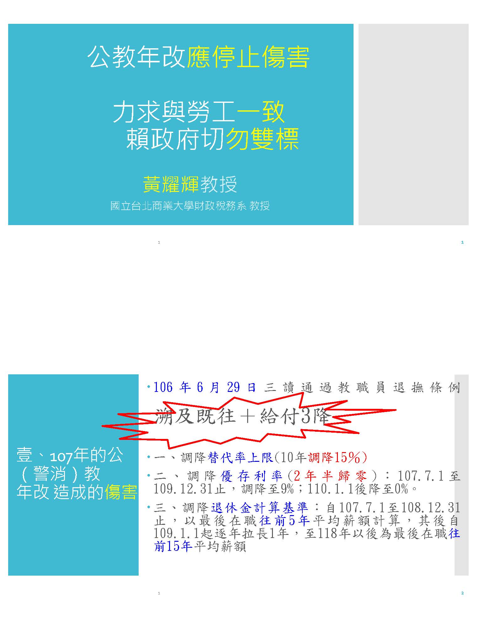 黃教授耀輝:主席,各位先進,大家好。時間有限,我就有話直說,我今天要講的重點就是公教年改已經造成重大傷害,現在應該適可而止了,我們希望賴政府不要再雙標,只要讓公教退休制度與勞保、勞退一致就很好了。