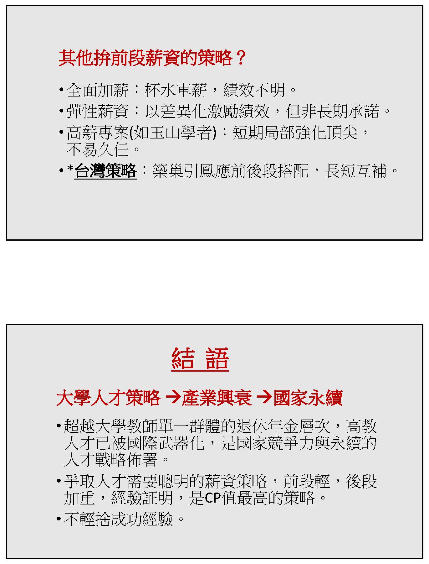最後做一個結語,大學的人才策略不是只關乎大學、甚至一部分人退休之後的生活問題,而是有關於高科技產業興衰、國家永續、國際性人才流動的問題。事實上,高教人才已經被國際武器化,它成為國家的戰略資源,如果國家不做重要的選擇跟部署,而且在有限的財力之下,我們要用在國防、要用在社福、要用在經建、要用在醫療,怎麼樣選擇一個聰明的策略做最有效益的戰略部署?這個才是今天議題的核心!過去的經驗證明,前段輕、後段加重是CP值最高的策略,常常覺得人類的愚昧是來自於對歷史的遺忘和健忘。