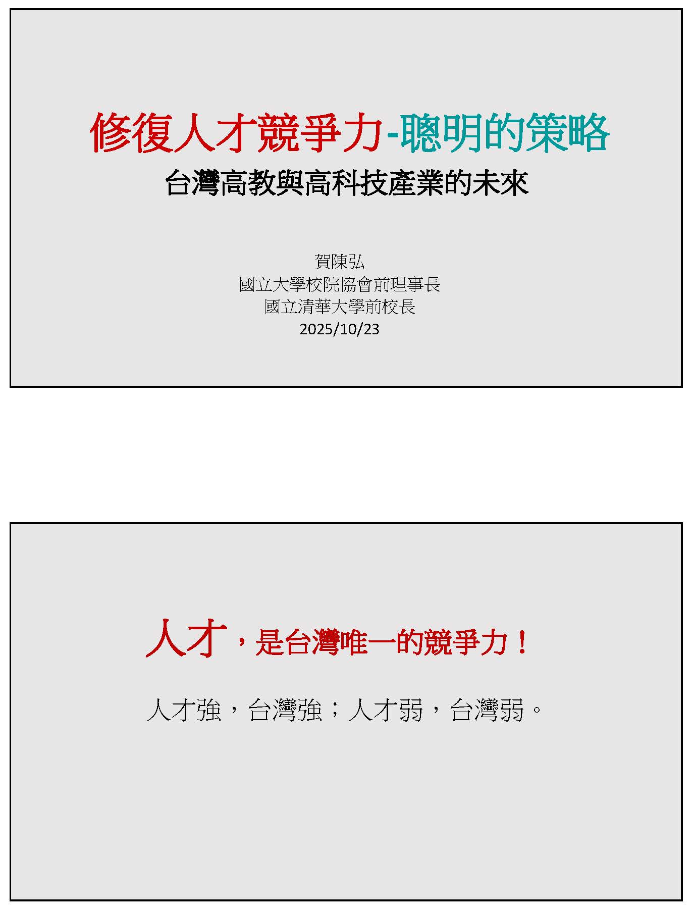 賀陳講座教授弘:主席好、各位委員、政府各位代表,還有各位夥伴,大家好、大家午安。大家都知道跟飢腸轆轆過不去是錯誤的,請大家稍微包涵。我今天是從一個在高等教育長期服務的第一線觀察,討論高等教育和高科技產業,對於這個問題所受到的影響和看法,修復人才競爭力其實我們需要一個聰明的策略,歷來談論人才策略,做法很多,我們如何從中間找到一個最聰明的,這個是比較務實的。人才是臺灣唯一的競爭力,我想這個不分藍綠應該是臺灣的共識,人才如果強,臺灣強;人才弱,臺灣一定弱,因為臺灣並沒有顯著有形的資源,人才是臺灣幾乎唯一可靠的、永續的資源。