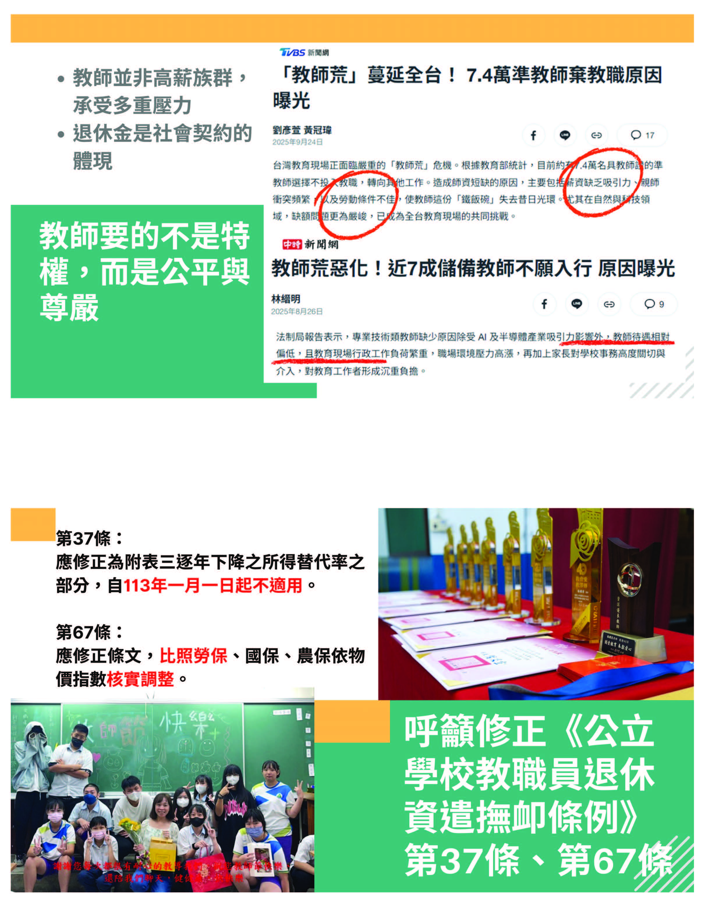 PPT上這張照片是我們本校頒發20年、30年資深優良教師的獎座跟獎狀,所以這些獎座只是上級官員們對於老師尊重的一個表象嗎?下面這張照片是我們學校特教科的導師跟班上同學們教師節的合照,這樣子的愛、教育、陪伴,不值得擁有安穩的退休生活嗎?請各位再做思考。