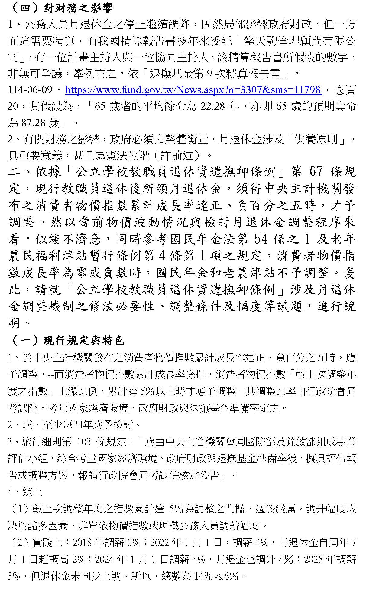接下來,目前立法委員們所提的幾個不同的提案大致相近,包括幾個方法,我就逐一來談。第一個就是停止調降1.5%,比如說從今年開始停止調降或是追溯從去年開始停止調降,我認為這個是可行的、是合理的,因為本來在當時刪減的幅度就是蠻激烈的,我講真的,就是在2018年年改的時候。第二個,我們從現在來看的話,通膨指數事實上是讓人家感到憂心的,然後整個生活有諸多的不確定性,比如說地緣政治、兩岸關係等等。公務員加薪了4次,總共是3%+4%+4%+3%,達到14%,我在我的書面意見裡面有寫,可是我們月退休金的增加只有兩次,就是2%+4%,所以等於是14%:6%,所以有相當的差距。如果我們不停止刪減,還要繼續刪減4年,對不對?那就不得了,因為再4年就是6%,對不對?那這整個就不會再是銓敘部所講的50,395元,就降到5%以下了,大概是百分之四點多,我覺得這樣對公務人員來講是嚴峻的。