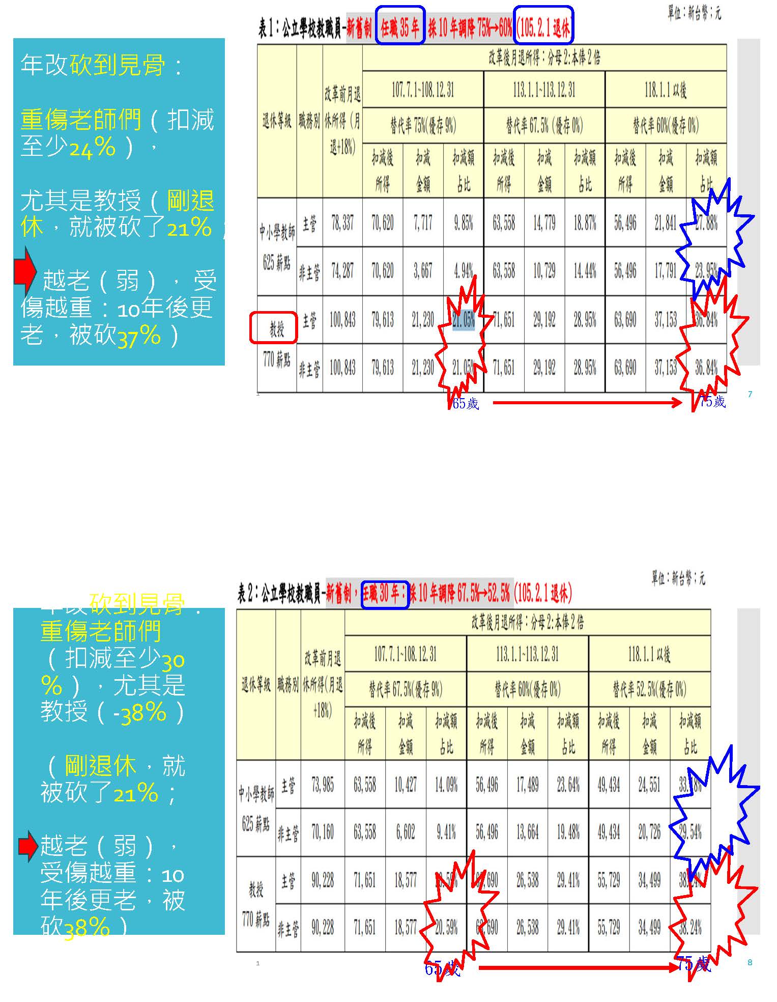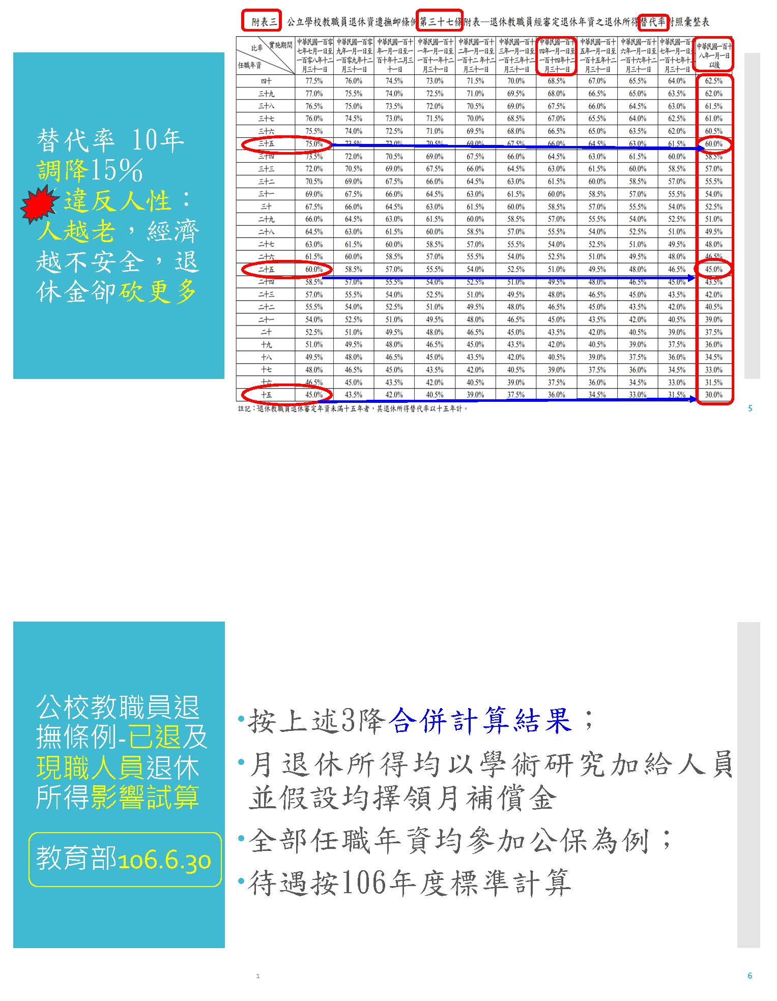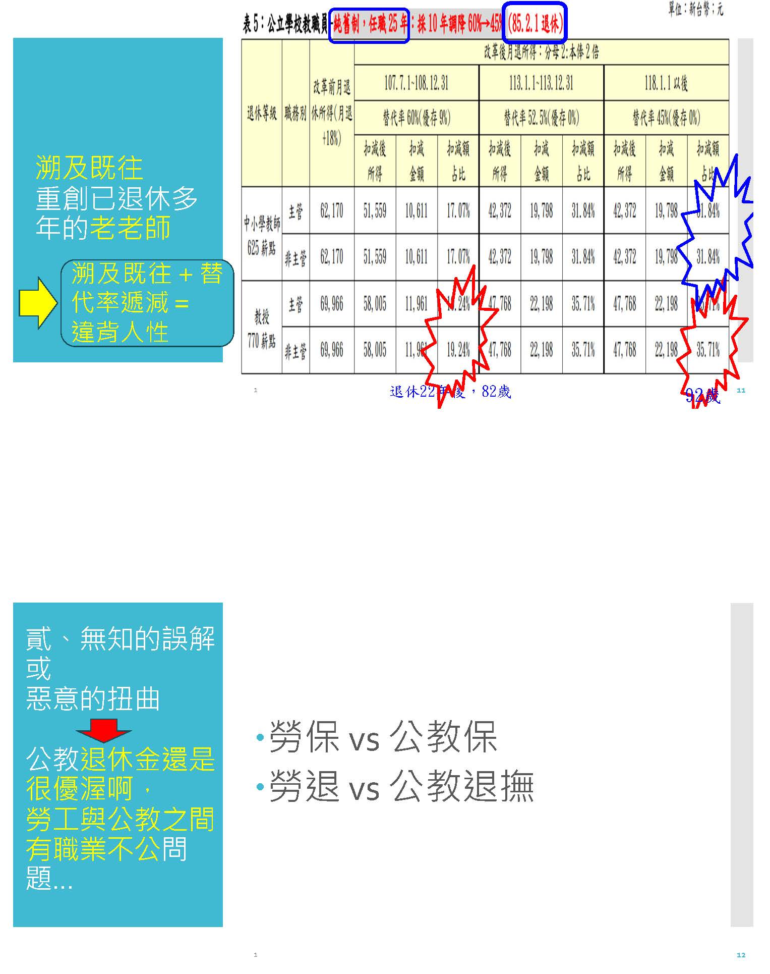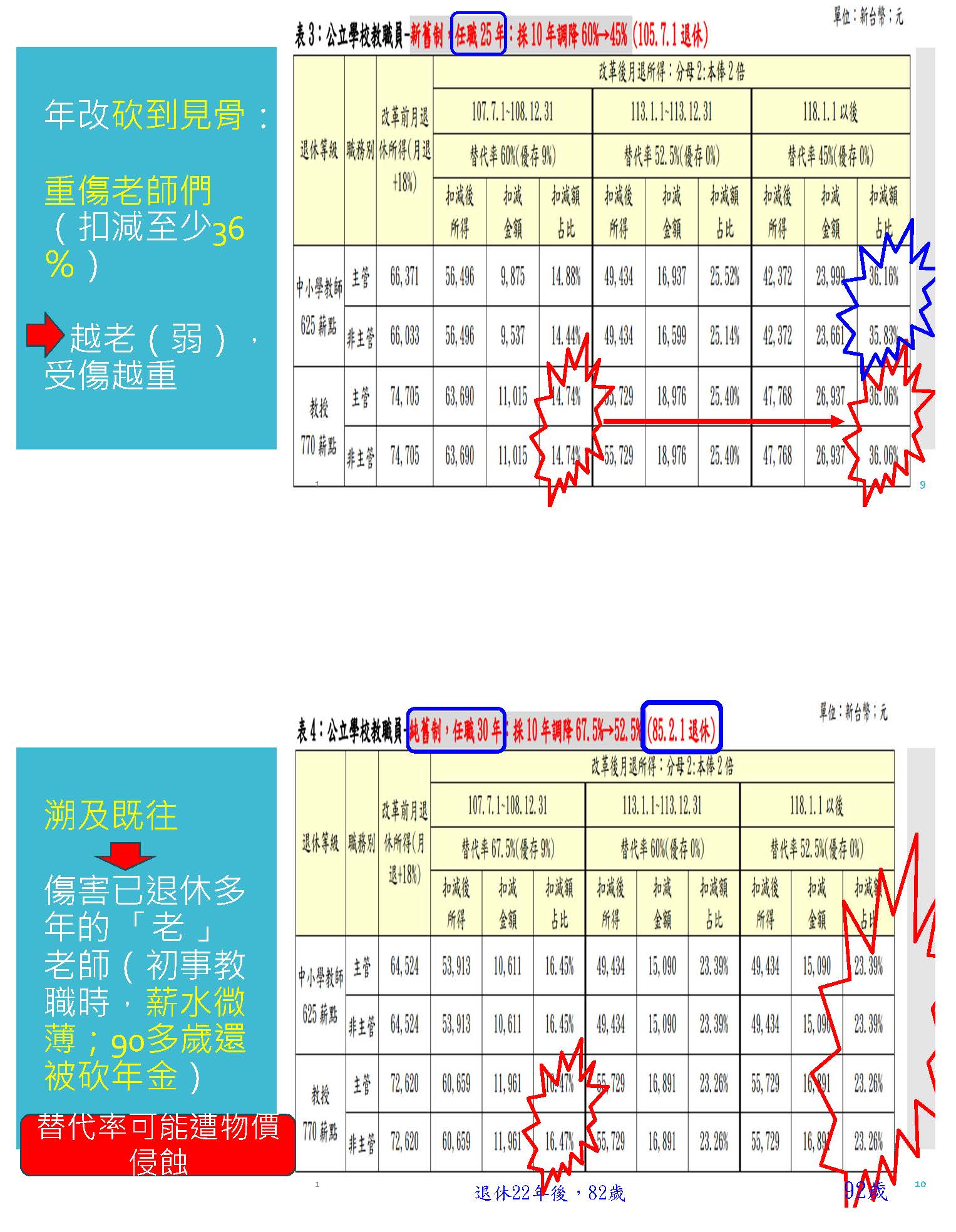 所以在上次年改三讀通過之後,教育部自己在106年6月30號就根據上述的三降去計算對教師產生的衝擊,各位從這個表可以看到,第一個,他真的是砍到見骨,重傷老師們,扣減了至少24%,尤其是教授,105年2月1號退休的老師,他任職35年的話,假設他是65歲,兩年後他的退休金就被砍了21%,到75歲的時候就被砍掉了37%,這個教授是這樣子的情形。我們再來看另外一個情形,假設105年2月1號退休,任職30年的老師,也是退休兩年就被砍了21%左右,到他75歲的時候被砍了38%,將近40%的退休金被砍了,所以越老越弱的時候受傷越重,10年後更老的時候被砍到38%。再來看下一個表,這也是教育部自己做的,一個任職25年,假設他是105年7月1號退休,他退休兩年就被砍了15%,退休10年之後,他被砍了36%,越老弱被砍得更兇。更可怕的是,假設一個老老師他85年就退休,到107年年改的時候,他已經退休22年,他82歲的時候,他的退休金突然就被砍了16%,82歲的老人非常需要錢,棺材本就被砍了16%,然後10年後到他92歲的時候,他的退休金又被再砍了23%,所以這個真的是虐殺老人。我們再來看下一個也是一樣,一個很早以前就退休,他剛當老師的時候,薪資非常微薄,所以才有18%,然後三砍的結果,溯及既往又加上替代率遞減,這個就是違反人性!各位可以看到,像一個退休22年之後,82歲的時候被砍了快20%,到他92歲快要死的時候就被砍了36%,連遺族要領年金都幾乎領不到。所以從教育部當初自己準備的資料,我們就可以看到年改確實對公教人員,尤其是教授產生很大的衝擊。