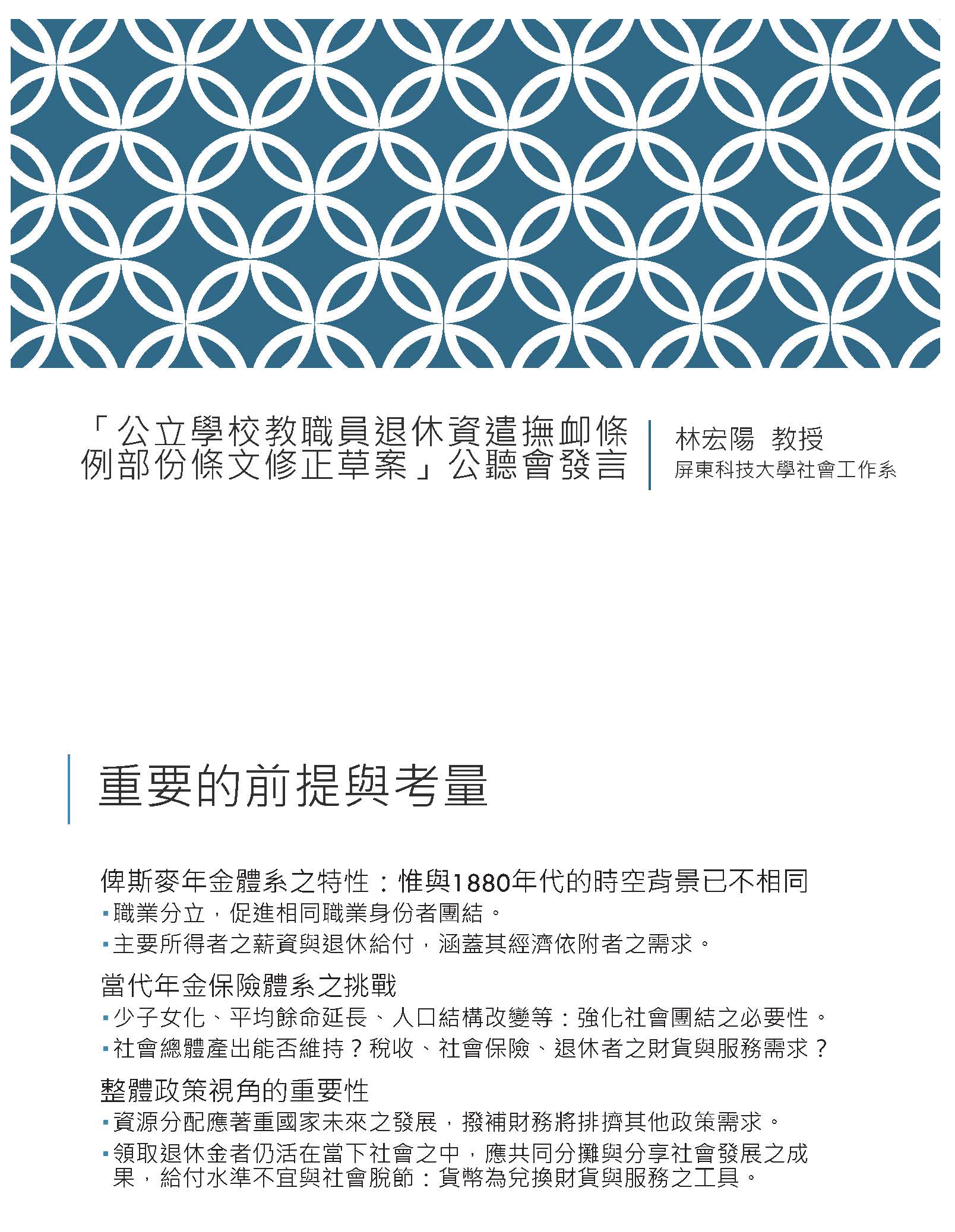 主席:謝謝。從今天的討論提綱可以知道我們這次召開公聽會,最重要的就是討論教職人員退撫條例裡面涉及到有關於退休金逐年遞減的法案需不需要重新再修法,以及退休金要不要隨著物價通膨指數來做例行性的檢討,針對這兩個主要的議案,請各位專家學者來發表高見。
