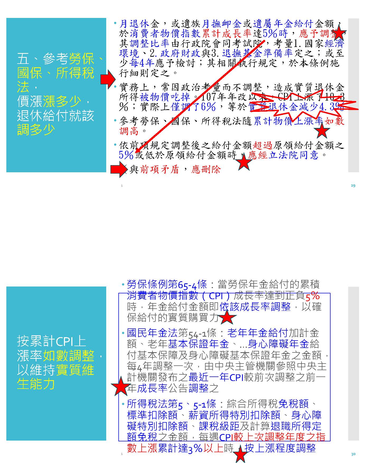 我們就來看一下勞工保險條例是怎麼樣規定的?當消費指數累計成長率到5%的時候,就依該成長率調整之,也就是依該成長率核實調整,而國民年金跟老農津貼都有相同的規定;可是反觀公務人員退休資遣撫卹法第六十七條就還要考量國家經濟、政府財政,簡直就是要過五關斬六將,非常的不公平!