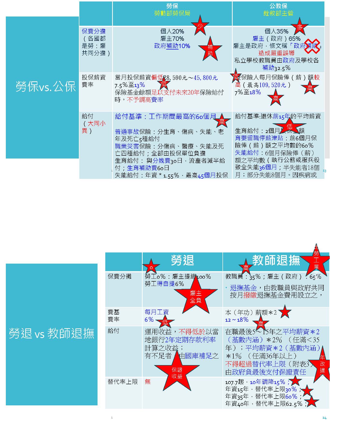 所以接下來,我就用勞保跟公教保、勞退跟公教退撫兩個制度做一個對比。從勞保跟公保的對比,各位可以看到左邊的資料,在保費分擔的部分,勞保的勞工,個人只要出20%,雇主出70%,政府跟勞工一點關係都沒有,還補助10%;可是公教保呢?我們各公務員或老師,個人要負擔35%,比勞工負擔20%還要多,作為雇主的政府,這個慣老闆只負擔了65%,然後我們不知道銓敘部哪一個笨蛋,就在公保條例裡面他竟然說政府出的錢叫做「政府補助」,這難怪人家就說:你這個公務員、公教人員怎麼那麼好康啊!政府給你補助。搞清楚政府是雇主,相對於勞工的雇主要負擔70%,而政府作為公教人員的雇主只負擔65%,還要幫勞保稱做政府補助。所以這個是很笨,請翁召委注意一下,這個條文將來一定要把它改掉,否則以後都被那些沒良心、沒良知的政客拿出來污衊公教人員。