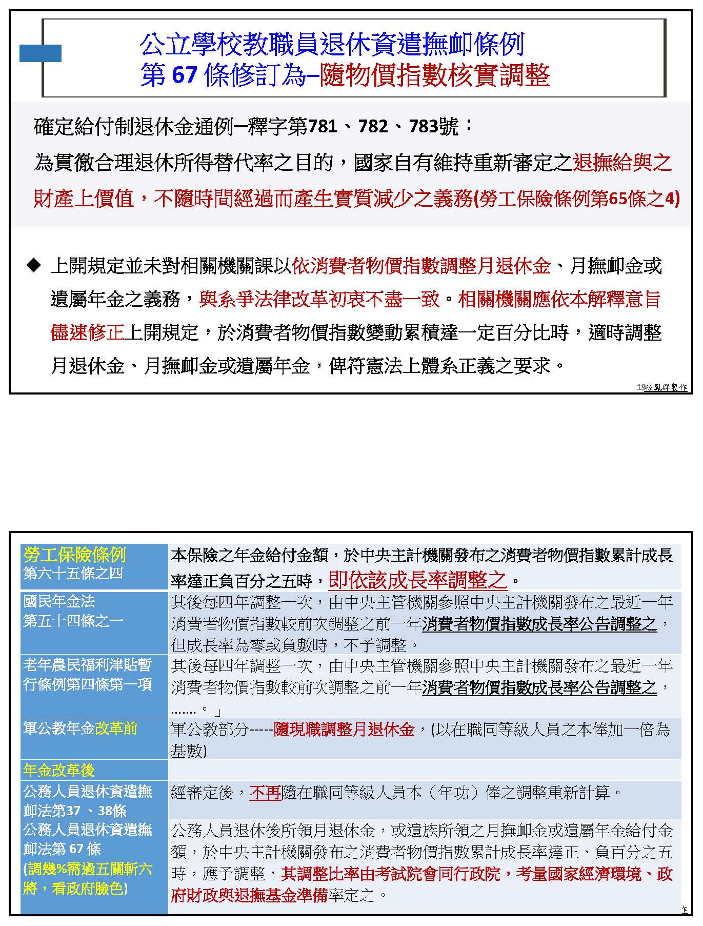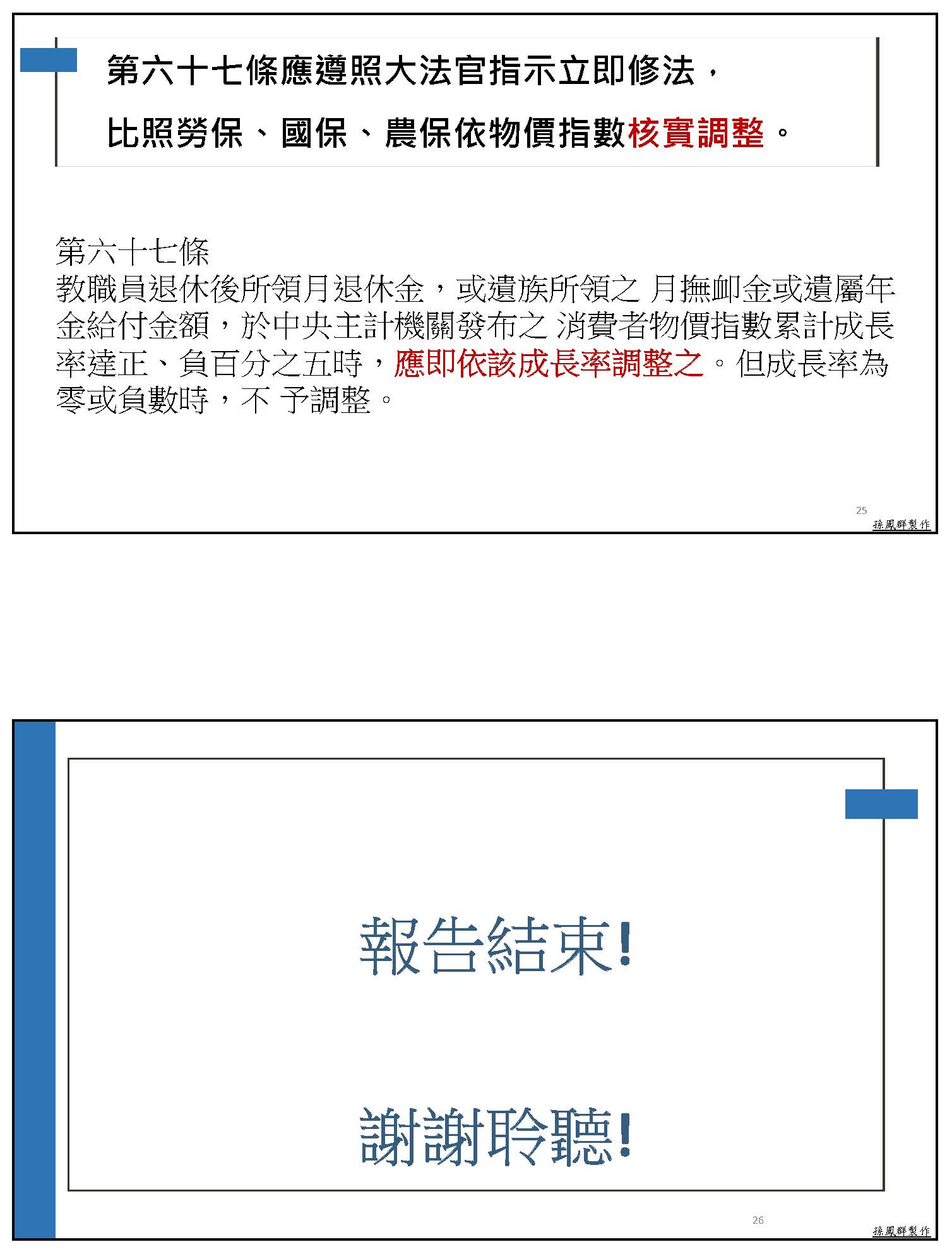 既然有大法官要求立法院應該即刻修法,所以我們就拜託委員們能夠即刻幫我們修這一條法令,還有其他職業別都有隨消費者物價指數調整的現行條文作為類推原則的適用,所以我們的第六十七條應該也可依相類似的法令做類推原則的適用。就像我剛剛舉例的,已經形成差別待遇、以後還會再擴大,這個是違反行政程序法中非有正當理由,不得為差別待遇的規定。所以我們強烈主張第六十七條應該遵照大法官指示立刻修法,比照勞保,當消費者物價指數達到5%的時候應該立即依照該成長率核實調整之!我的報告到此結束,謝謝大家。