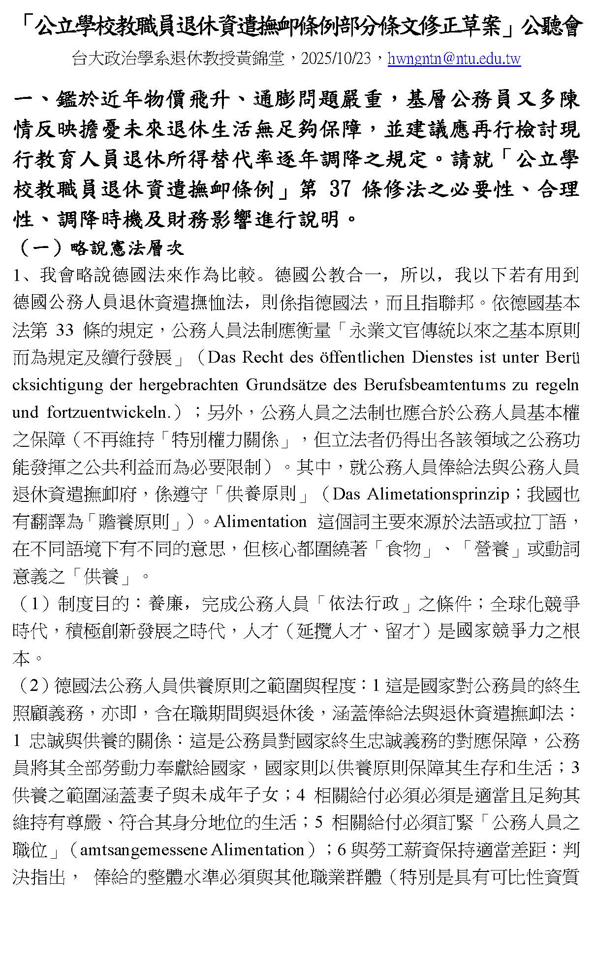 首先,在談到年金、月退休金的高低,我們還是要講到一些憲法上的原則,那我們憲法上的原則可以和德國法做比較,就是供養原則(alimetationsprinzip),簡單講,就是公務人員在功能上的定位是執行我們整個國家的法律,那麼法律的執行就代表我們整個國家的體制能夠確實運作,而這個法治國能夠落實就代表我們民主才能夠落實,我們透過民主、透過選舉選出議員組成國會,然後制定法律,整個國家的意志就是經由公務人員執行法律來實現,所以他跟整個法治國、跟整個民主國是息息相關的,尤其是在這個巨變的時代,甚至也可以說他跟國家的競爭力具有無比的、直接的關聯性,所以我們對於公務人員俸給的法制跟退休、資遣、撫卹的法制應該要遵循所謂的供養原則。