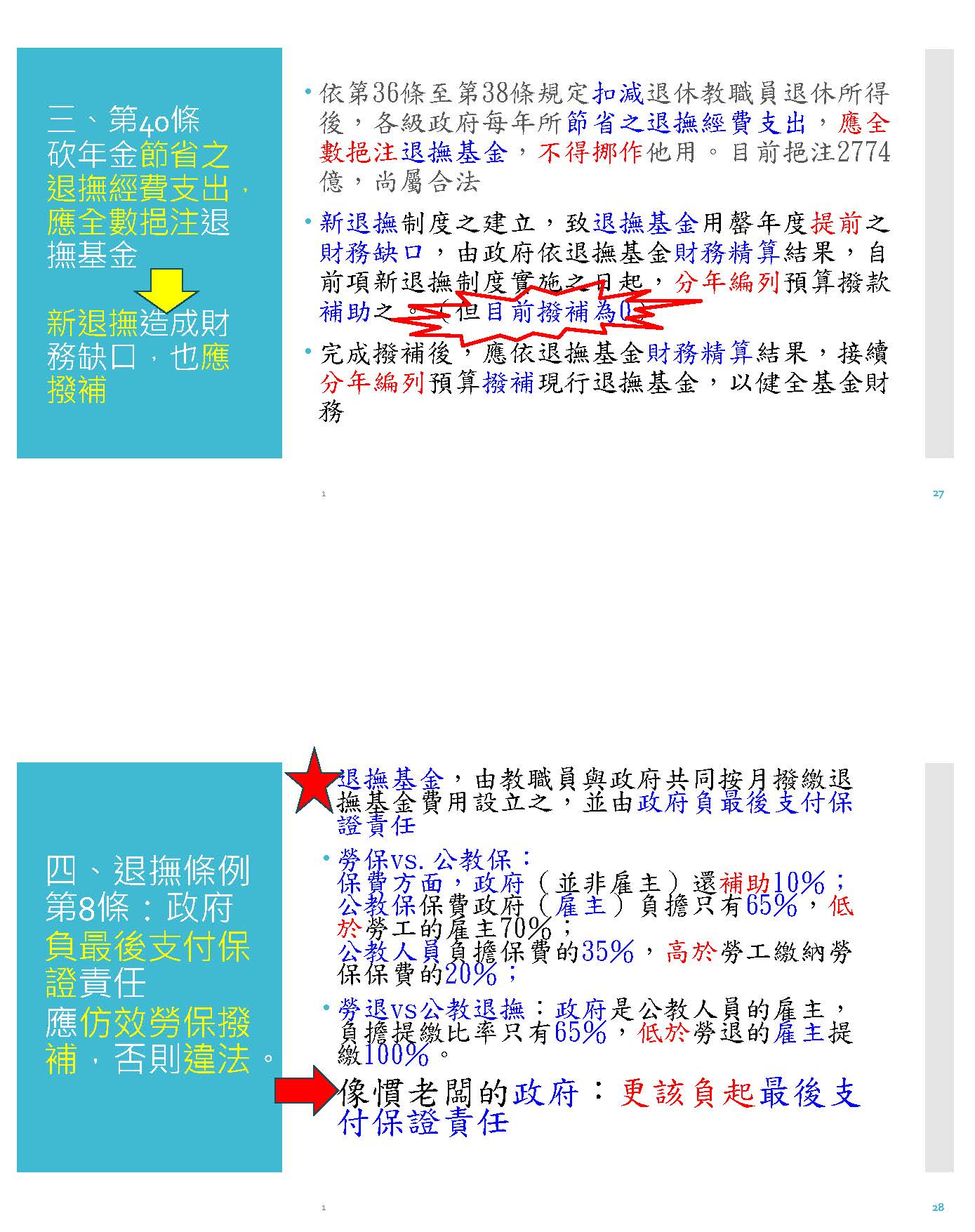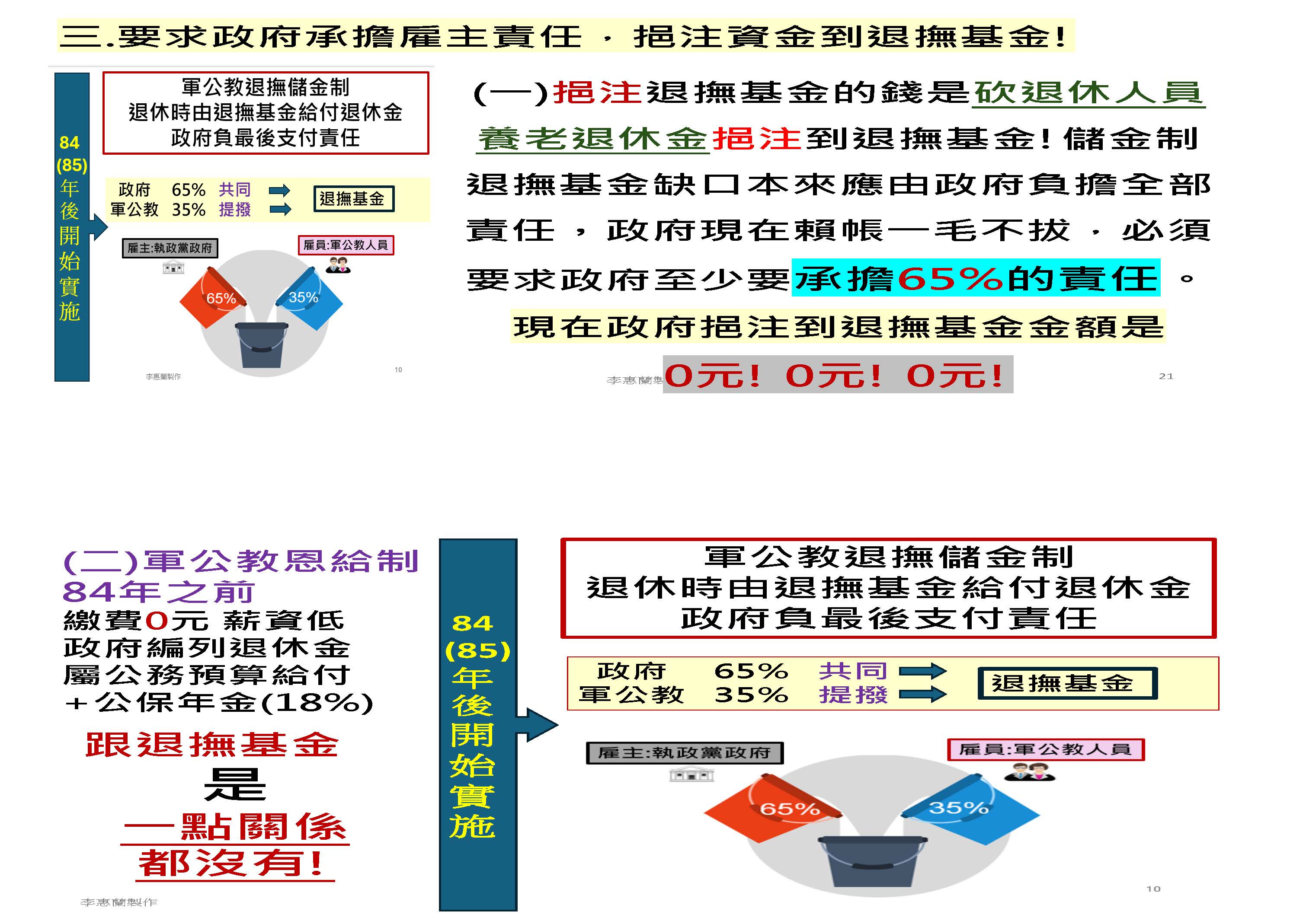 我就直接來說明,依據公立學校教職員退休資遣撫卹條例第八條規定,退撫基金是由教職員跟政府共同撥繳月退撫基金,並且由政府負最後支付保證責任,這個法律義務非常清楚,按月政府應該要撥繳65%,而教職員繳付35%,這也非常清楚。政府不思進取,面對該撥補65%的責任一拖再拖,甚至完全沒有撥補,放任舊基金到現在完全沒有撥補,每年都以複利的累積速度擴大,最後再讓全民為政府這個慣老闆不負責任買單!