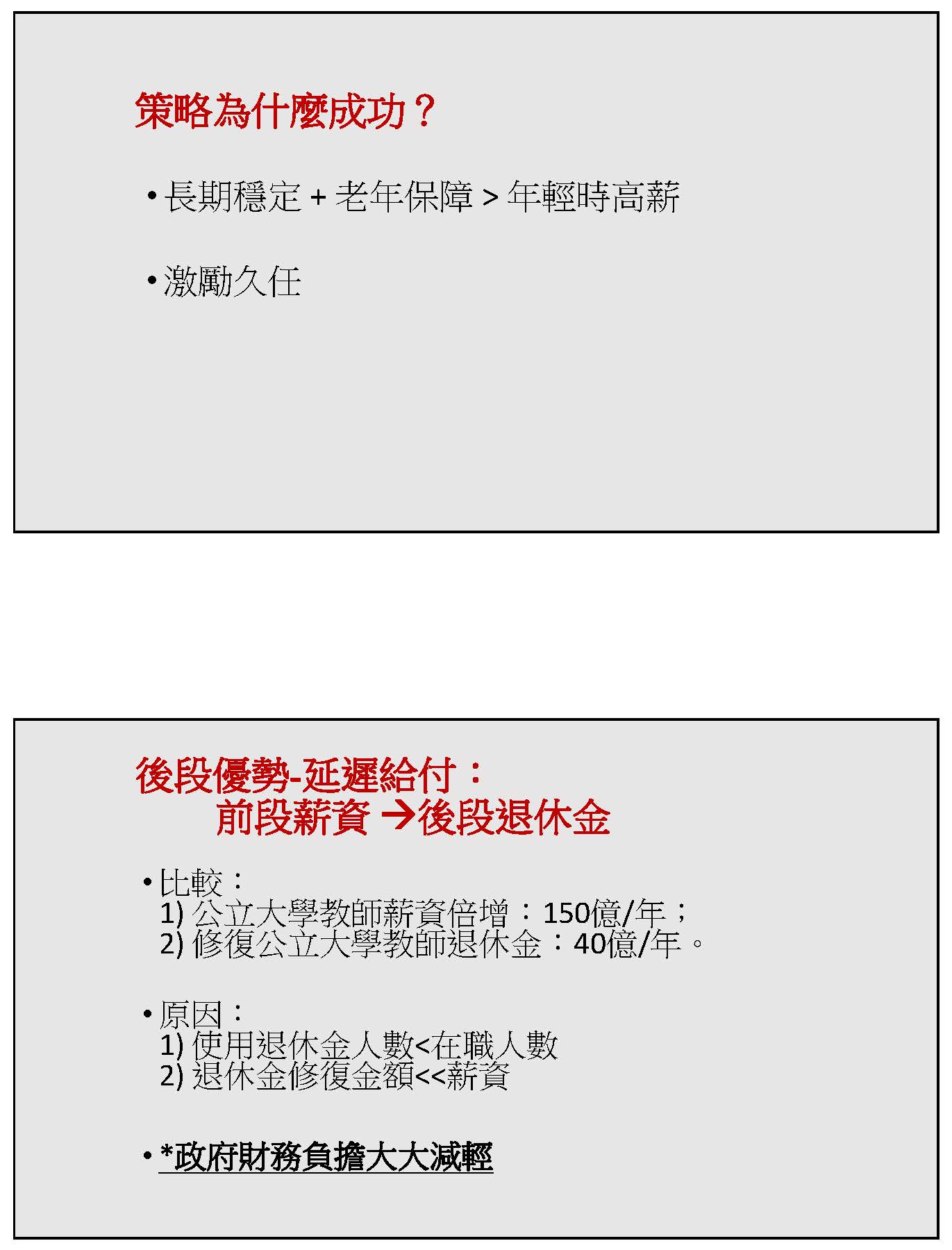 關於後段優勢的機制,簡單來說,第一個部分就是延遲給付,這是文言文,白話文就是把前段的薪資挪到他退休以後再給他。比較公立大學教師薪資,如果我們要做最低限度1倍的落差補足,以臺灣1萬5,000到1萬9,000名公立大學師資來說,至少需要每年150億以上的預算,這個顯然是做不到的事情;但是如果我們修復公立大學教師退休金,以過去的數字來看,不到40億就可以實現。而第二種作法在過去80年代到90年代證明它有相當的成效;第一種作法到現在遙遙無期。