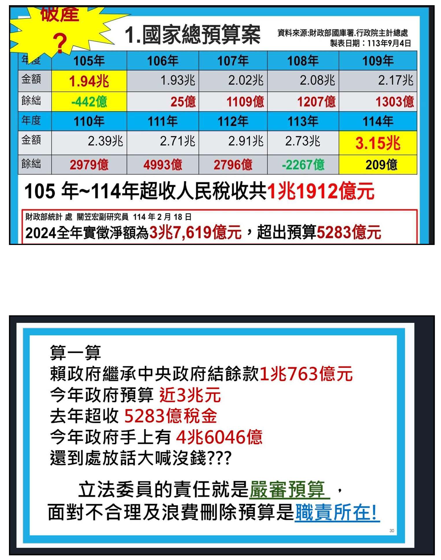 為什麼身為現職教師要聲援退休前輩呢?本來也有不少基層老師真的相信年金改革後會健全年金,讓以後退休仍然有曙光,但是後來發現,當初政府要我們共體時艱,而等國家超徵稅收、財政大好的時候,卻沒有在物價節節上漲的現在,政府也沒有要拉退休前輩一把的意思,我們可以從國家的總預算案,這個是行政院主計總處自己做的表格,大家可以看到114年3.15兆,105年到114年期間超收人民稅收共1兆1,912億元。