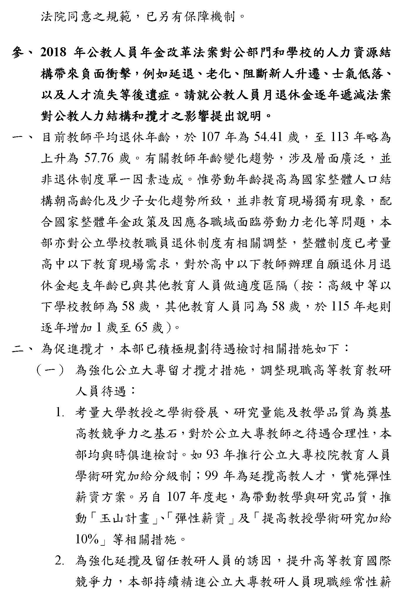 討論提綱三、有關公教人員月退休金逐年調減法案對公教人力結構和攬才的影響部分:教師年齡的變化趨勢,涉及層面廣泛,並非退休制度單一原因造成。惟勞動年齡提高為國家整體人口結構朝向高齡化及少子女化趨勢所致,並非教育現場獨有現象,配合國家整體年金制度及因應各職域面臨勞動力老化等問題,教育部亦對公立學校教職員退休制度有相關調整的規劃,對於高中以下教師辦理自願退休月退休金起支年齡已與其他教育人員做出適當區隔。又為促進攬才,本部已積極精進待遇相關檢討的措施,針對公立大專校院,自107年起推動玉山計畫、加碼彈性薪資及提高教授學術加給10%等相關措施。復於113年將助理教授以上教師學術研究加給調整15%,並再次擴大教師彈性薪資適用對象及補助額度等措施。在高中以下學校部分,除了配合行政院通案調整軍公教人員待遇,調增其經常性薪資外,亦配合擴大支領特殊教育職務加給對象及調增支給數額。