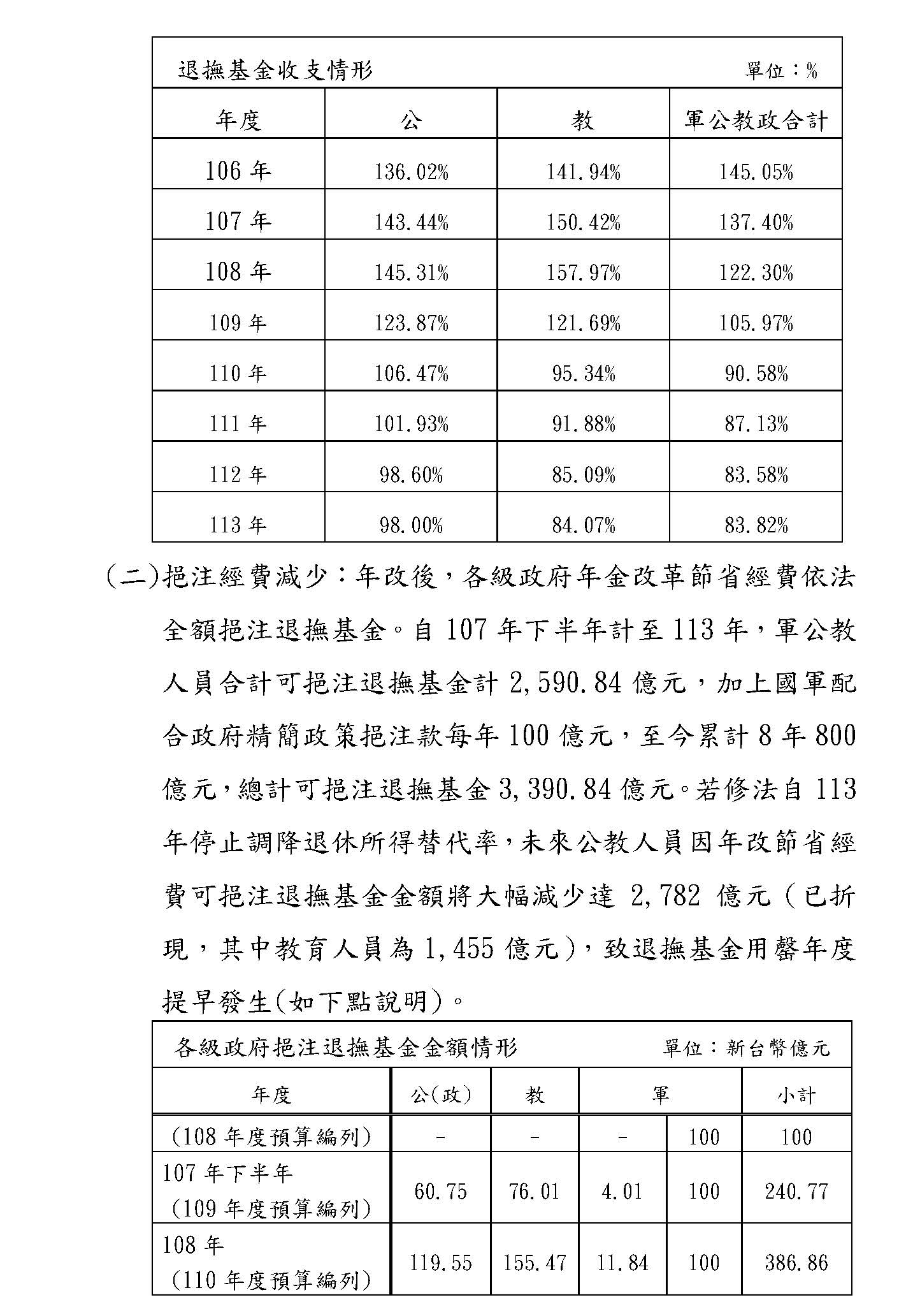 第二個,小水庫以前的經營績效確實也不好,以前大概2%、3%,有時候還是負的,大家知道嗎?最近五年退撫基金這個小水庫的經營績效變好了,過去五年平均超過9%,你現在去看看小水庫裡面的水位,105年它裡面的錢是5,785億,我剛去看了一下今年是1兆810億,水位整整成長了快一倍,所以國家財政變好了,退撫基金的經營績效也變好了,我覺得不應該再對不起我們的軍公教人員,犧牲也過多了。