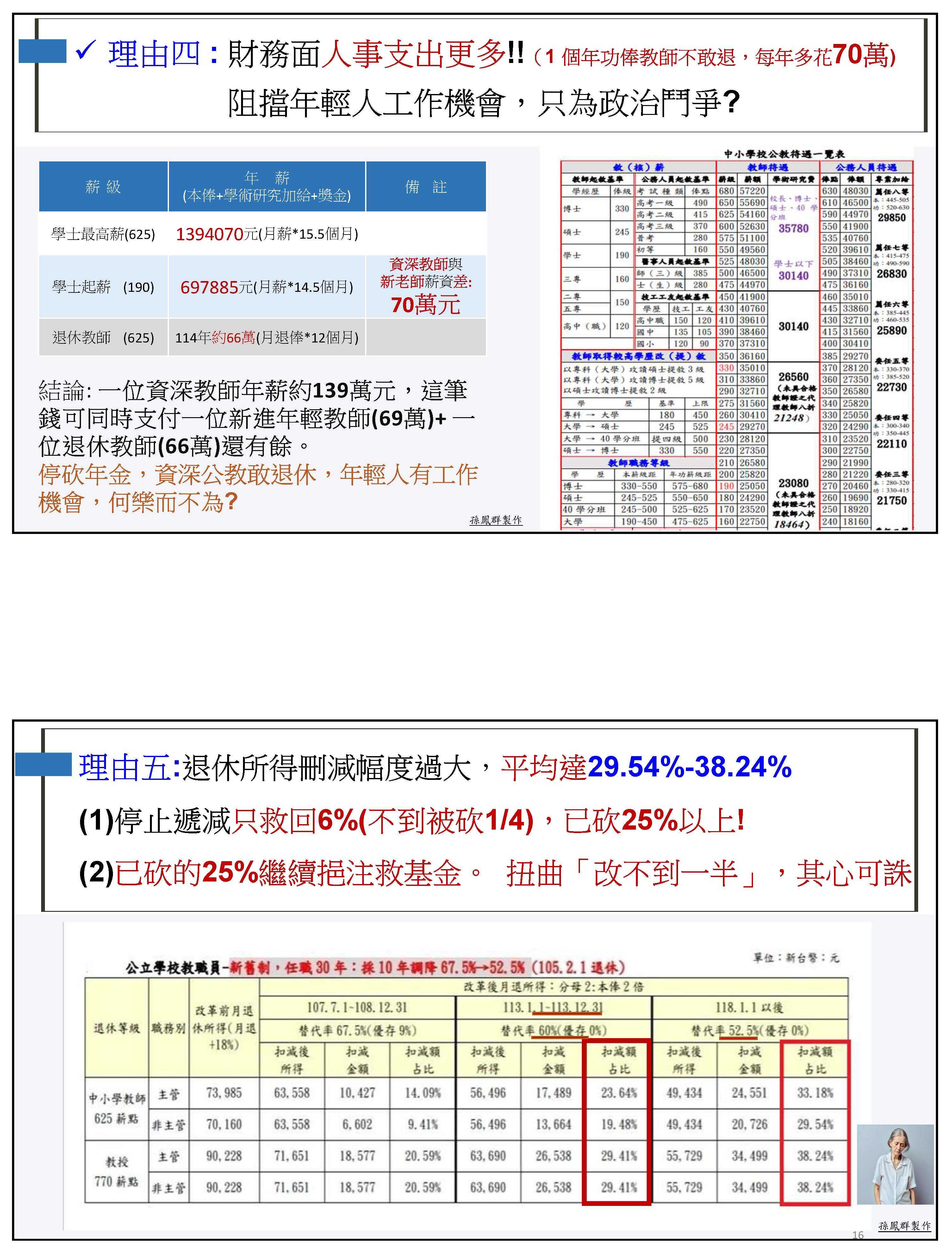 第四個理由,我常常不知道政府的算盤是怎麼打的,你讓資深老師因為退休金太低而不敢退休,這樣人事支出根本就會更多,因為一個資深老師的年薪跟新老師的年薪可以差距70萬,也就是說,一個資深老師可以養兩個新進老師還綽綽有餘,所以你這樣人事支出也沒有比較省錢,卻阻擋了年輕人的工作跟升遷機會,甚至因為退休金沒有保障,現在還在鬧教師荒,真的是莫名其妙的一件事情!