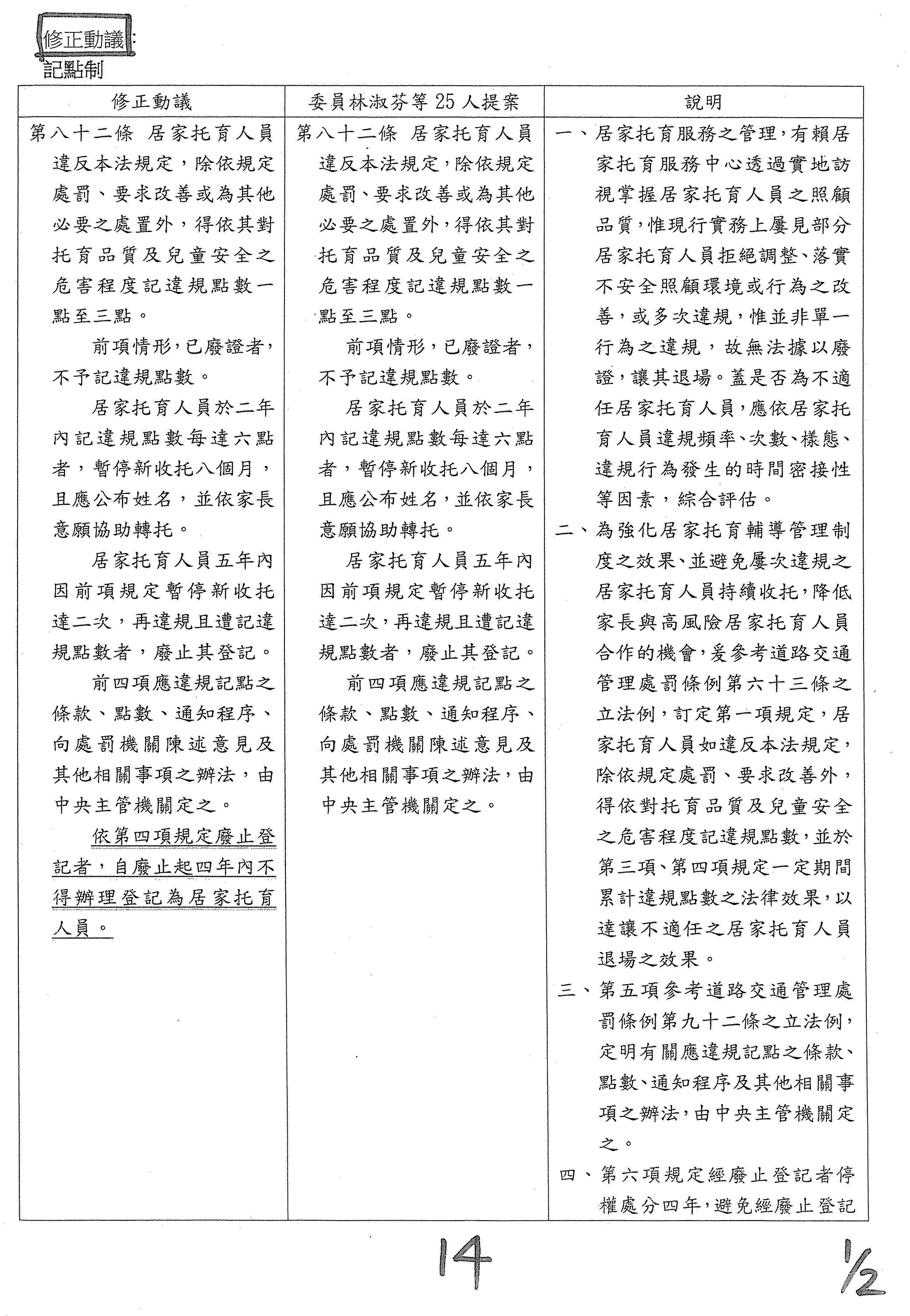 繼續審查院版第七十二條。多數委員是第七十二條,委員林月琴版本是第八十二條,王育敏委員版本是第七十七條,林淑芬委員版本是第八十三條,還有修正動議第12案是范雲委員跟劉建國委員提案,第4案是王正旭委員與張雅琳委員所提兩案修正動議,併案討論。