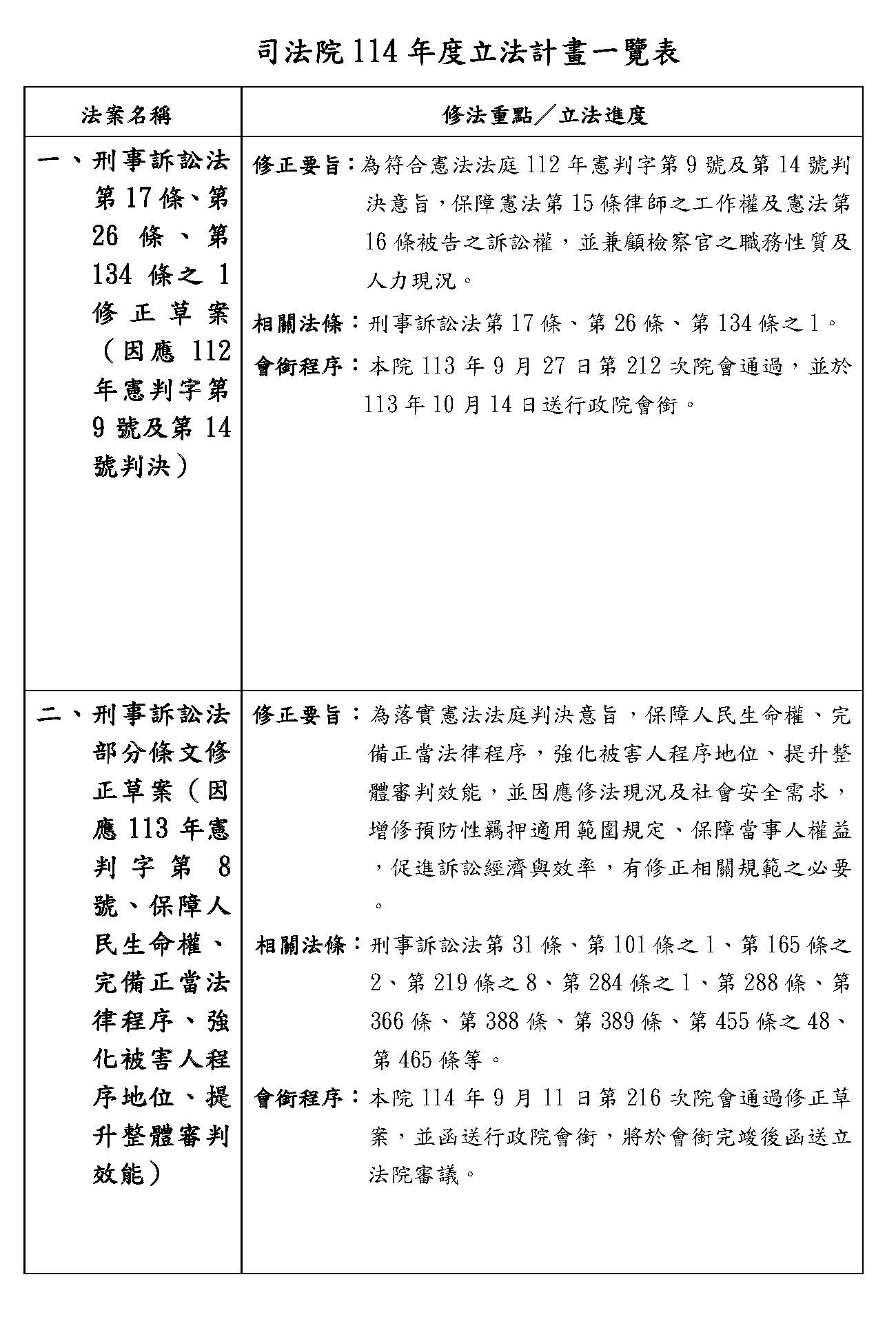 為符合憲法法庭113年憲判字第8號判決意旨,完善刑法第271條第1項、第226條之1前段、第332條第1項、第348條第1項故意殺人罪案件之刑事程序,符合憲法最嚴密之正當法律程序要求,本院已完成召開「因應113年憲判字第8號判決修法」諮詢會議,邀請審、檢、辯、學等各界代表,研議修正刑事訴訟法第31條、第101條之1、第165條之2、第219條之8、第284條之1、第288條、第366條、第388條、第389條、第455條之48、第465條等規定,以保障人民生命權、強化訴訟參與人之被害人程序地位,並因應修法現況及社會安全需求,增修預防性羈押適用範圍規定、保障當事人權益,促進訴訟經濟與效率,本院114年9月11日第216次院會通過修正草案,並函送行政院會銜,將於會銜完竣後函請貴院審議。