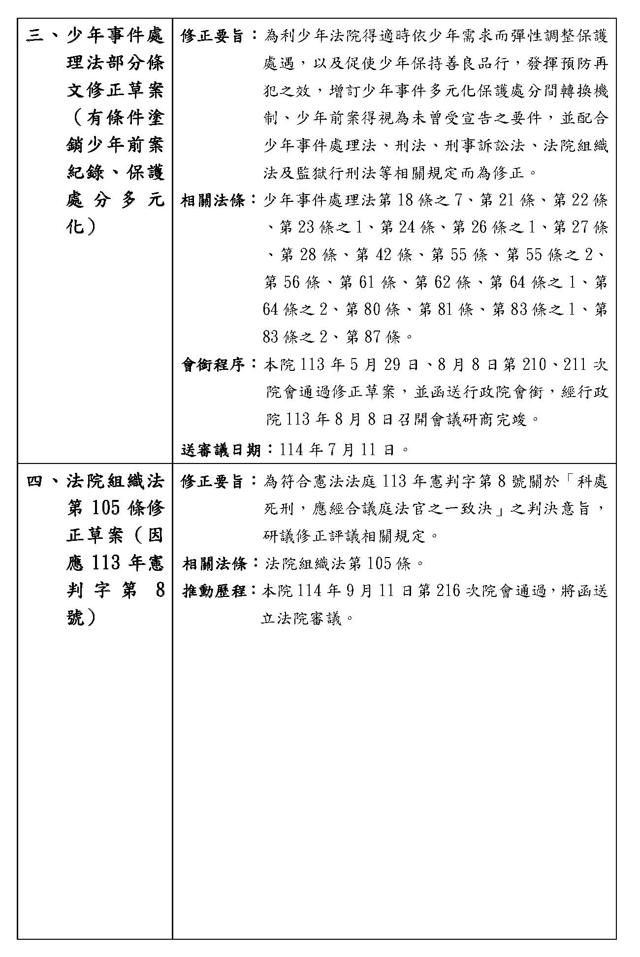 第三點,有關少年事件處理法部分條文修正草案,其中主要分為兩個部分:第一個是處遇的多元化,為利少年法院可以適時的依少年的需求彈性調整保護處遇,增訂少年法院可以視少年需求轉換保護管束、安置輔導等的保護處分機制。第二個是關於前案塗銷部分,少年前案之處分或刑之執行完畢或赦免後三年內,未再受他案的處分或刑之宣告,其前案才視為未曾受該宣告等的相關規定。