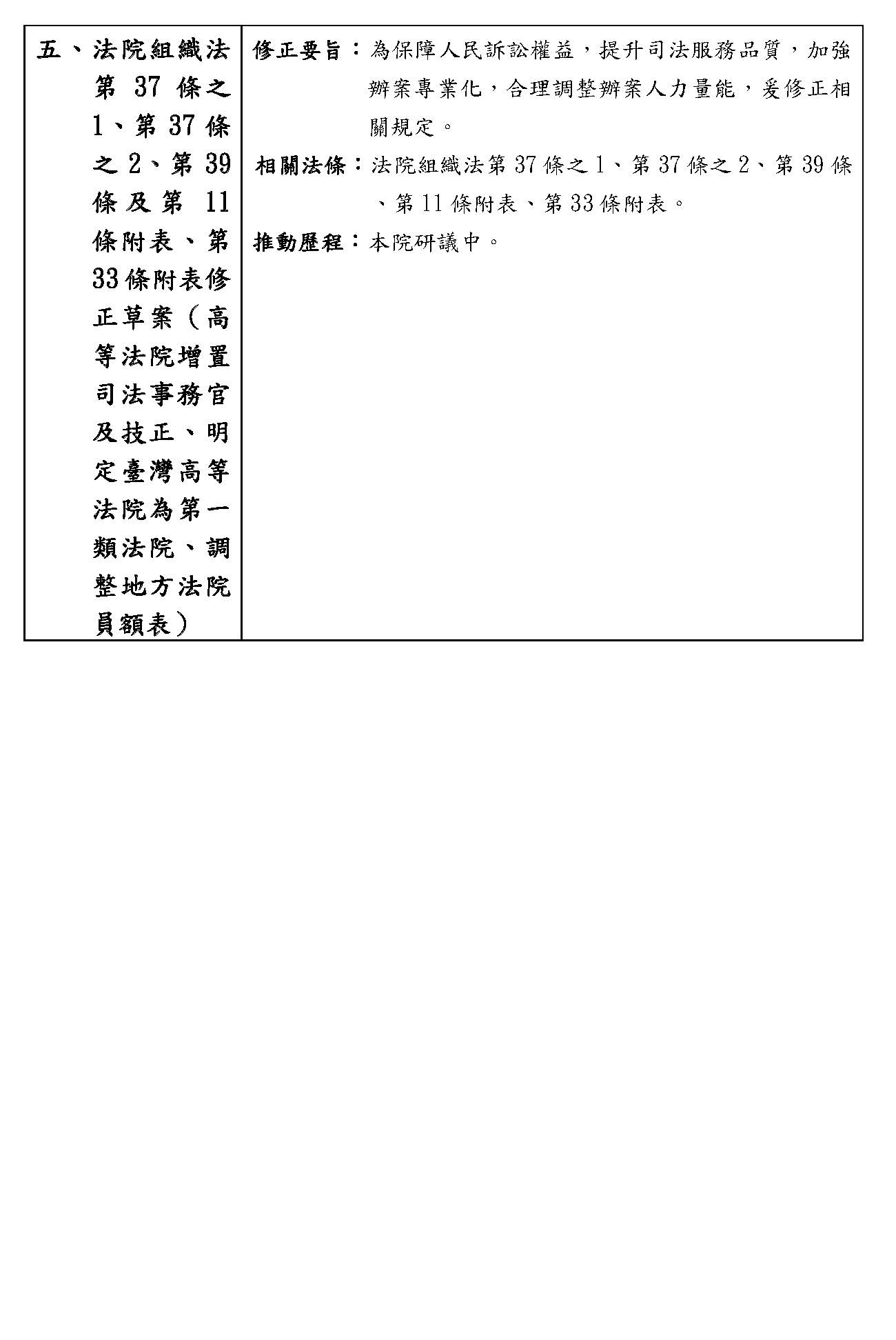 第五個是有關於法院組織法第三十七條之一、第三十七條之二、第三十九條及第十一條附表、第三十三條附表修正草案。這是關於臺灣高等法院增設司法事務官及技正,還有明定高等法院為第一類法院,並調整地方法院的員額表,使法院目前的人力運用現況跟員額表契合,減省不必要的人事調動成本。