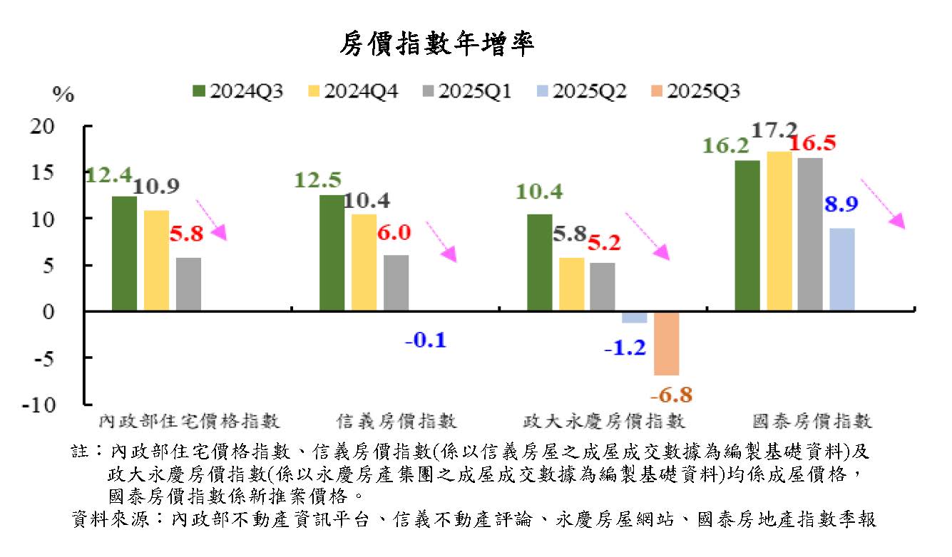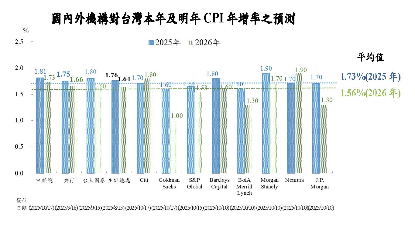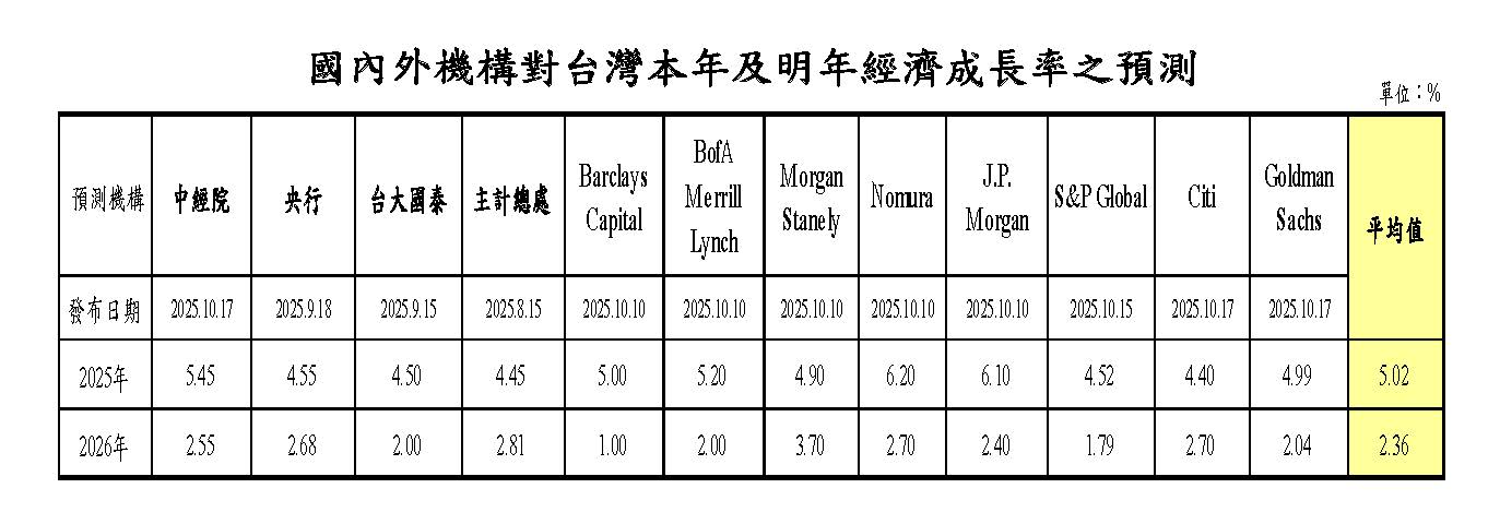 展望明年,全球貿易成長力道將因美國對等關稅影響發酵而下滑,影響台灣出口表現,加以基期較高,預期台灣輸出及民間投資成長走緩;惟民間消費成長可望回溫,本行預測經濟成長率為2.68%。主要機構對台灣明年經濟成長率預測值平均為2.36%。
